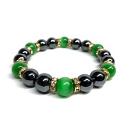 こちらは、キャッツアイとヘマタイトを組み合わせたブレスレットです。間にはロンデルを挟み高級感あるデザインに仕上がっています。石大きさは腕にも馴染みやすいように10mm玉で内周約16cm(伸可能)です。数に限りがございますので気になる方はお早めにどうぞ。