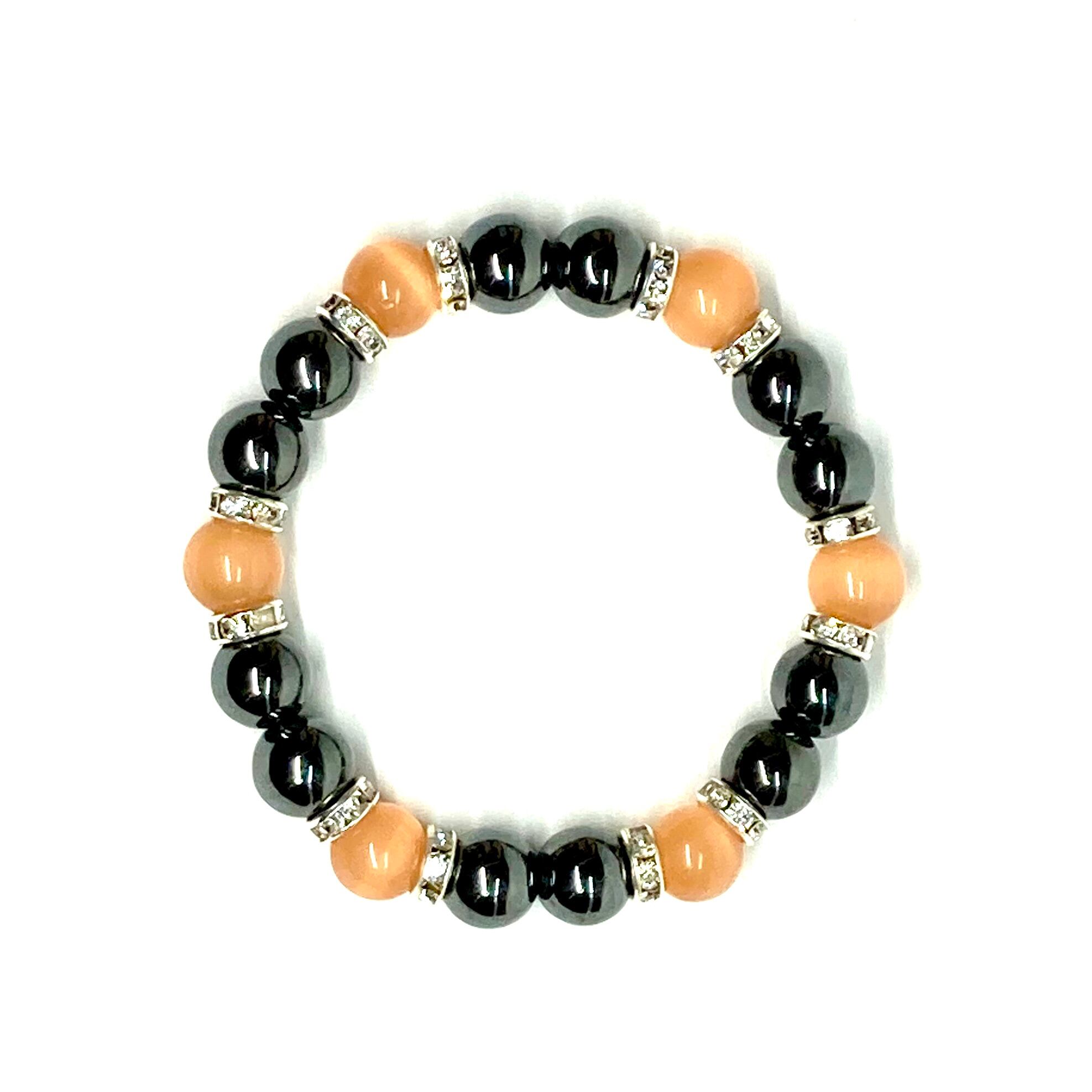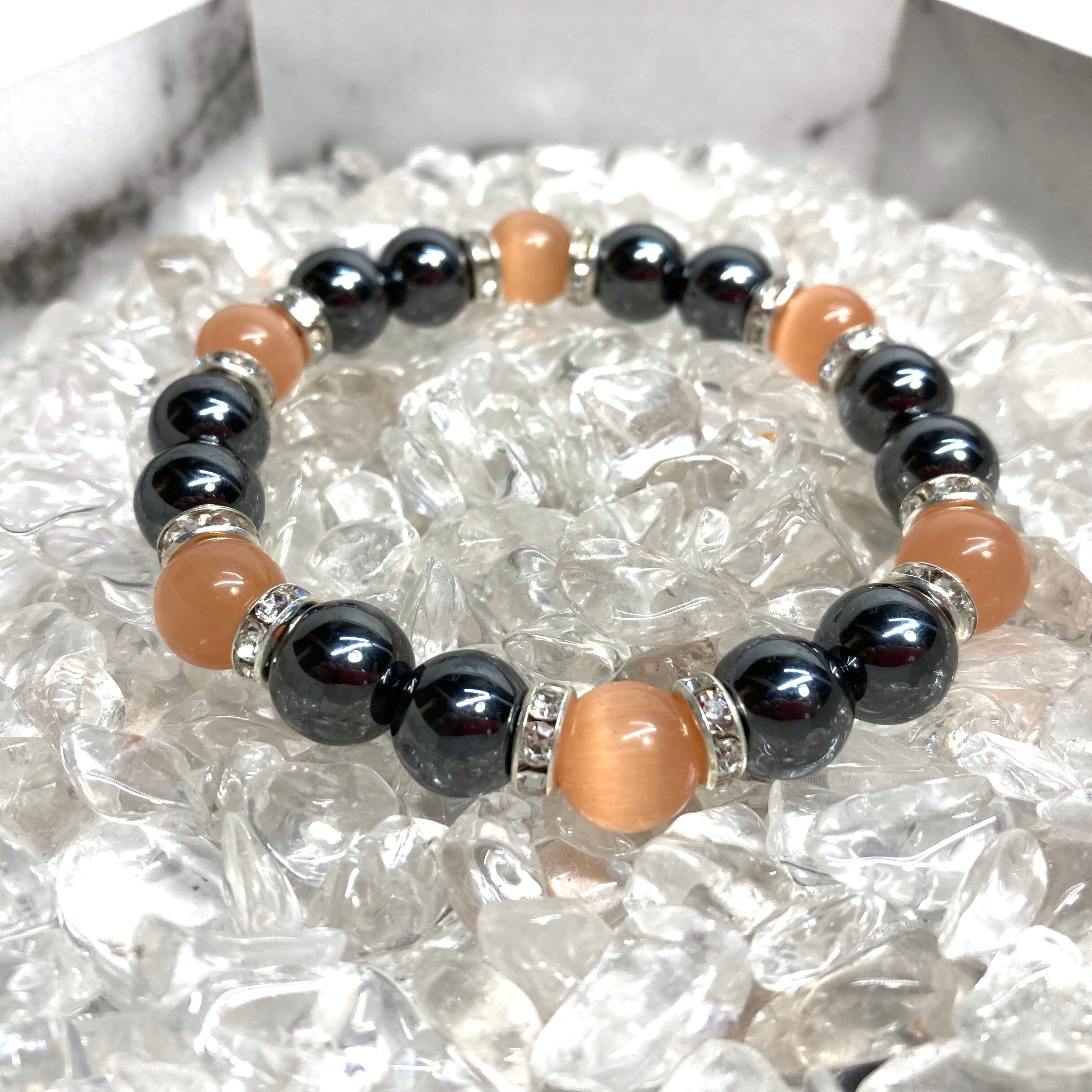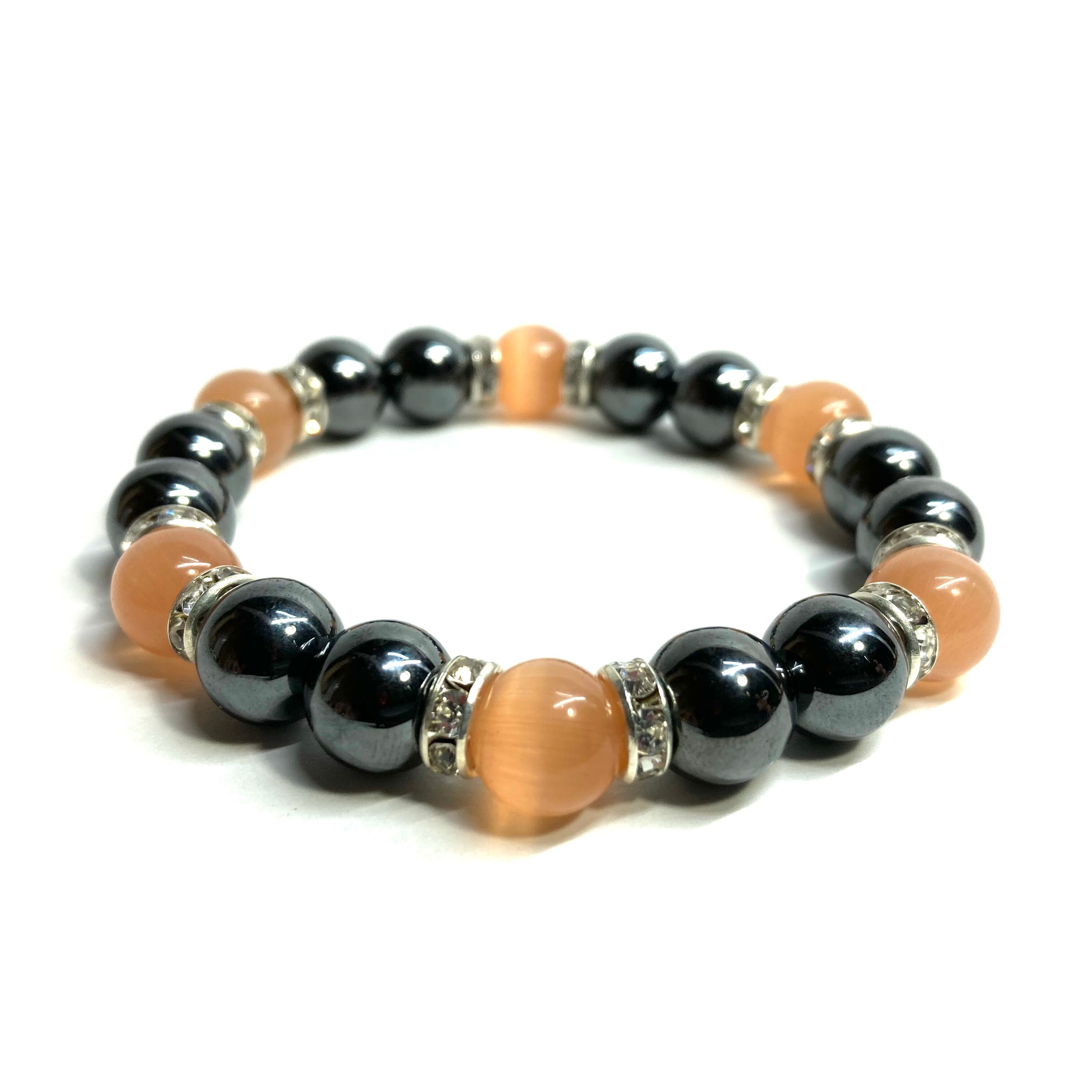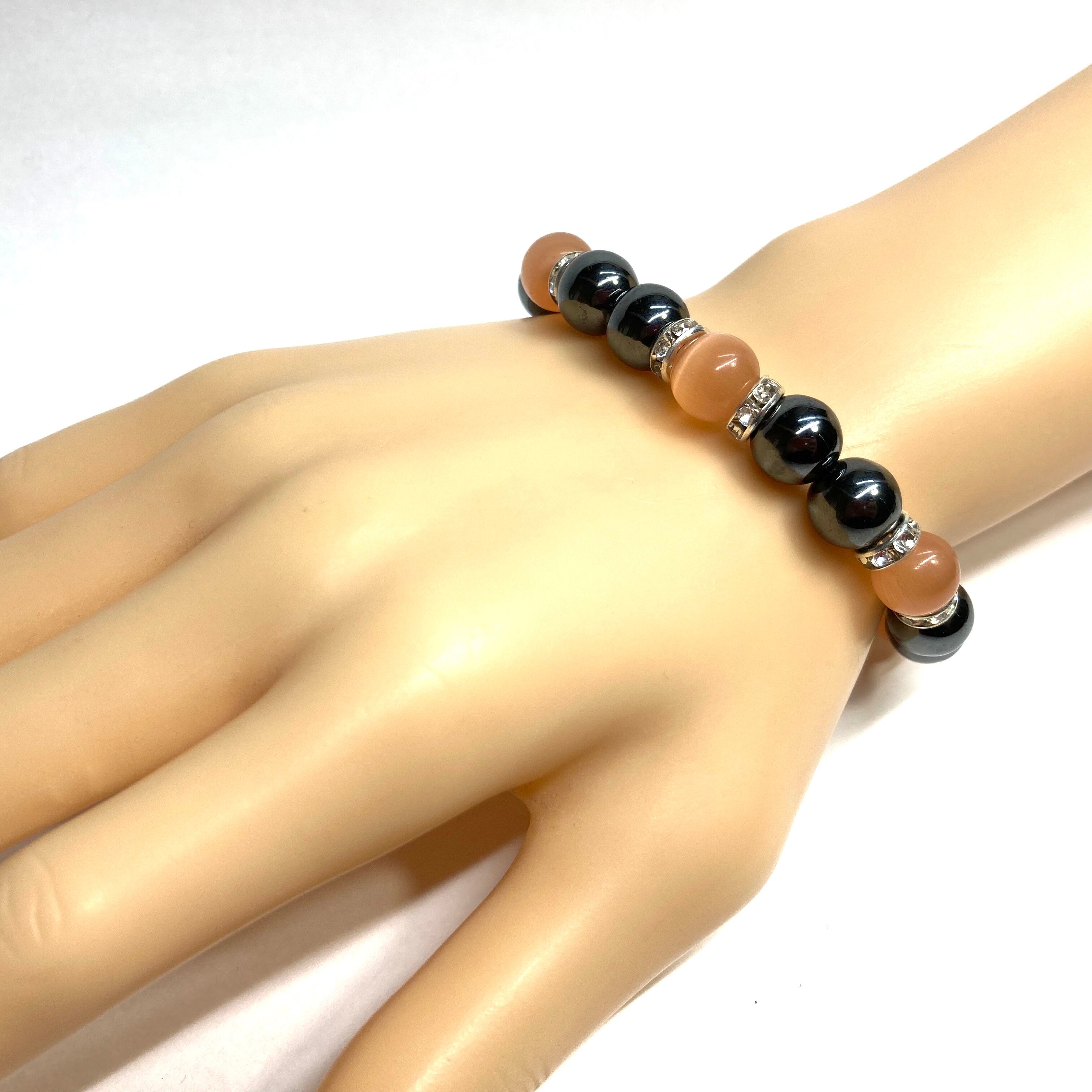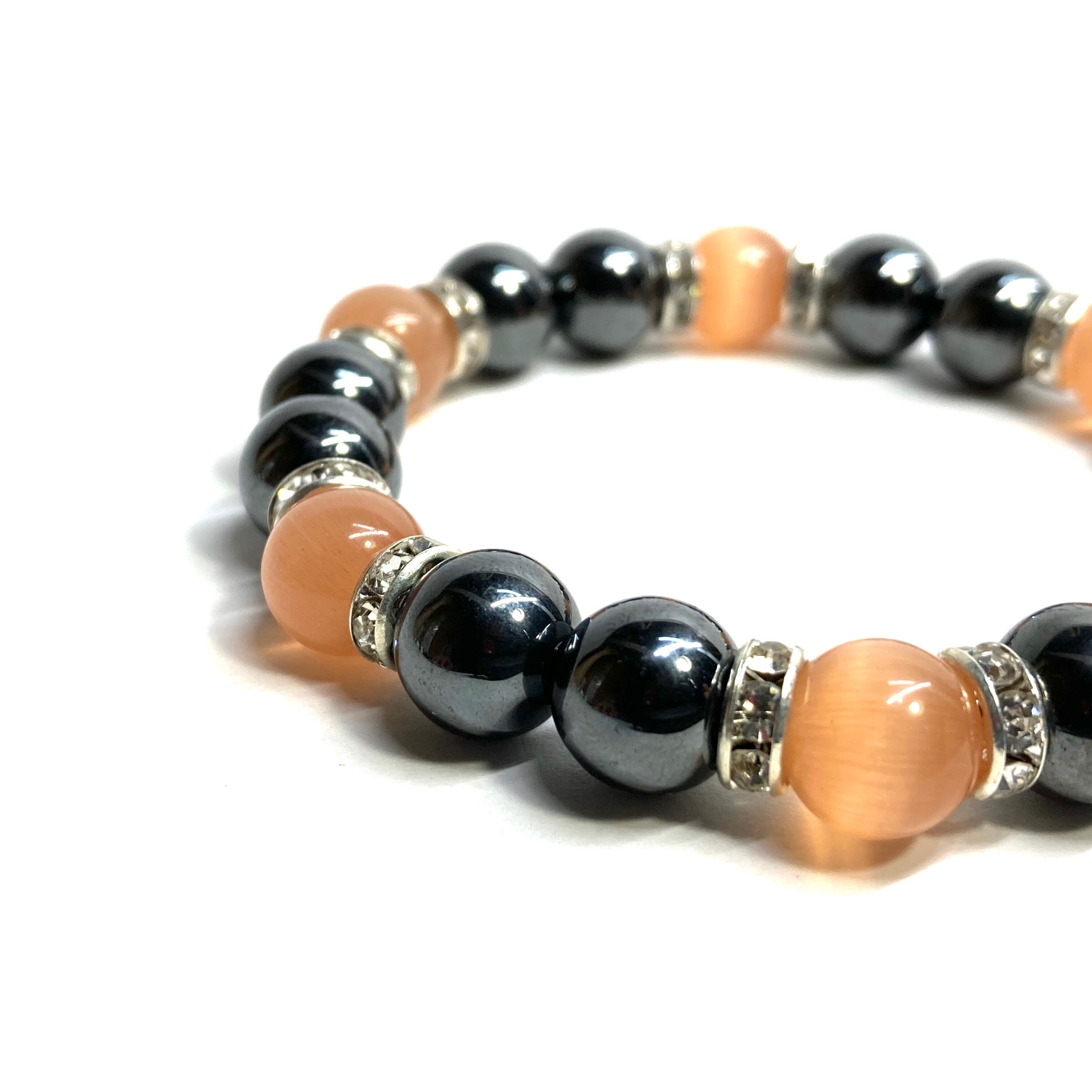 こちらは、キャッツアイとヘマタイトを組み合わせたブレスレットです。間にはロンデルを挟み高級感あるデザインに仕上がっています。石大きさは腕にも馴染みやすいように10mm玉で内周約16cm(伸可能)です。数に限りがございますので気になる方はお早めにどうぞ。