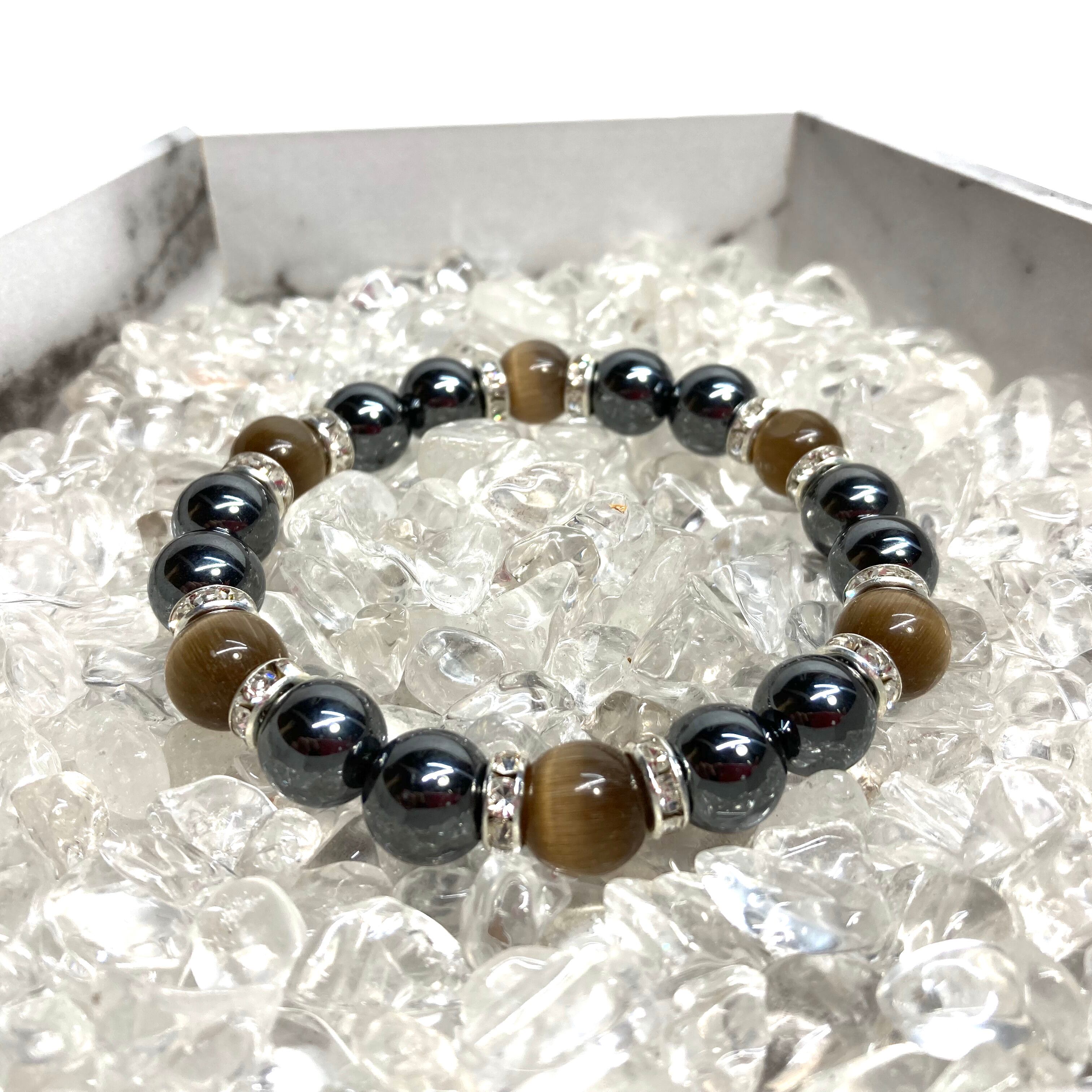 こちらは、キャッツアイとヘマタイトを組み合わせたブレスレットです。間にはロンデルを挟み高級感あるデザインに仕上がっています。石大きさは腕にも馴染みやすいように10mm玉で内周約16cm(伸可能)です。数に限りがございますので気になる方はお早めにどうぞ。