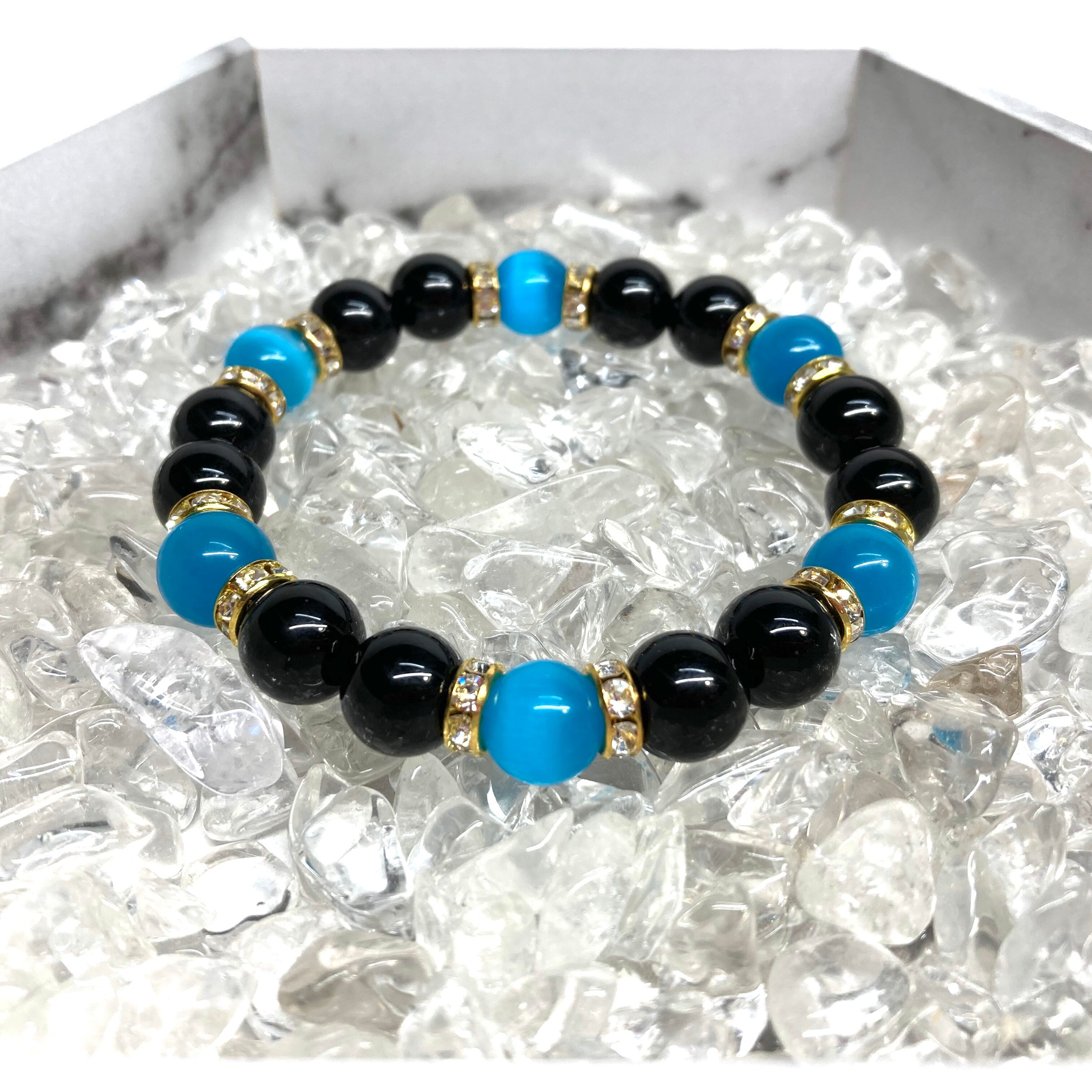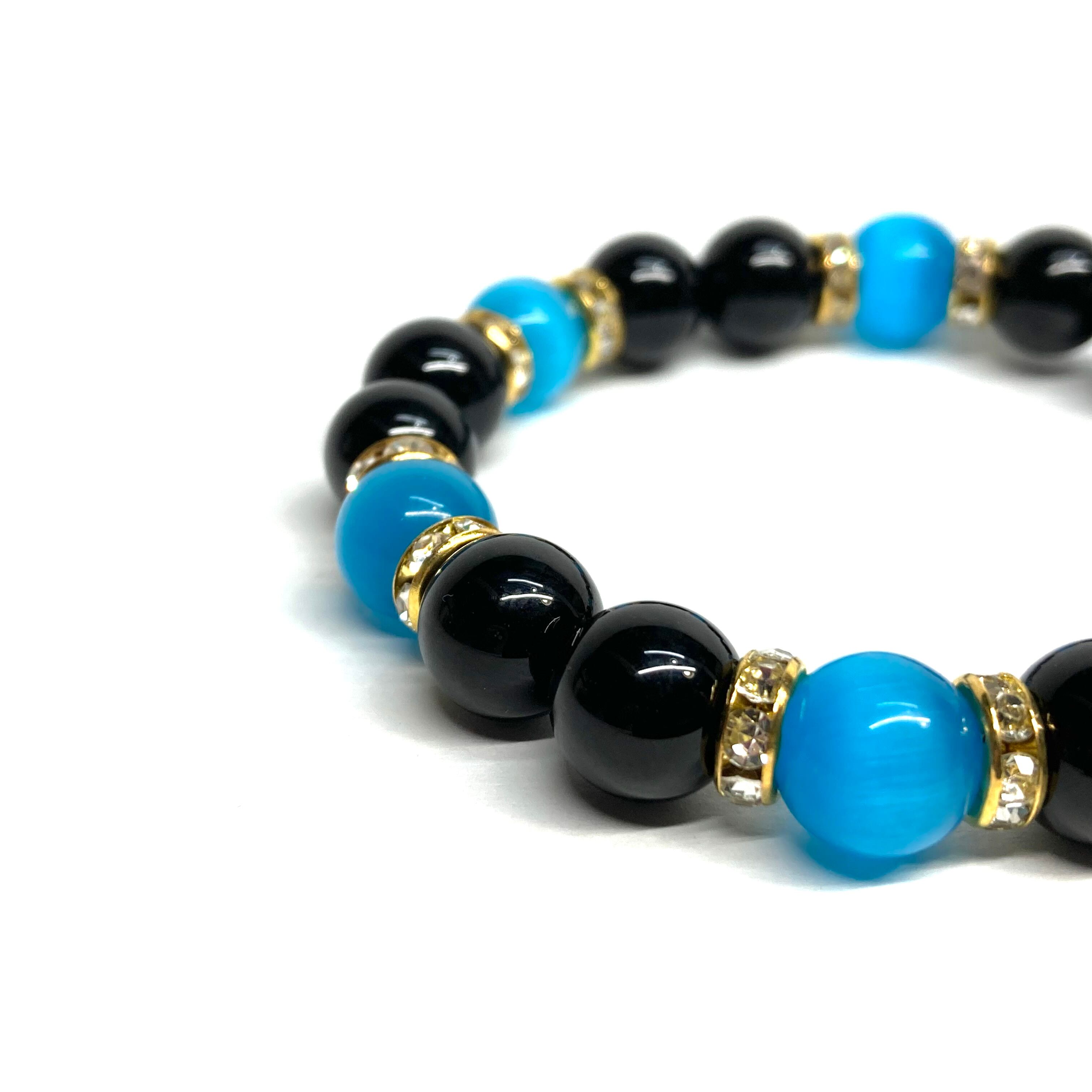 キャッツアイ(ライトブルー) オニキス パワーストーン ブレスレット (ゴールド) メンズ・レディース 男性・女性 数珠ブレス 開運