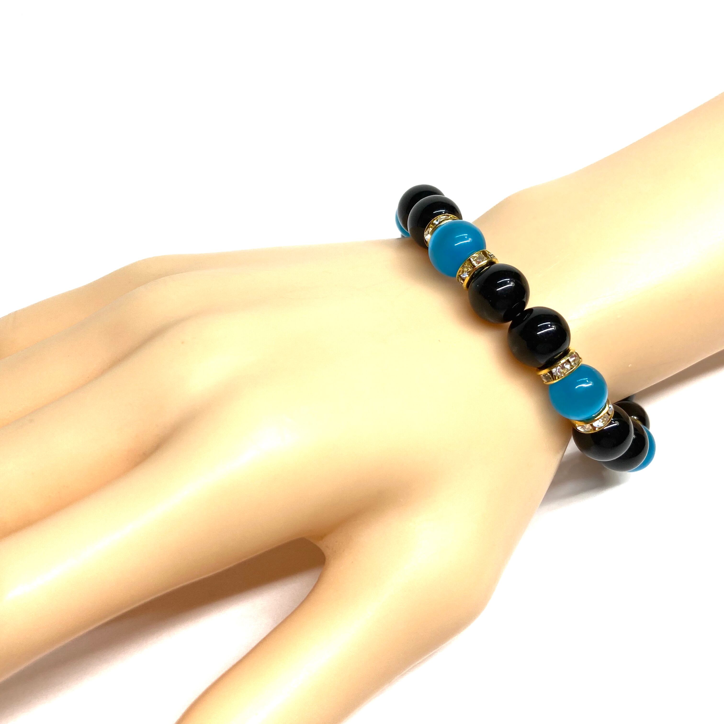 こちらは、キャッツアイとオニキスを組み合わせたブレスレットです。間にはロンデルを挟み高級感あるデザインに仕上がっています。石大きさは腕にも馴染みやすいように10mm玉で内周約16cm(伸可能)です。数に限りがございますので気になる方はお早めにどうぞ。