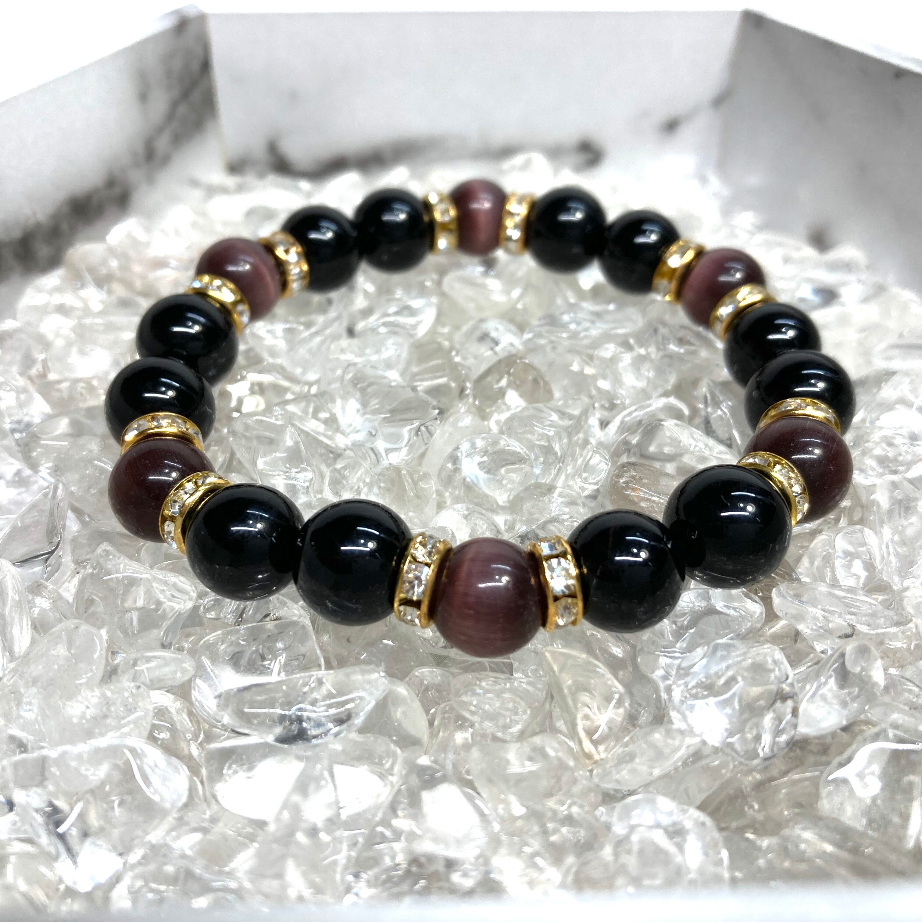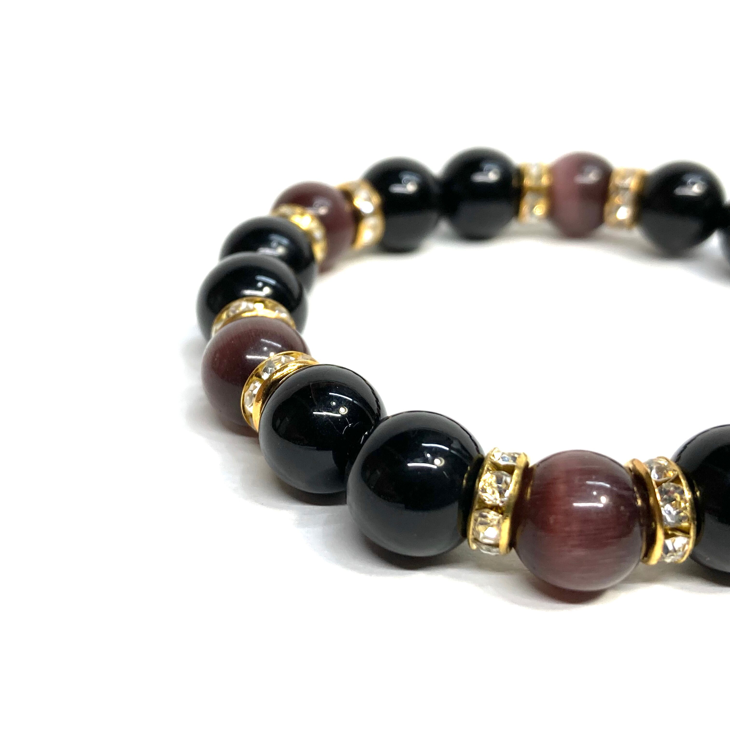 こちらは、キャッツアイとオニキスを組み合わせたブレスレットです。間にはロンデルを挟み高級感あるデザインに仕上がっています。石大きさは腕にも馴染みやすいように10mm玉で内周約16cm(伸可能)です。数に限りがございますので気になる方はお早めにどうぞ。