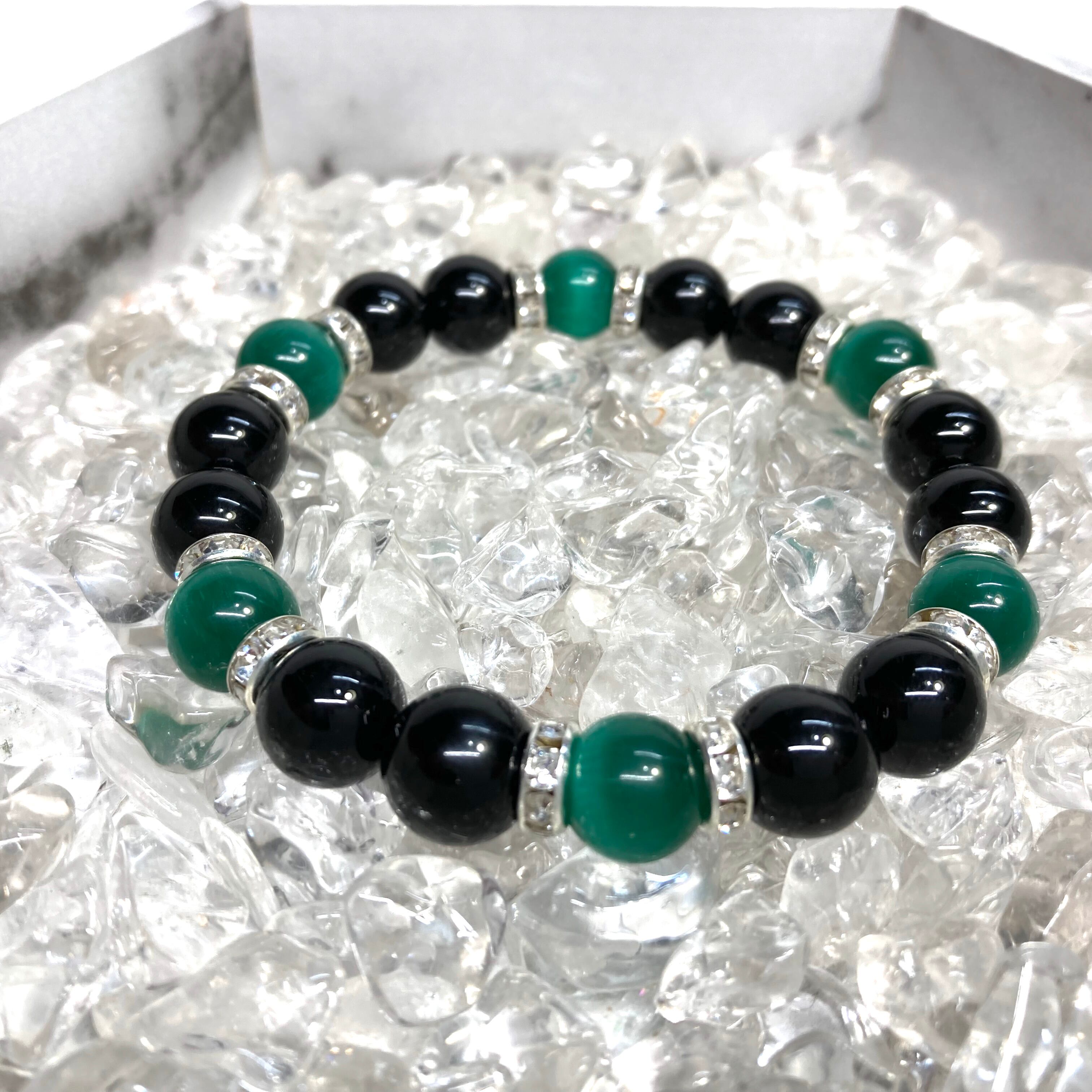 こちらは、キャッツアイとオニキスを組み合わせたブレスレットです。間にはロンデルを挟み高級感あるデザインに仕上がっています。石大きさは腕にも馴染みやすいように10mm玉で内周約16cm(伸可能)です。数に限りがございますので気になる方はお早めにどうぞ。