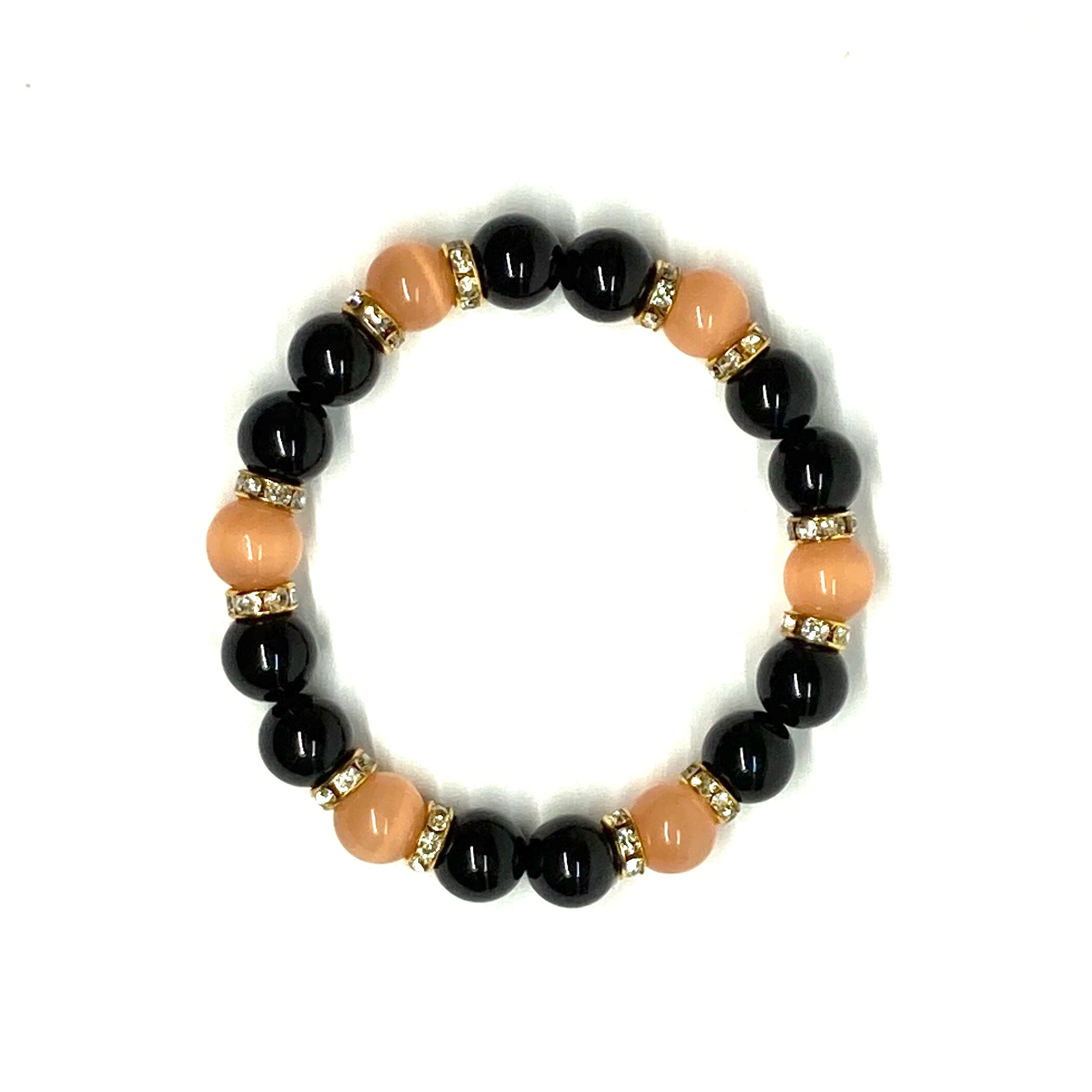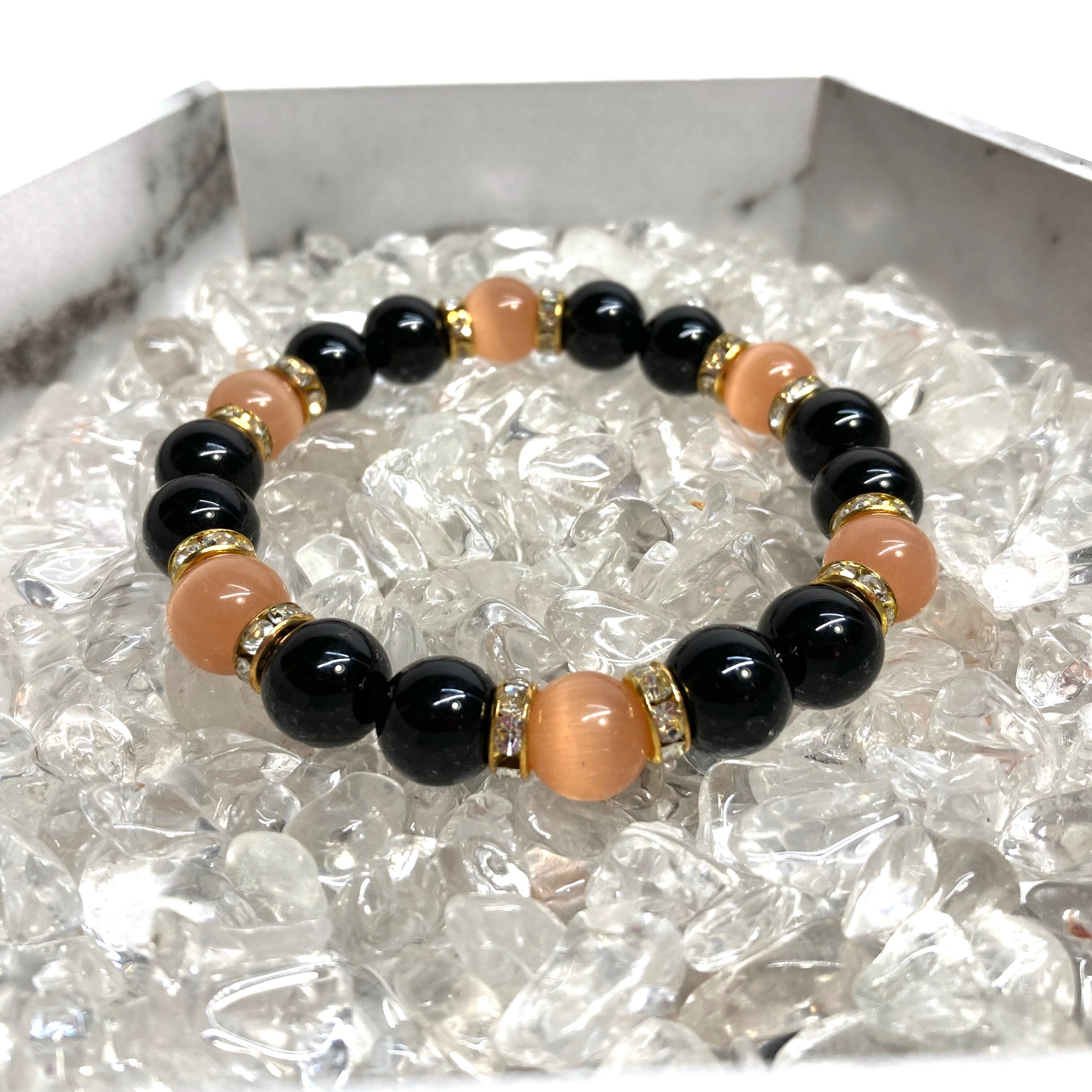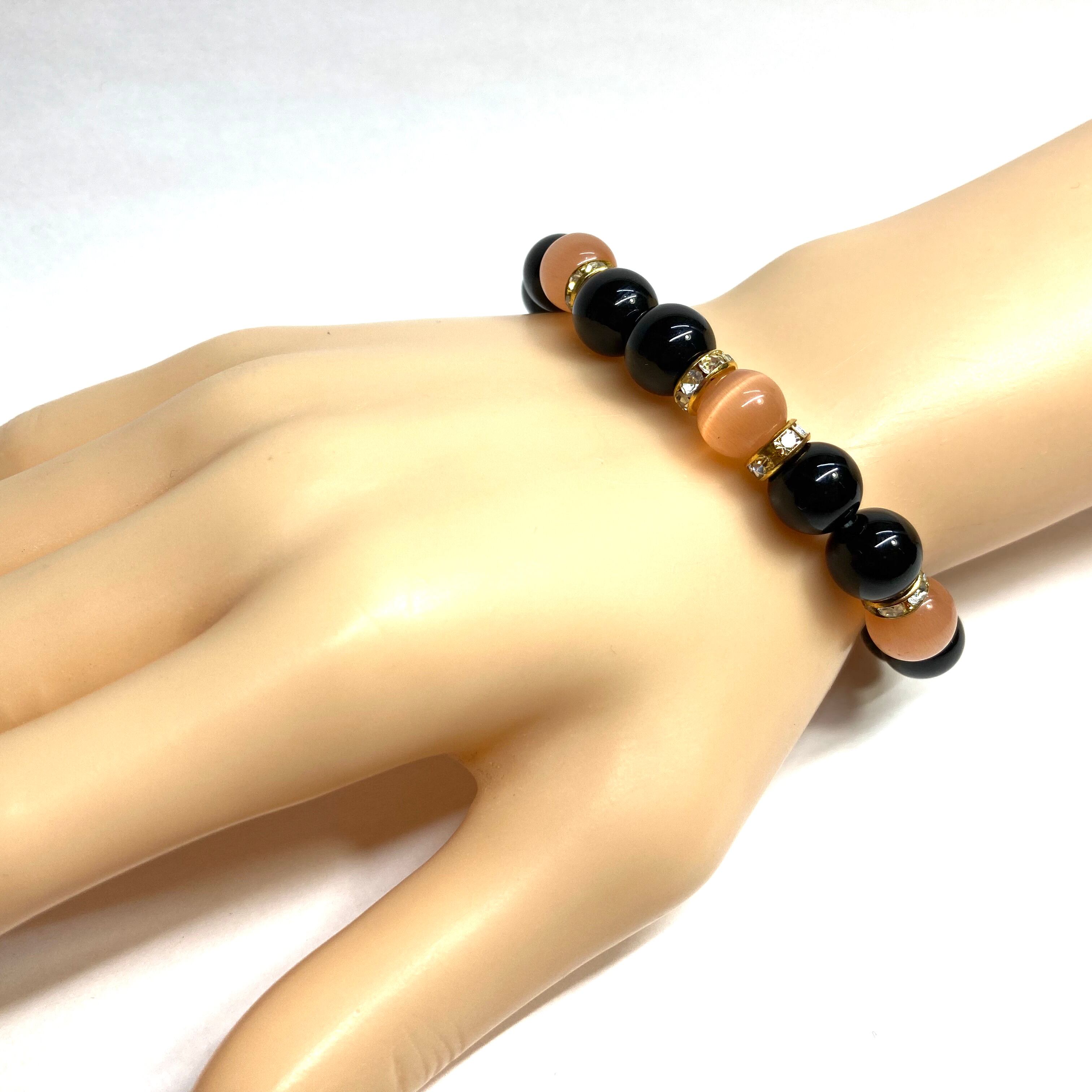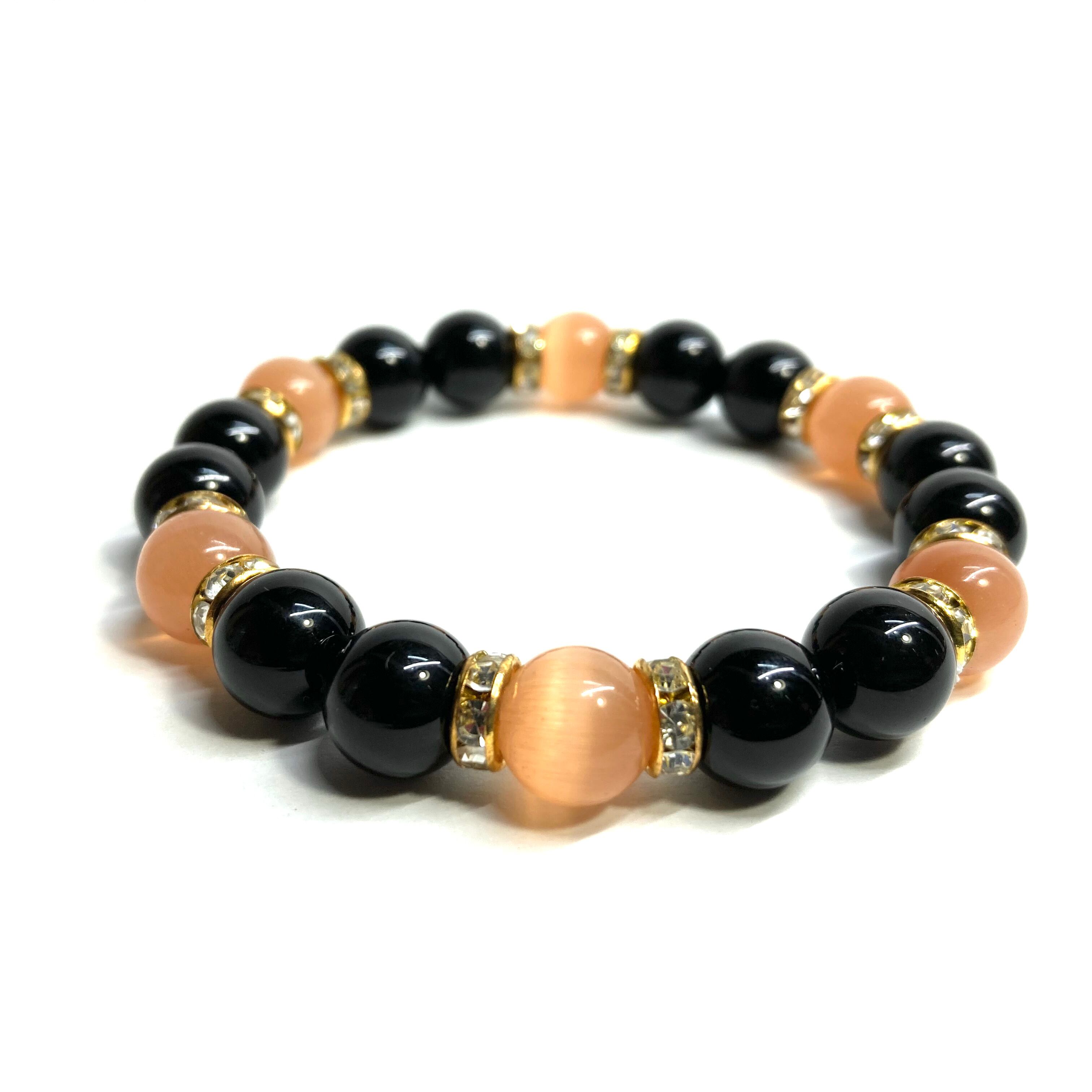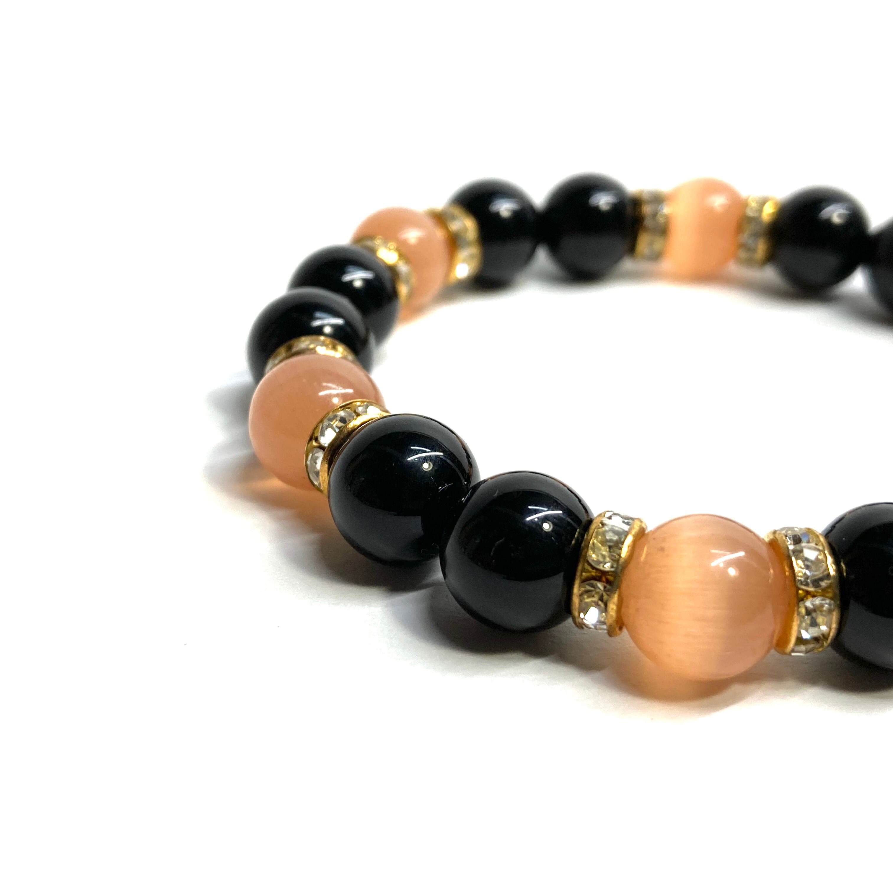 こちらは、キャッツアイとオニキスを組み合わせたブレスレットです。間にはロンデルを挟み高級感あるデザインに仕上がっています。石大きさは腕にも馴染みやすいように10mm玉で内周約16cm(伸可能)です。数に限りがございますので気になる方はお早めにどうぞ。