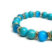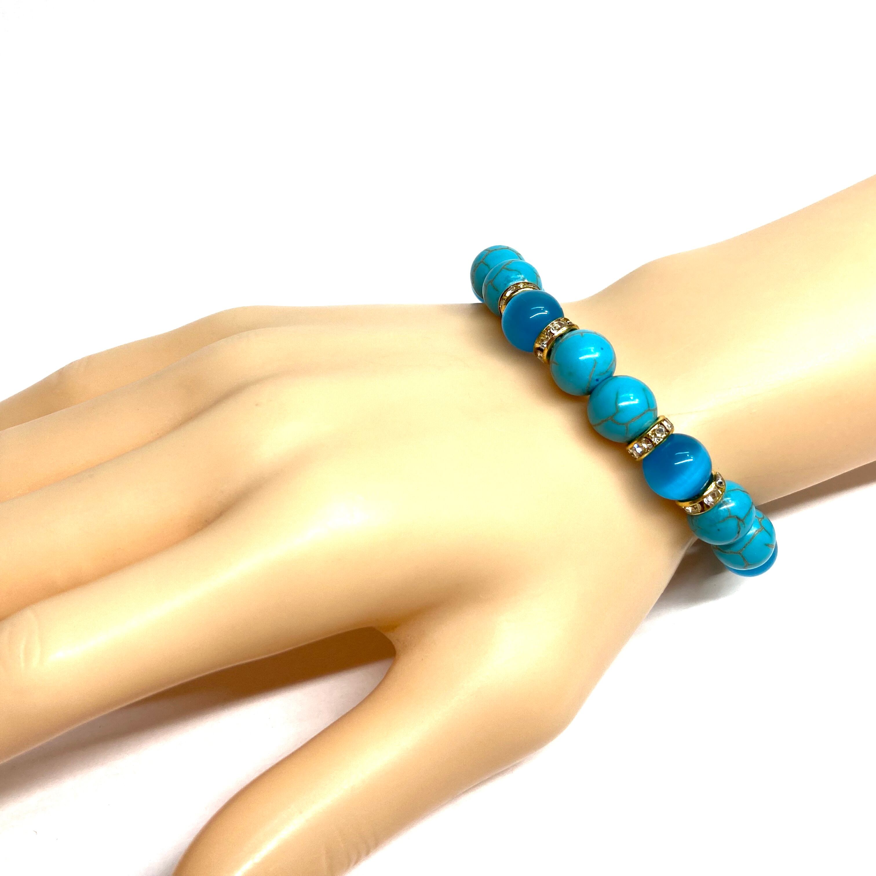 こちらは、キャッツアイとターコイズを組み合わせたブレスレットです。間にはロンデルを挟み高級感あるデザインに仕上がっています。石大きさは腕にも馴染みやすいように10mm玉で内周約16cm(伸可能)です。数に限りがございますので気になる方はお早めにどうぞ。