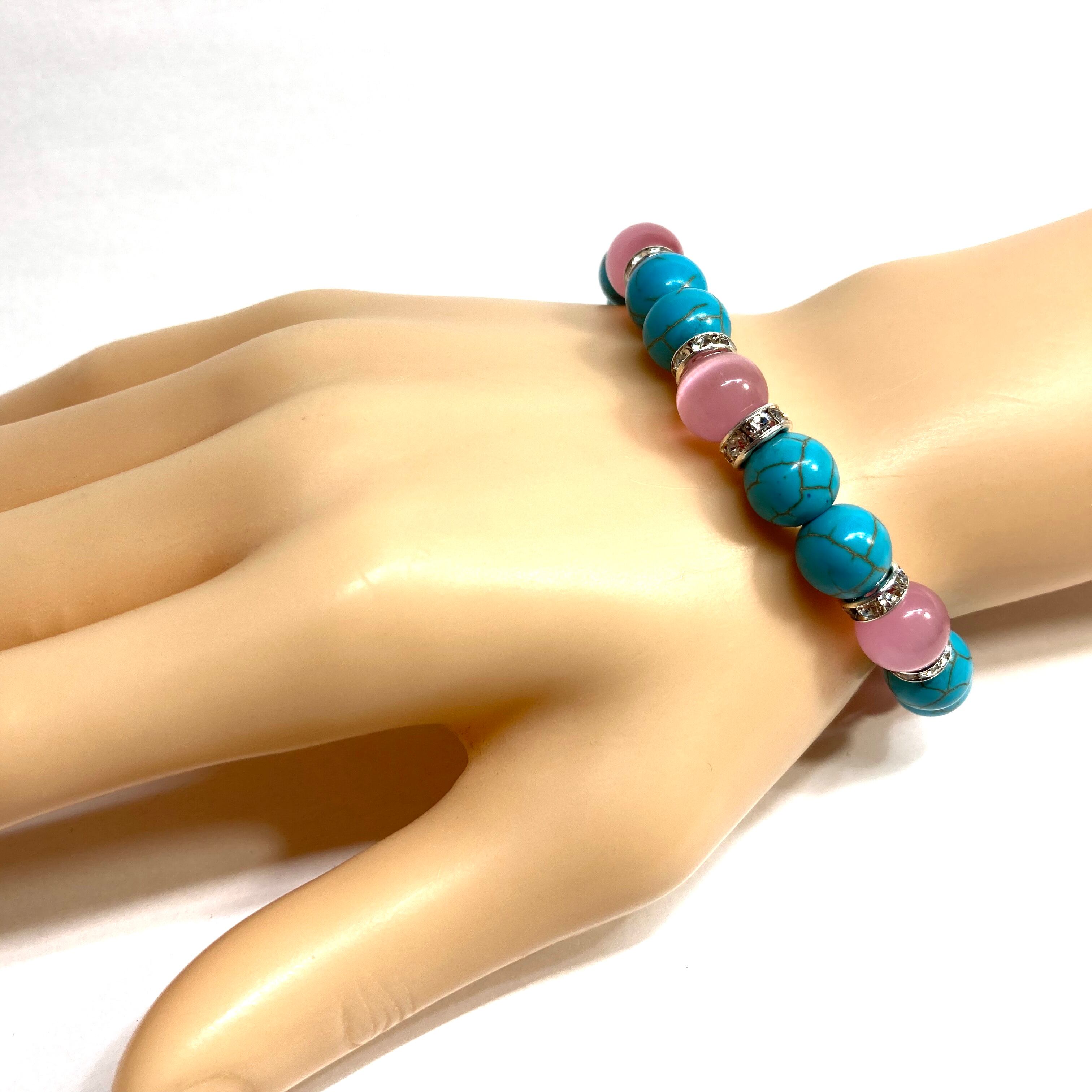 こちらは、キャッツアイとターコイズを組み合わせたブレスレットです。間にはロンデルを挟み高級感あるデザインに仕上がっています。石大きさは腕にも馴染みやすいように10mm玉で内周約16cm(伸可能)です。数に限りがございますので気になる方はお早めにどうぞ。