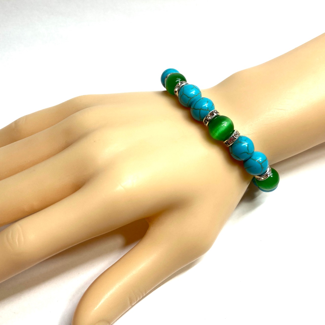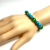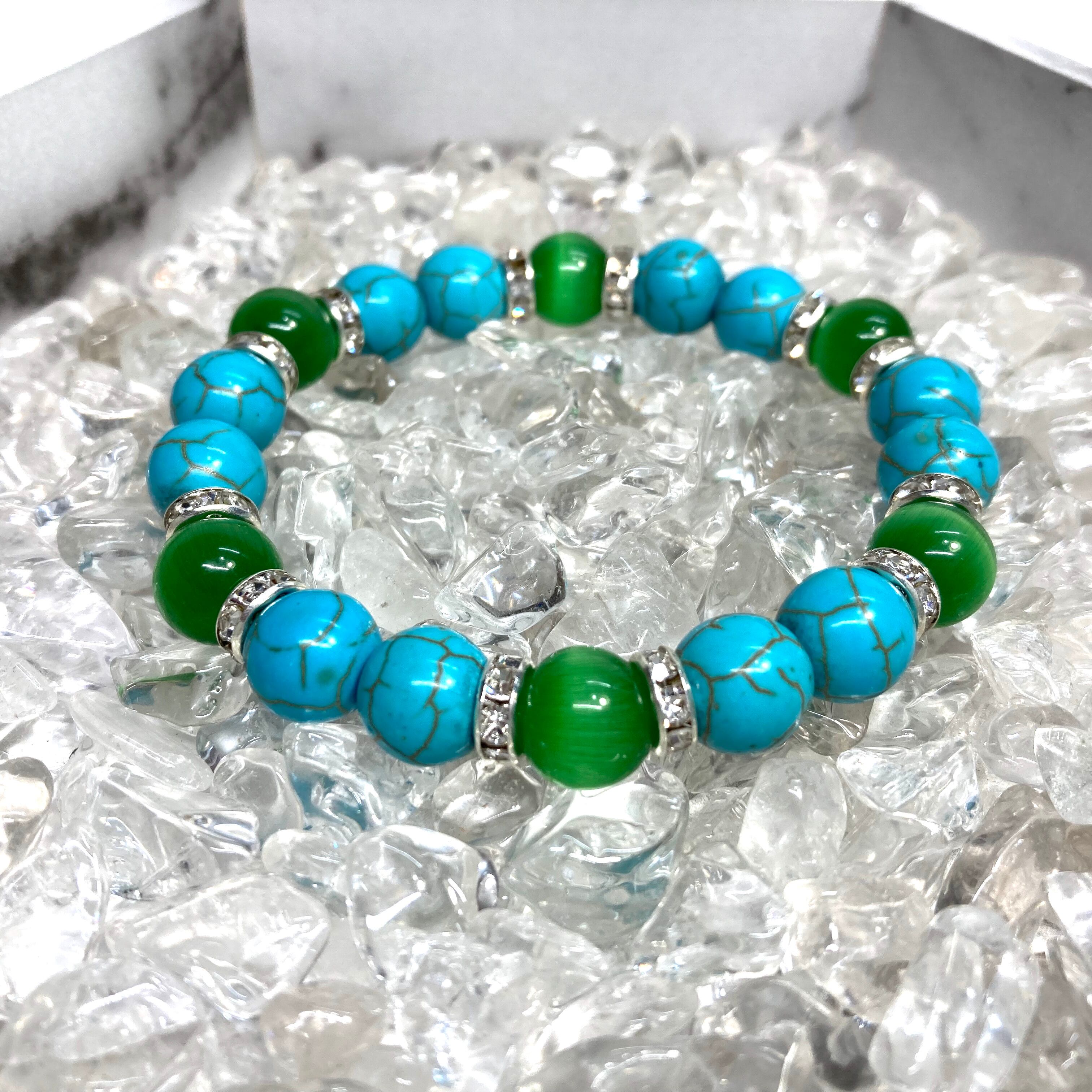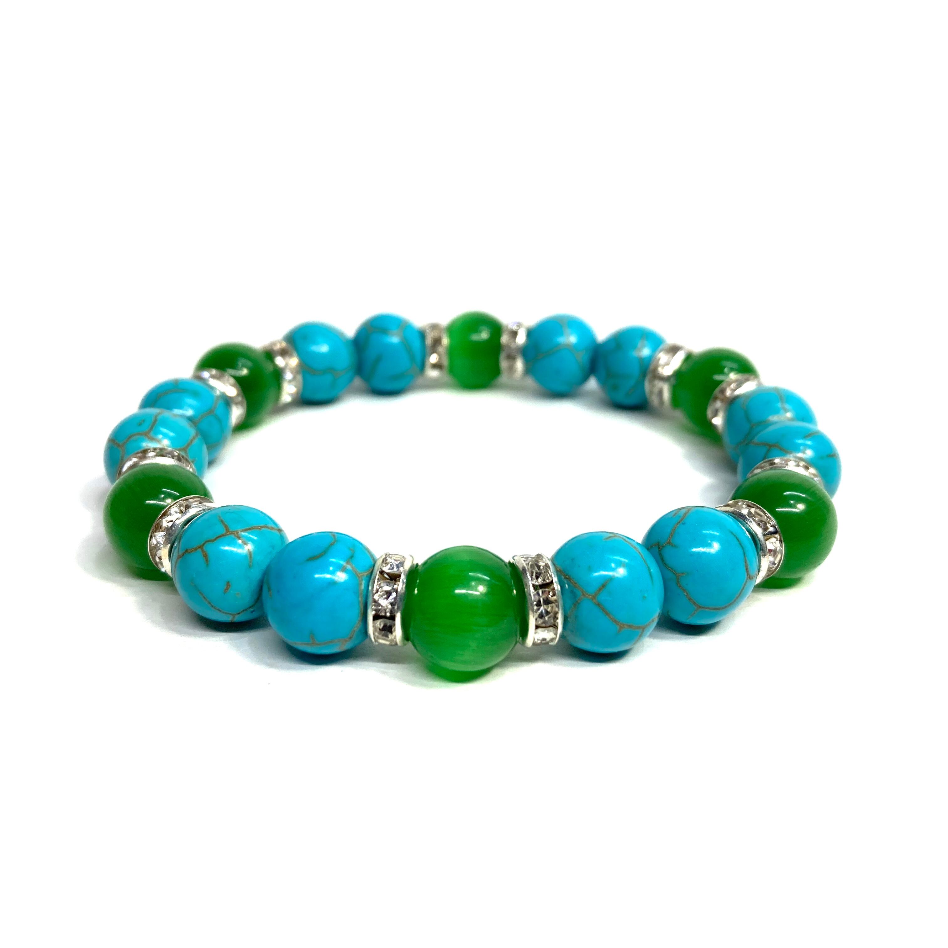 こちらは、キャッツアイとターコイズを組み合わせたブレスレットです。間にはロンデルを挟み高級感あるデザインに仕上がっています。石大きさは腕にも馴染みやすいように10mm玉で内周約16cm(伸可能)です。数に限りがございますので気になる方はお早めにどうぞ。