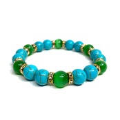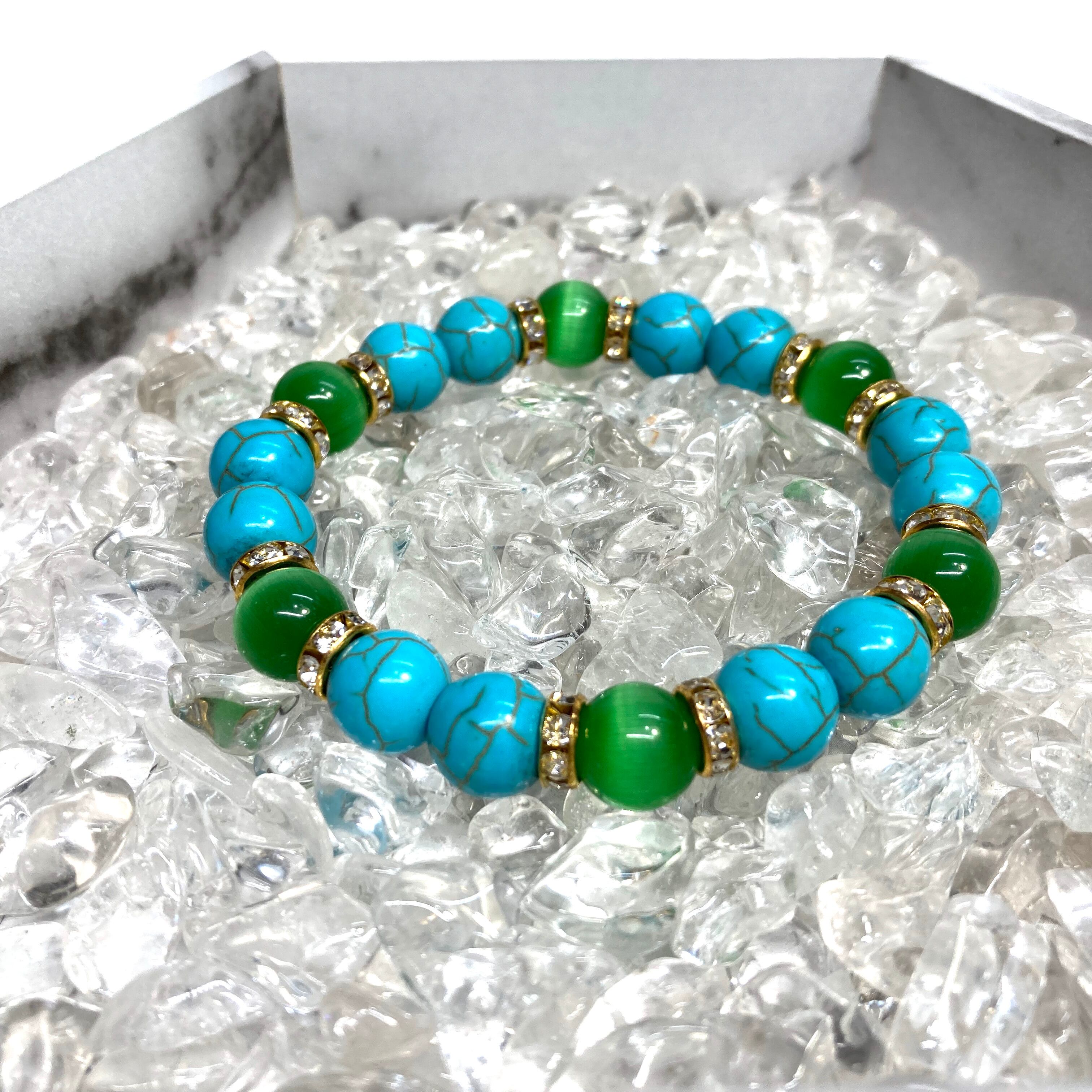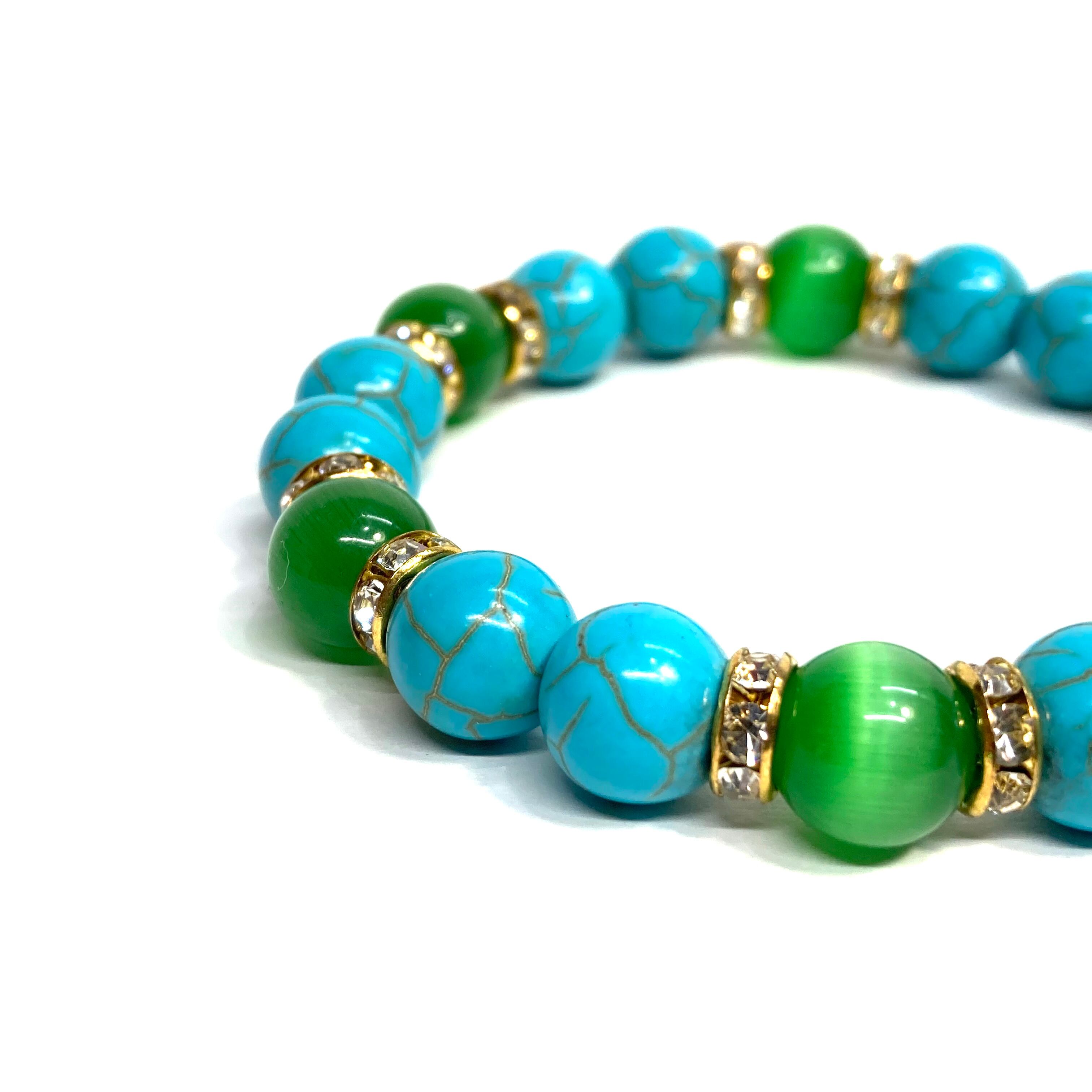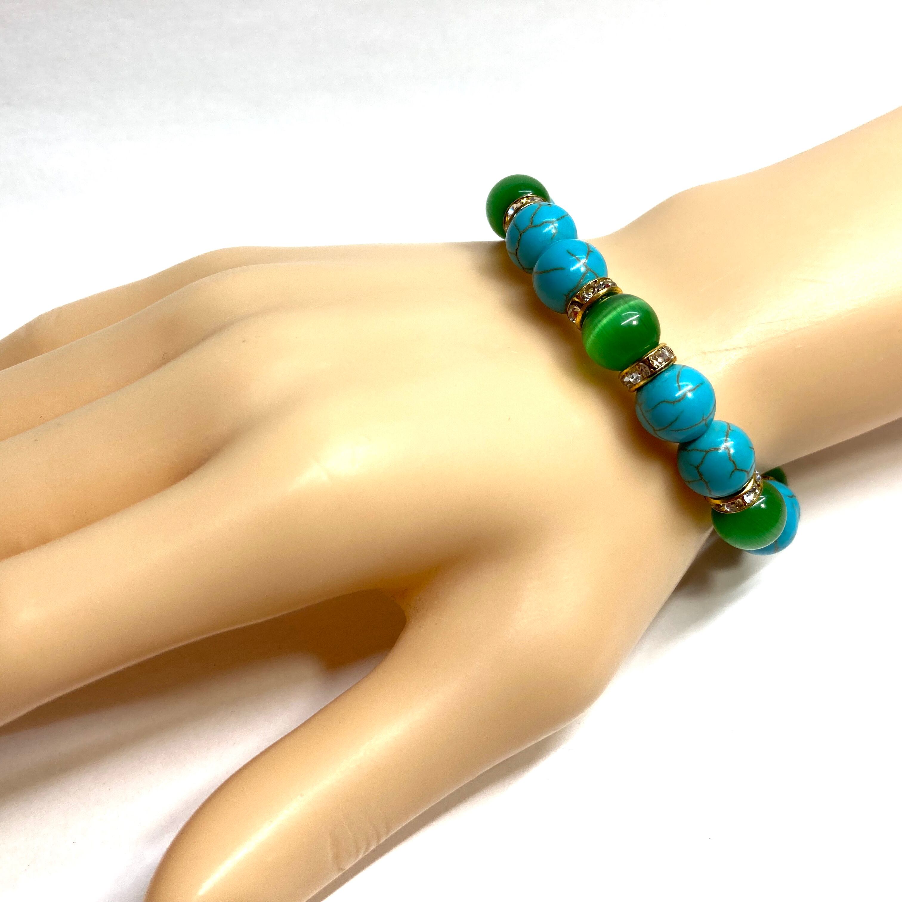 こちらは、キャッツアイとターコイズを組み合わせたブレスレットです。間にはロンデルを挟み高級感あるデザインに仕上がっています。石大きさは腕にも馴染みやすいように10mm玉で内周約16cm(伸可能)です。数に限りがございますので気になる方はお早めにどうぞ。