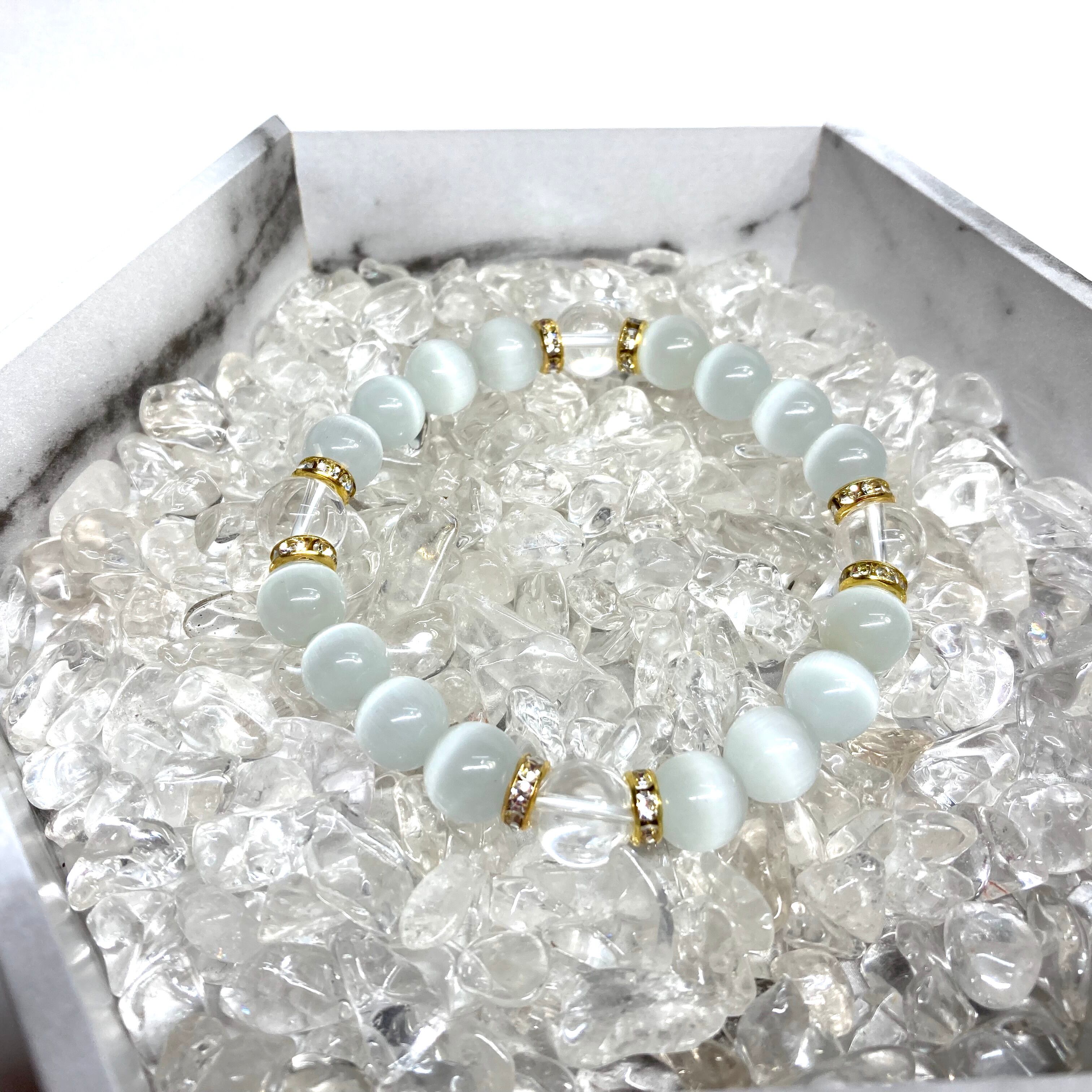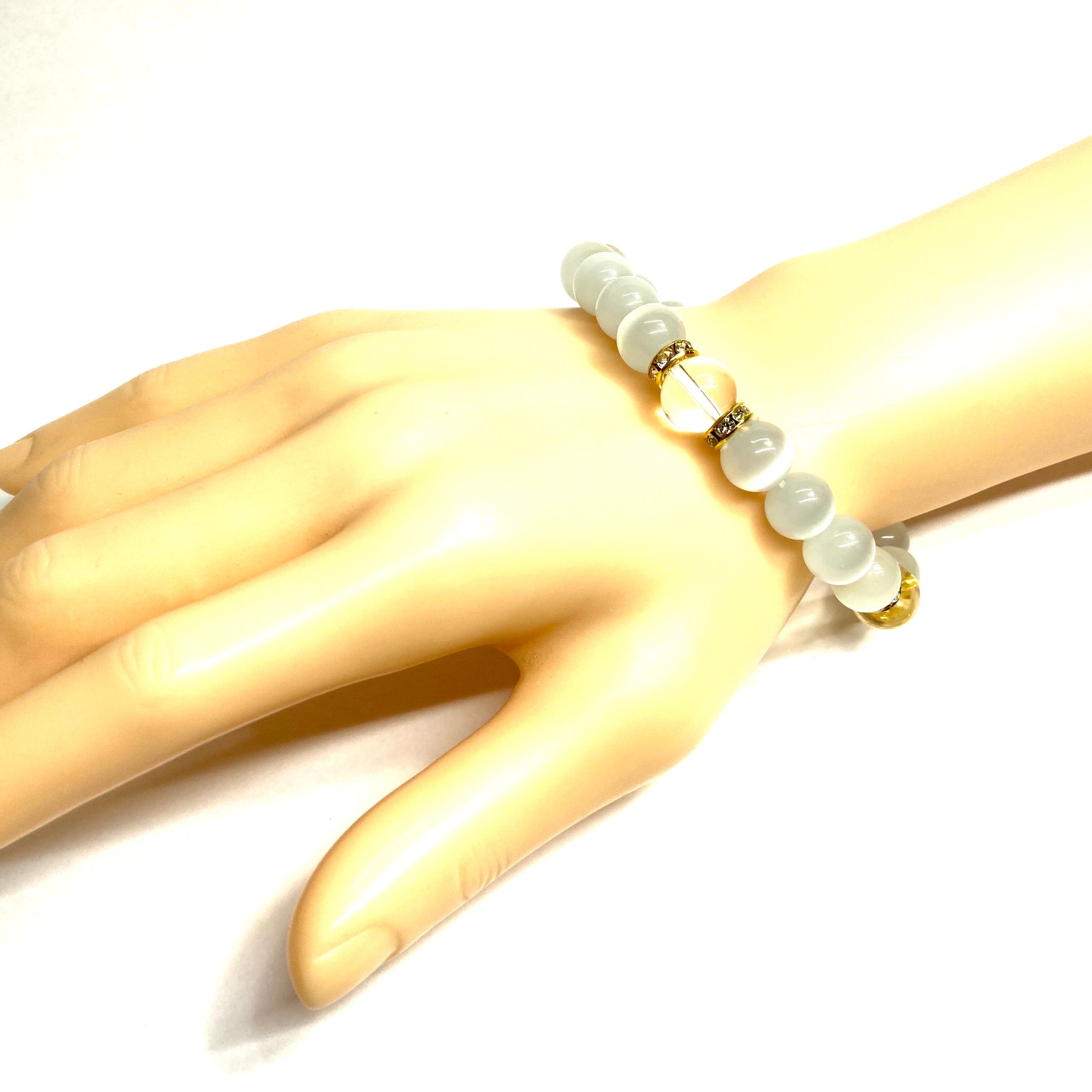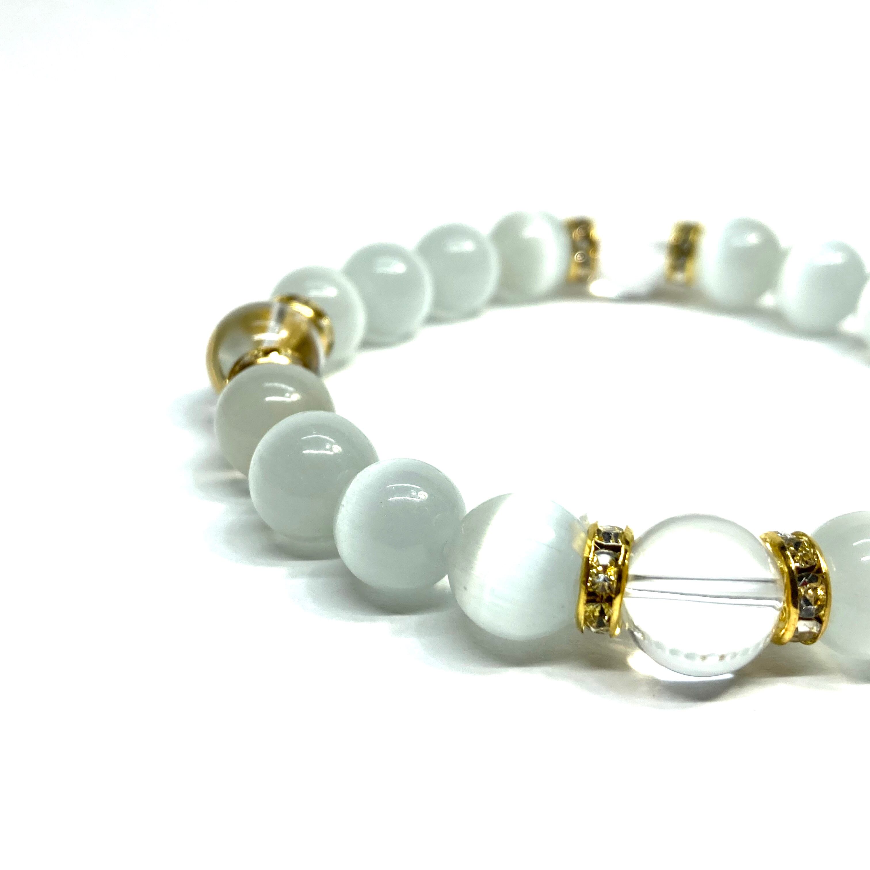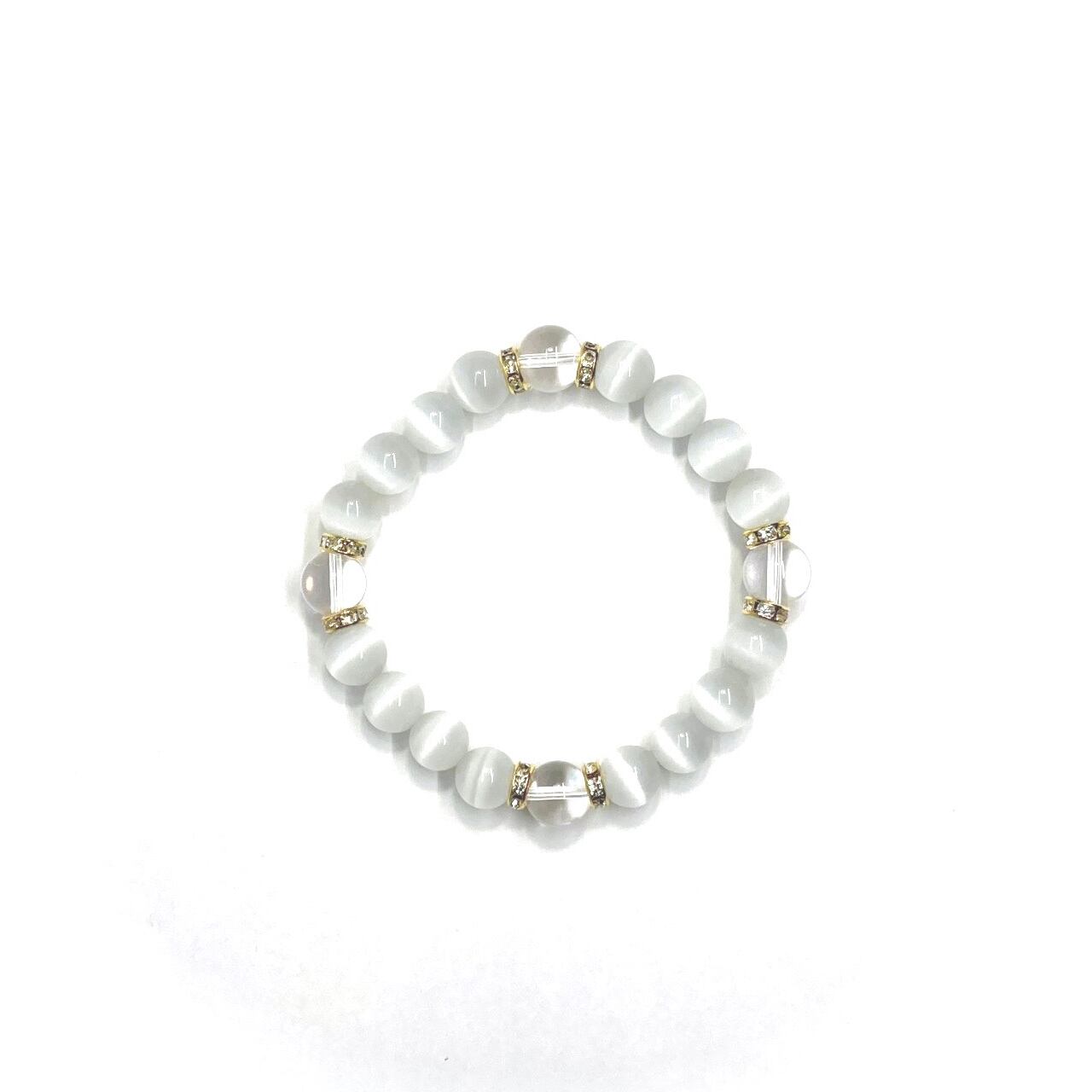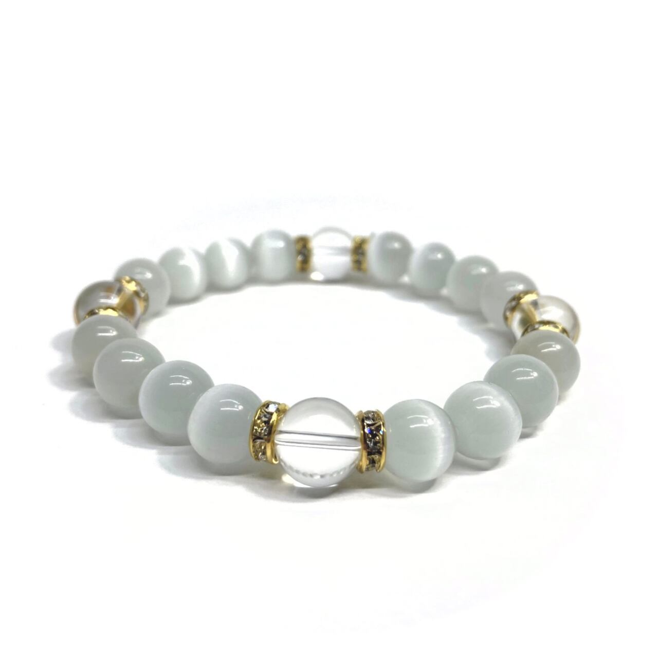 キャッツアイ(ホワイト)×水晶 パワーストーン ブレスレット (ゴールド) メンズ・レディース 男性・女性 数珠ブレス 開運