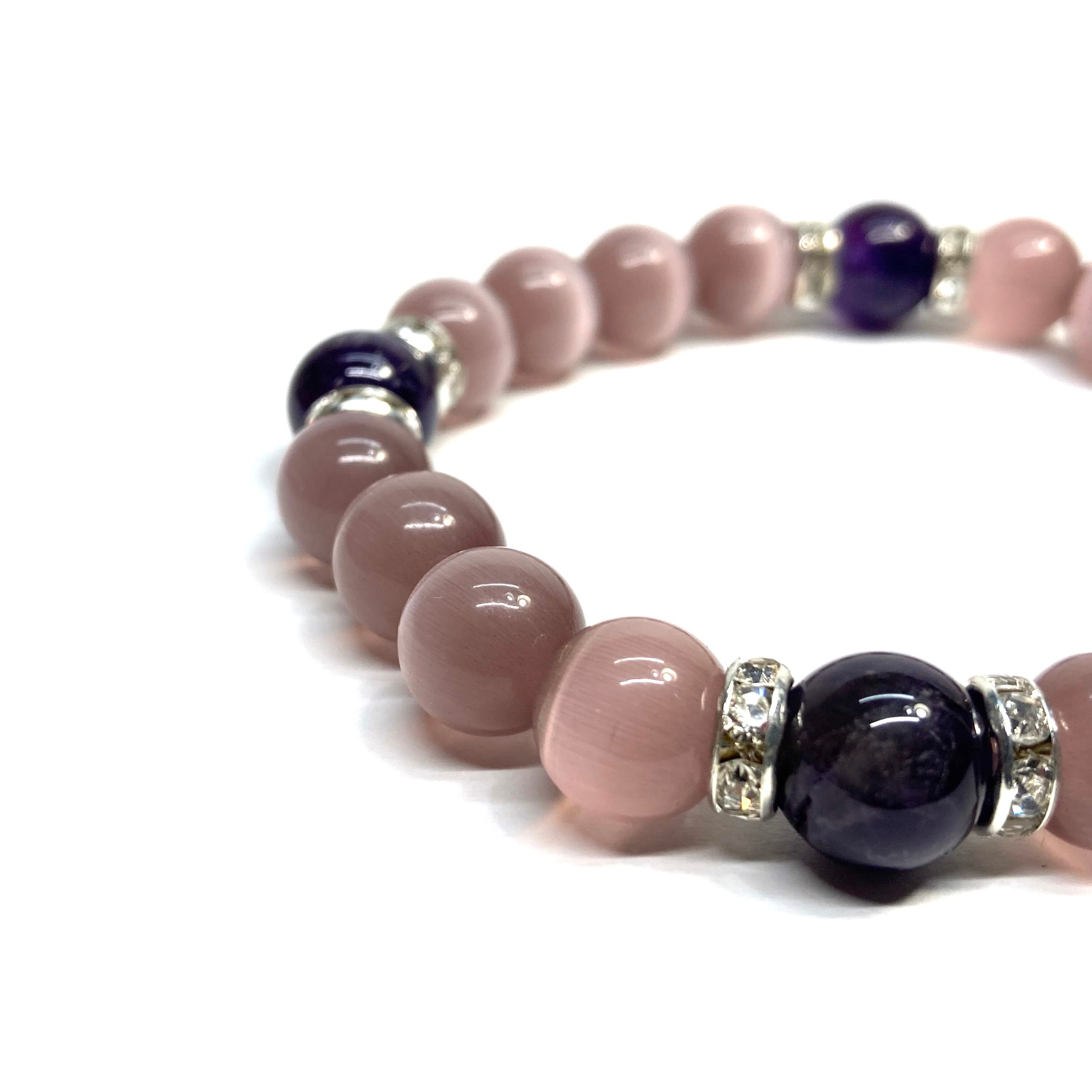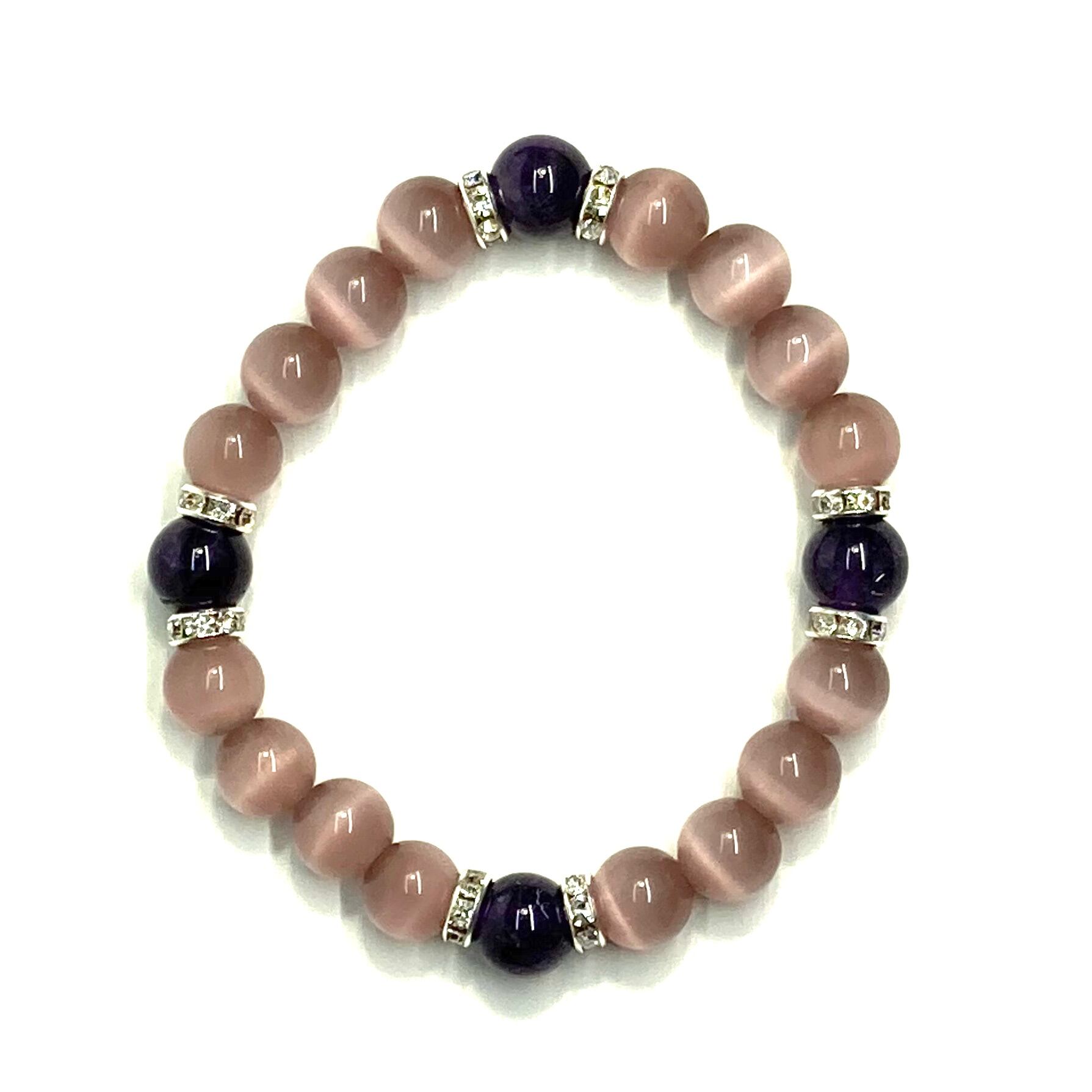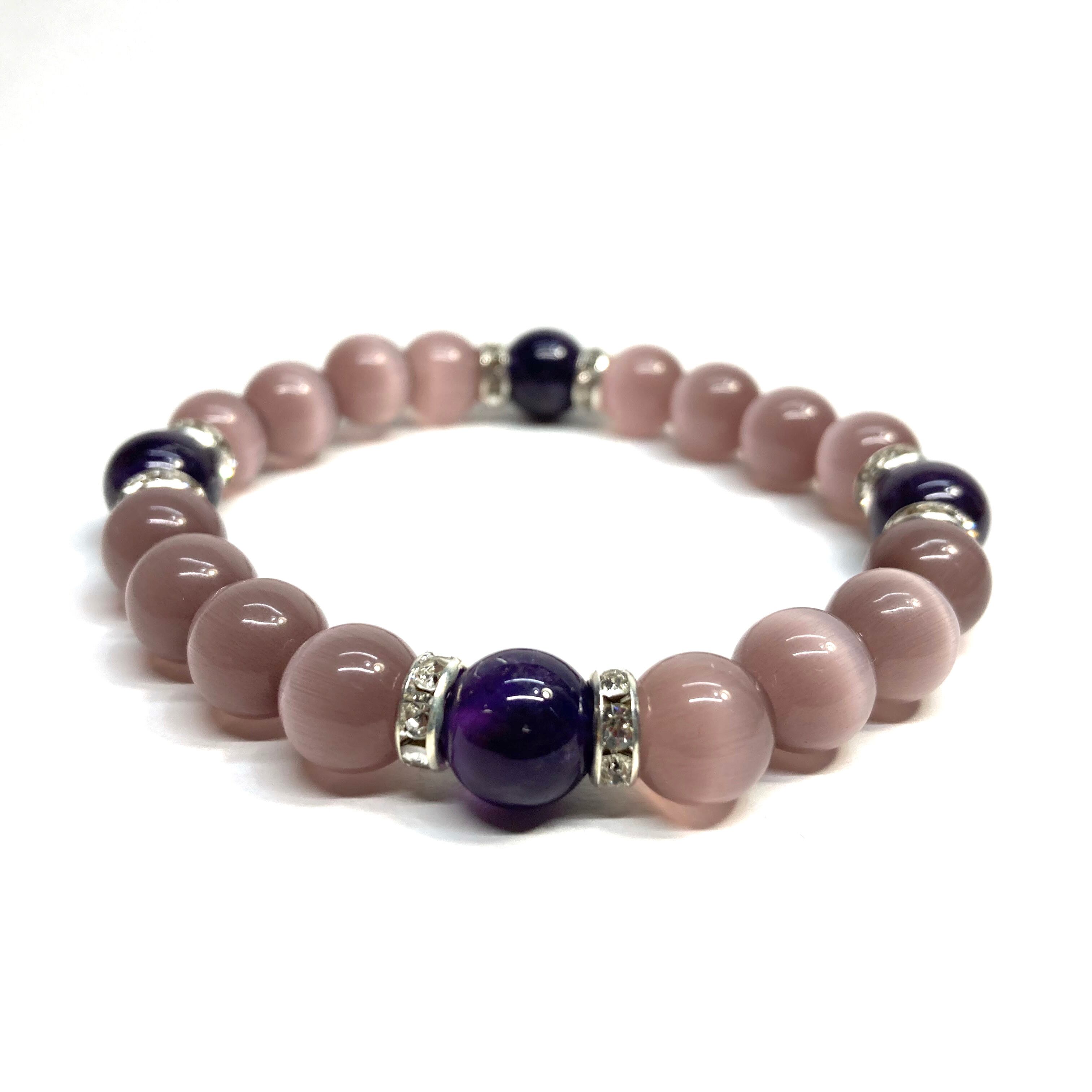 こちらは、キャッツアイとアメジストを組み合わせたブレスレットです。間にはロンデルを挟み高級感あるデザインに仕上がっています。石大きさは腕にも馴染みやすいように10mm玉で内周約17cm(伸可能)です。数に限りがございますので気になる方はお早めにどうぞ。