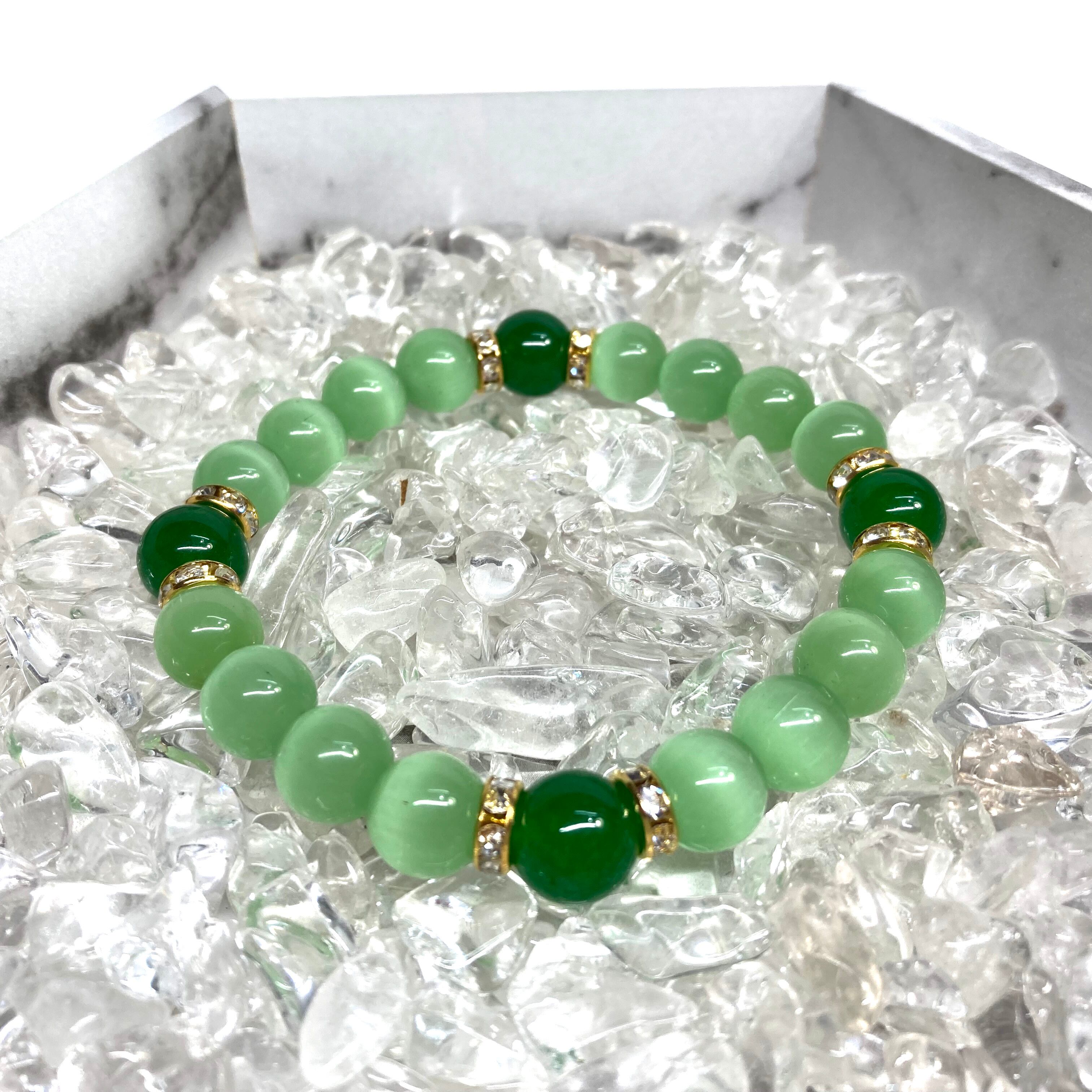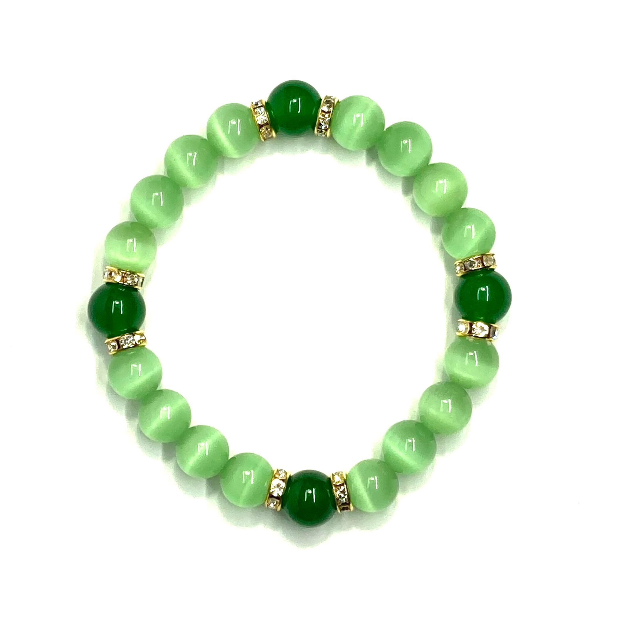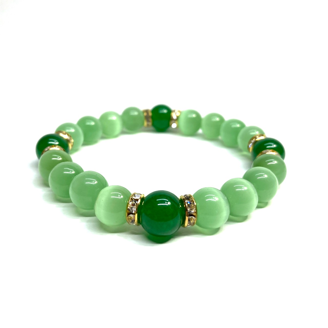 こちらは、キャッツアイと緑瑪瑙を組み合わせたブレスレットです。間にはロンデルを挟み高級感あるデザインに仕上がっています。石大きさは腕にも馴染みやすいように10mm玉で内周約17cm(伸可能)です。数に限りがございますので気になる方はお早めにどうぞ。