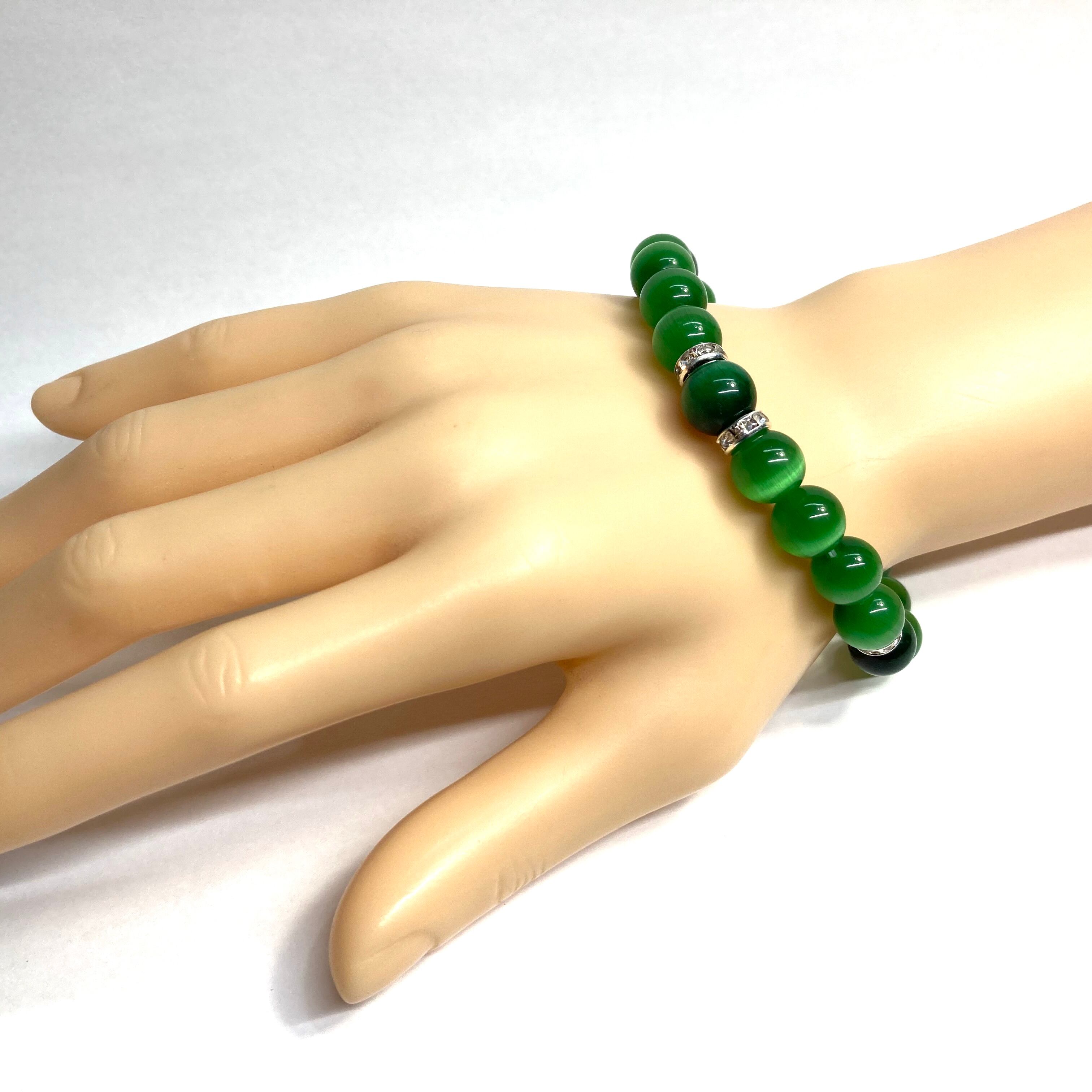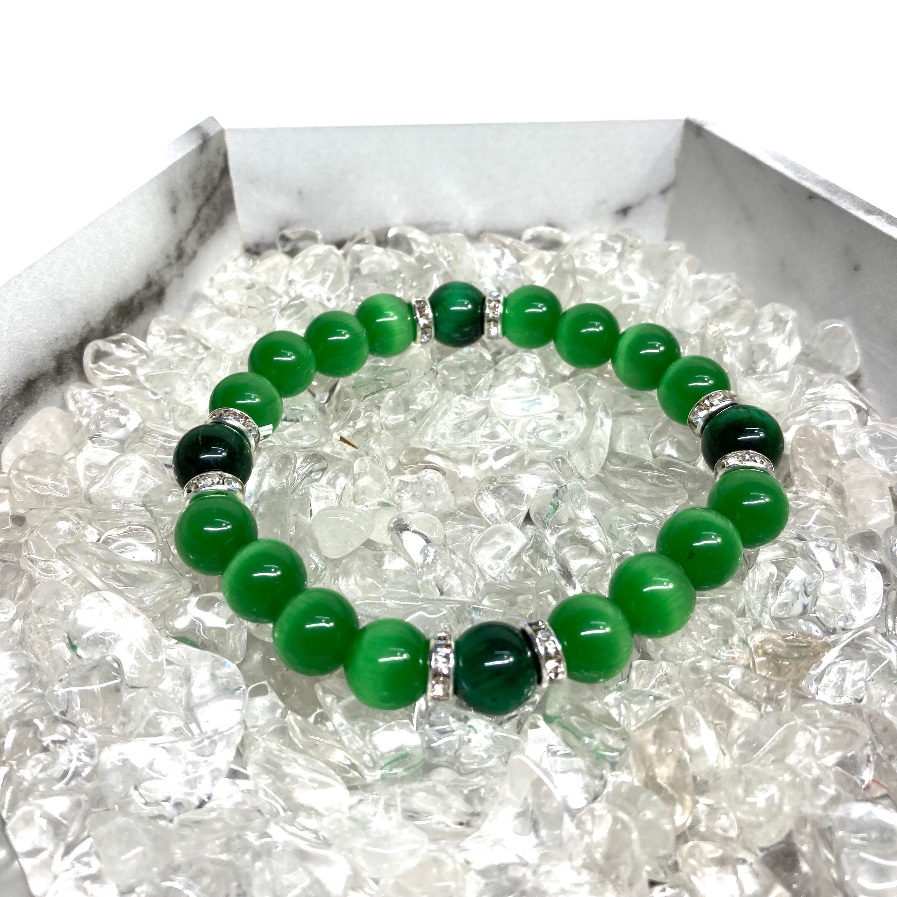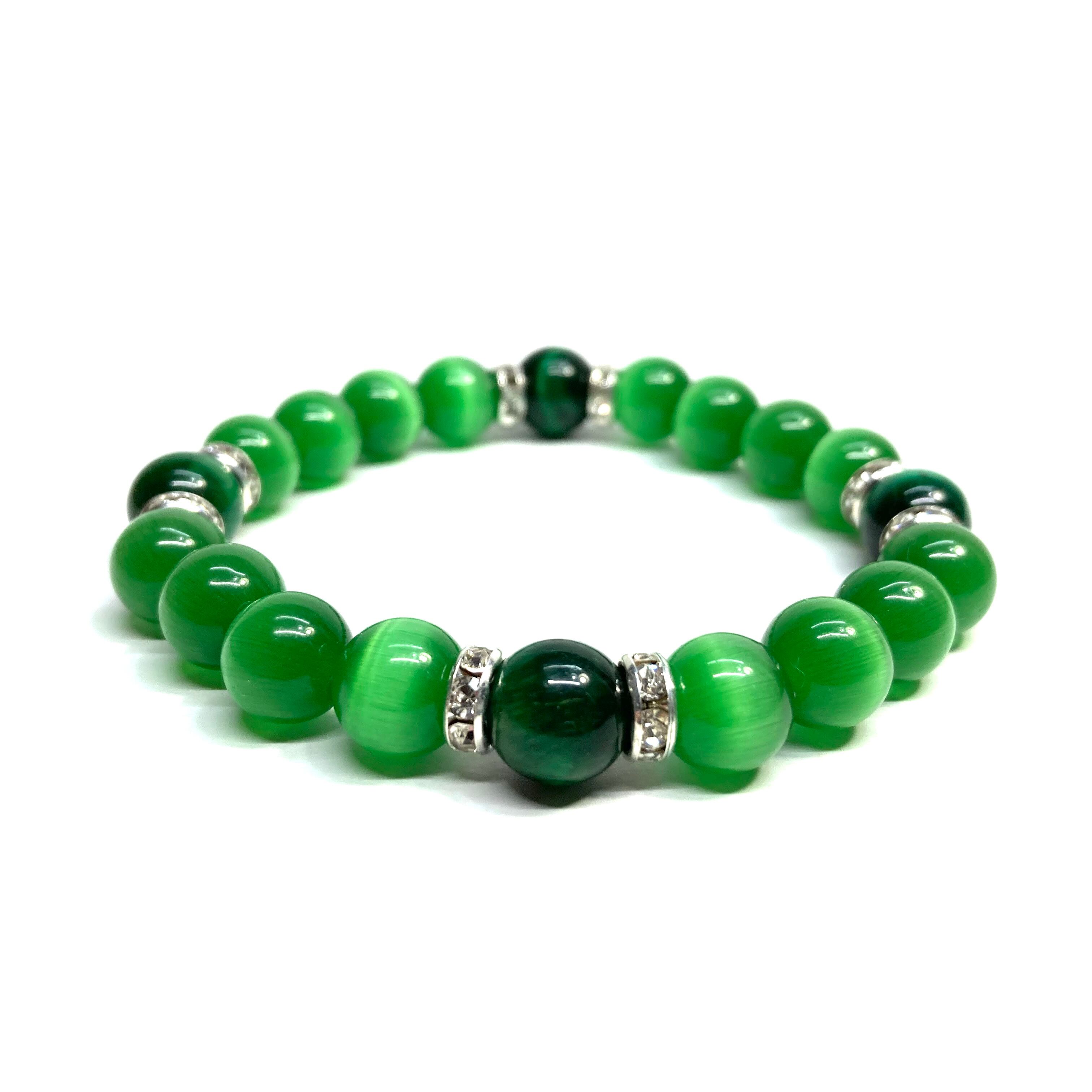 こちらは、キャッツアイとグリーンタイガーアイを組み合わせたブレスレットです。間にはロンデルを挟み高級感あるデザインに仕上がっています。石大きさは腕にも馴染みやすいように10mm玉で内周約17cm(伸可能)です。数に限りがございますので気になる方はお早めにどうぞ。