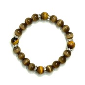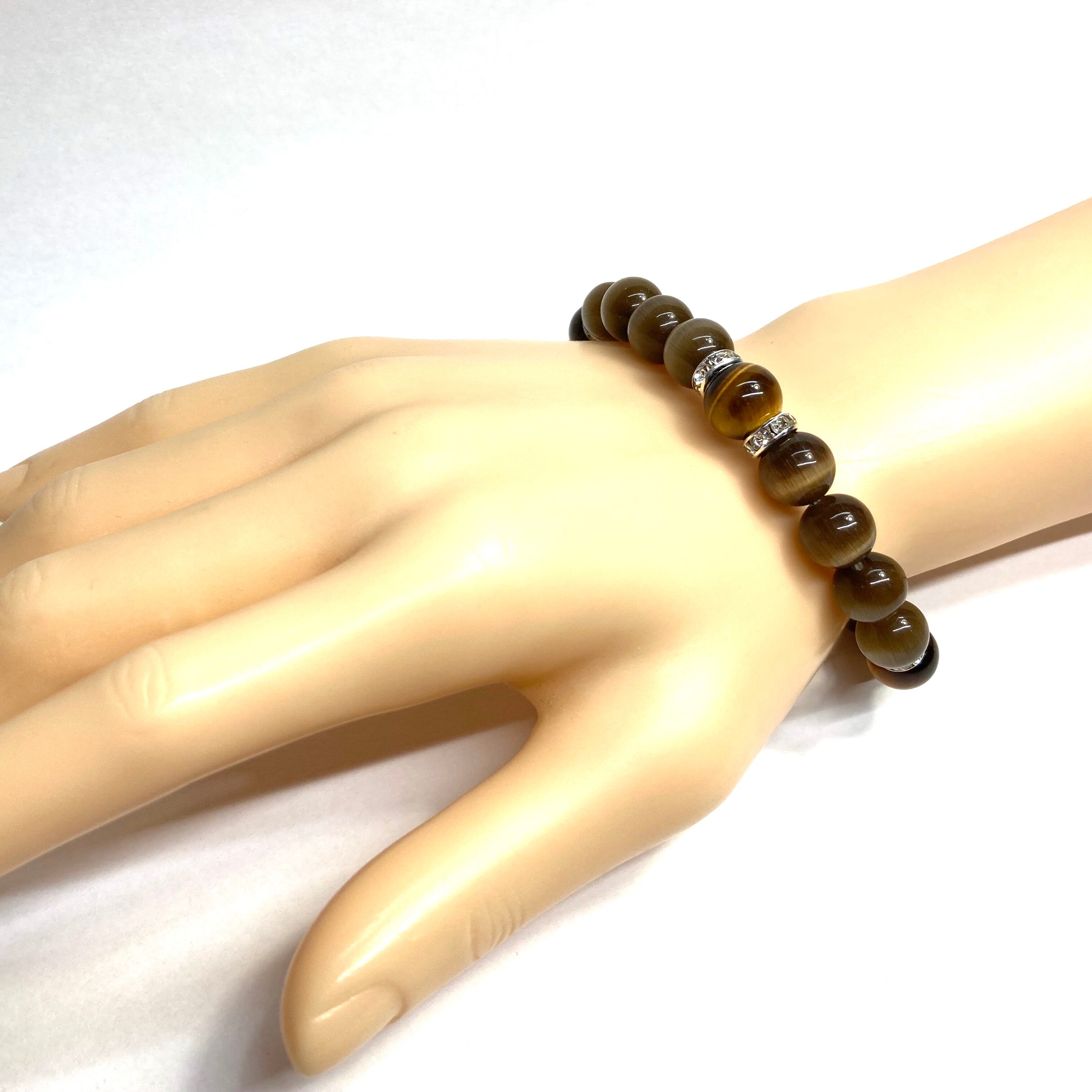 こちらは、キャッツアイとタイガーアイを組み合わせたブレスレットです。間にはロンデルを挟み高級感あるデザインに仕上がっています。石大きさは腕にも馴染みやすいように10mm玉で内周約17cm(伸可能)です。数に限りがございますので気になる方はお早めにどうぞ。
