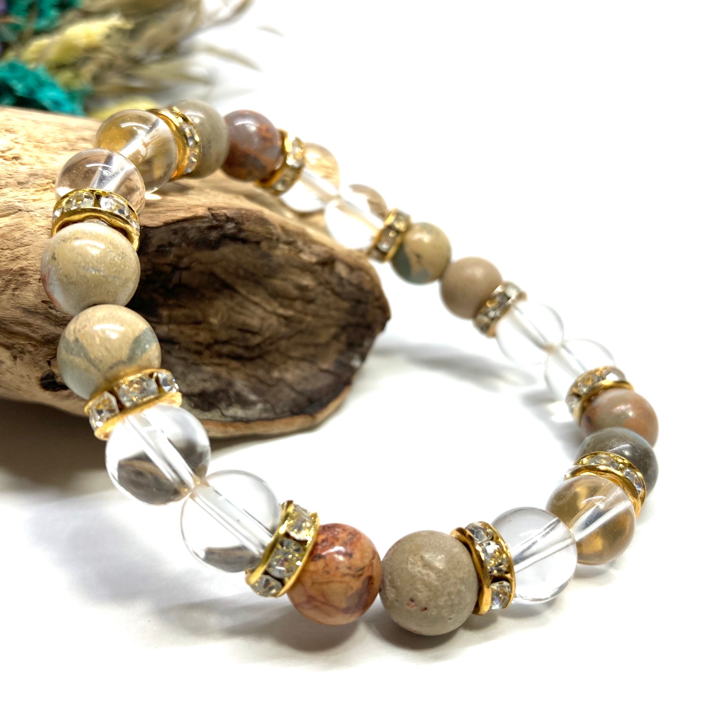 インプレッションストーン&水晶 パワーストーン ブレスレット 天然石ブレス (ゴールド) 8mm レディース 女性 数珠ブレス 開運 プレゼント ギフト