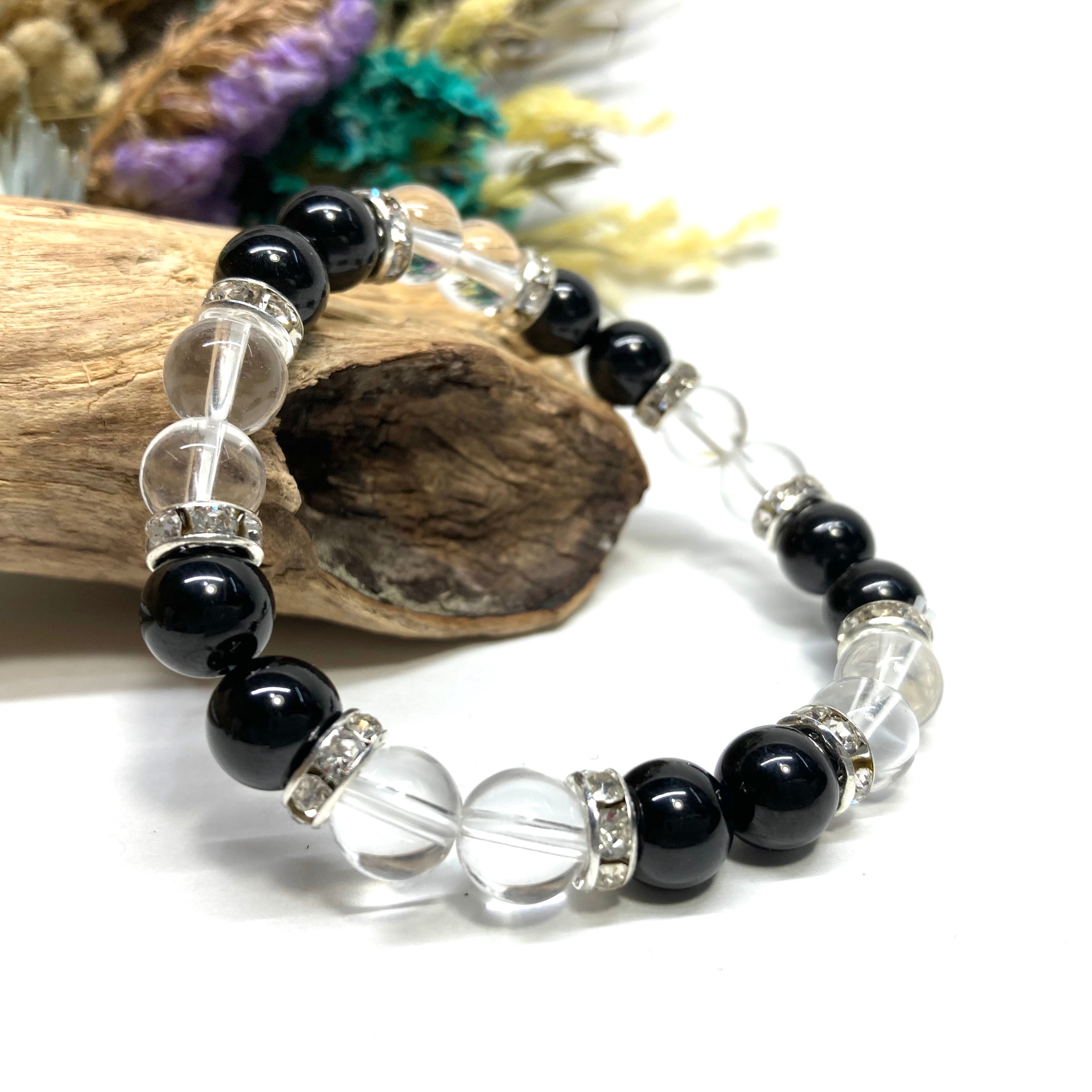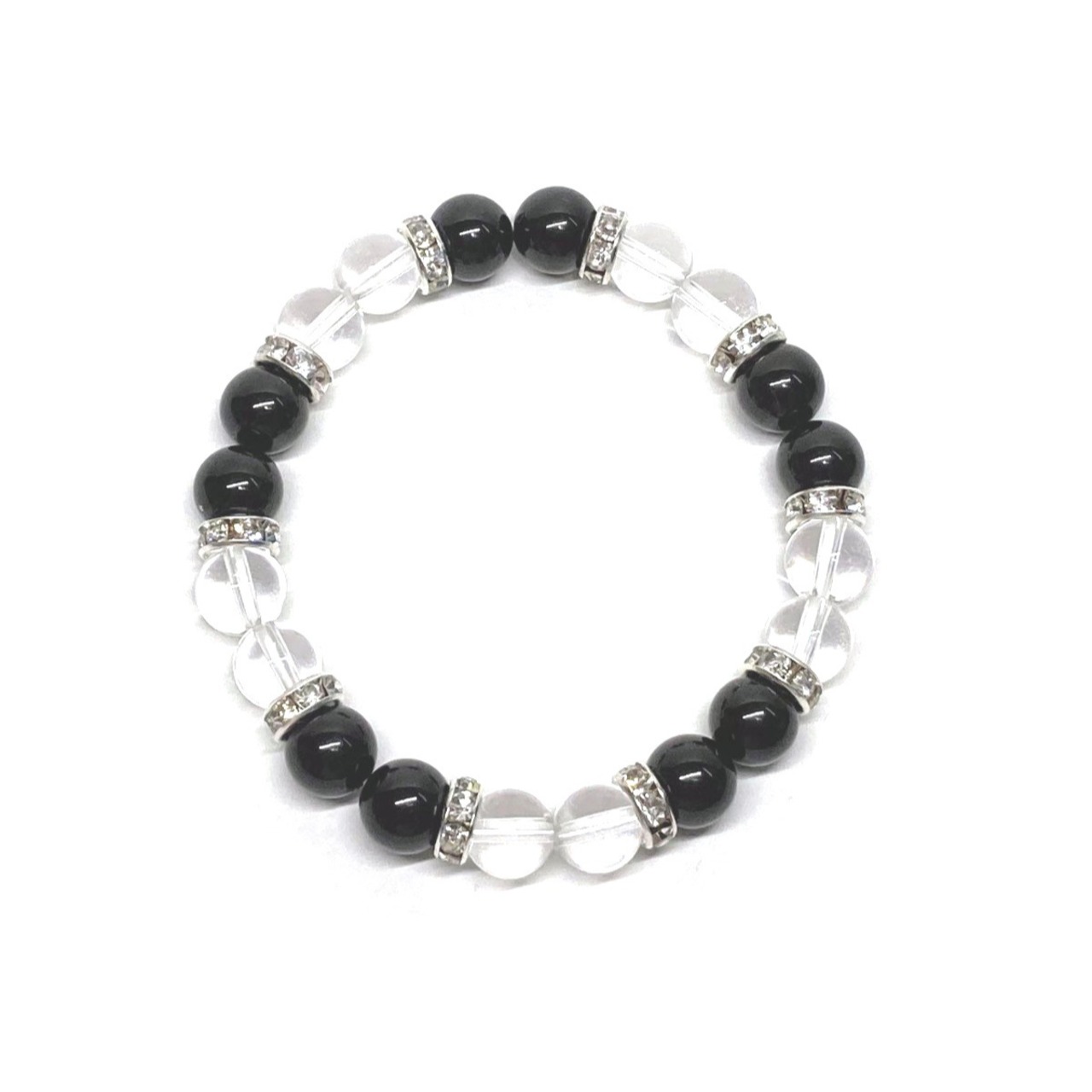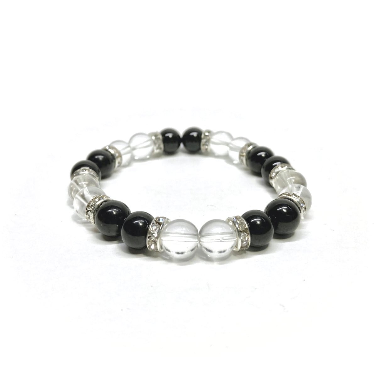 こちらは、8mm玉のモリオンと水晶を使用した天然石ブレスレットです。石との間に挟まれたロンデルがアクセントになったデザインです。サイズは内周約15cmです。
