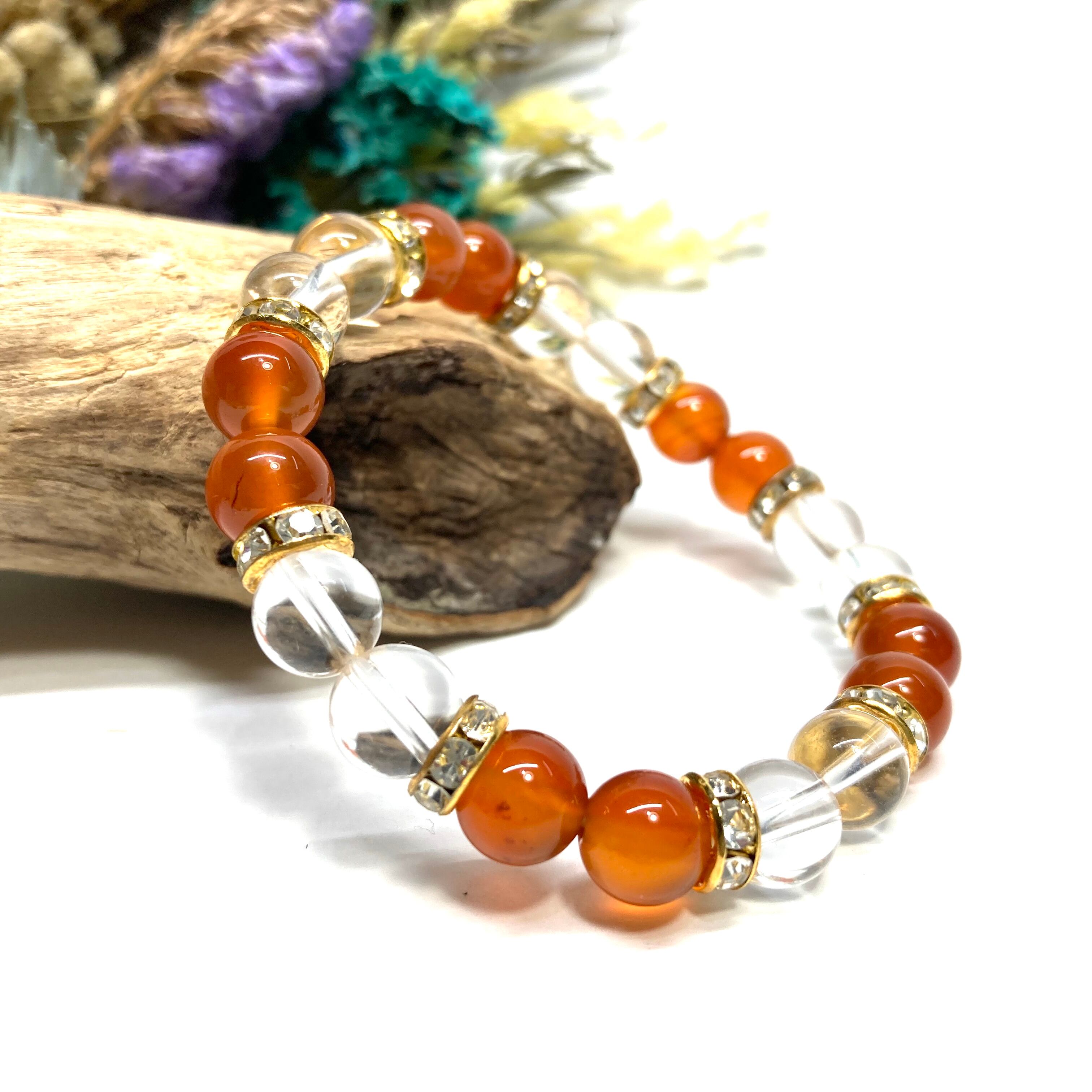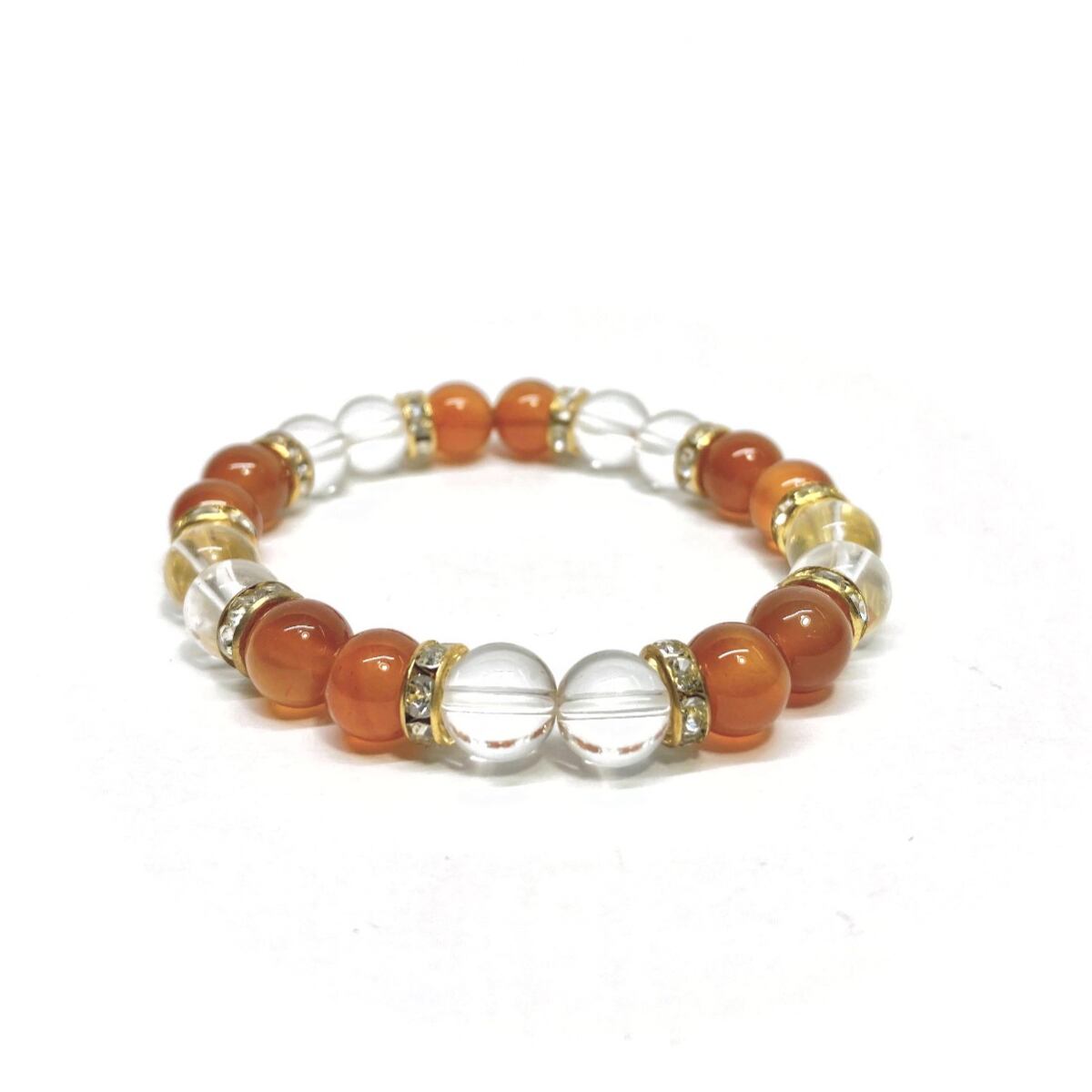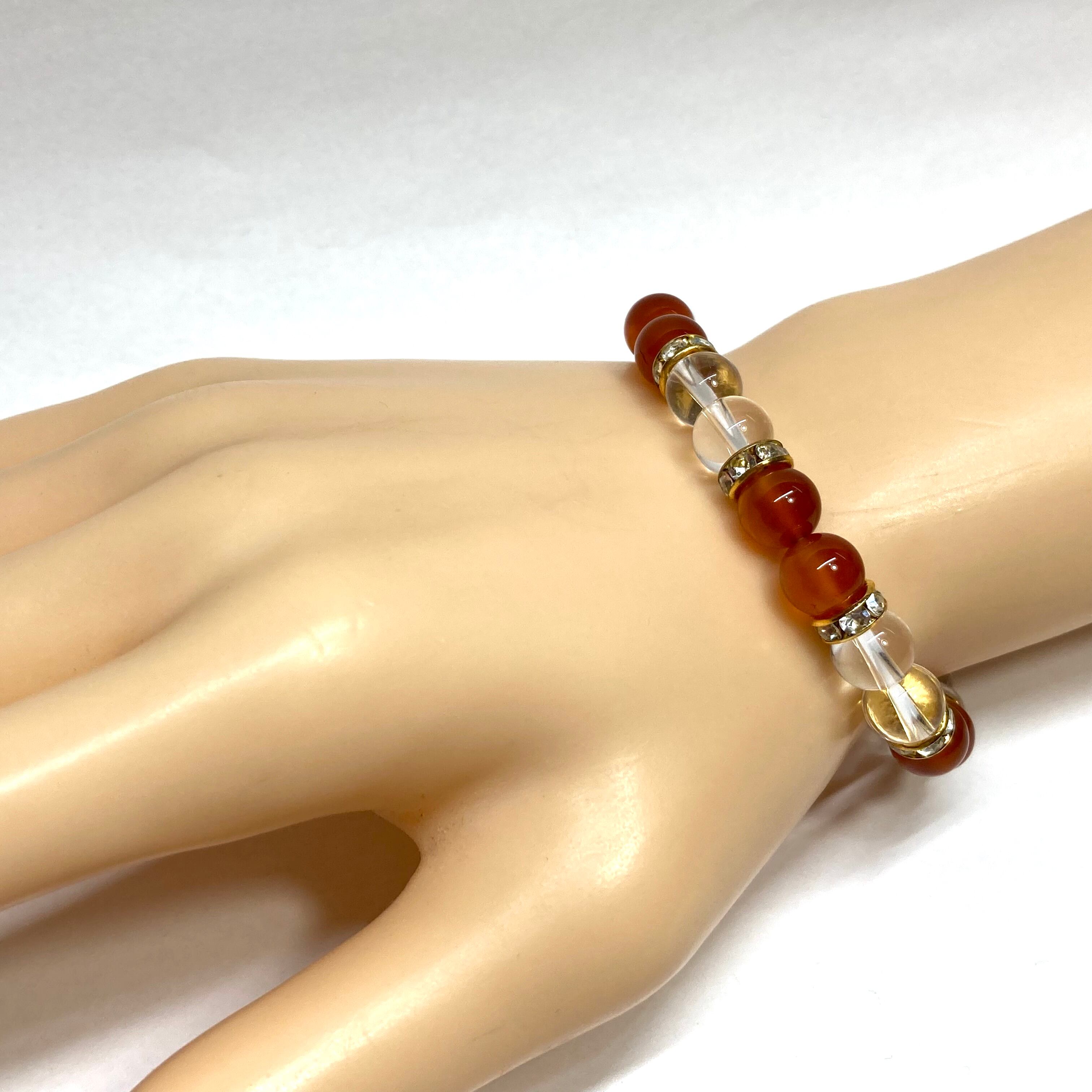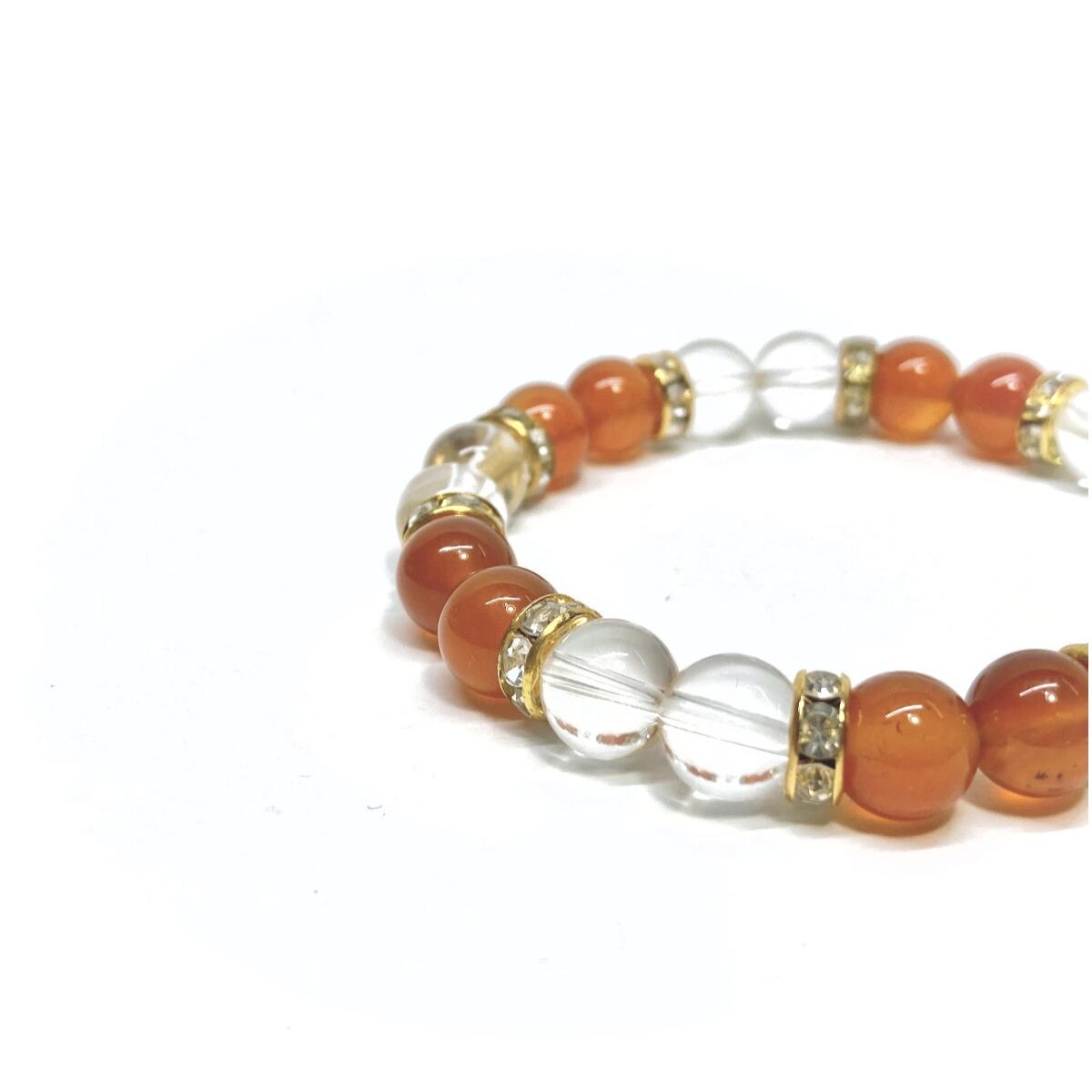 こちらは、8mm玉のカーネリアンと水晶を使用した天然石ブレスレットです。石との間に挟まれたロンデルがアクセントになったデザインです。サイズは内周約15cmです。