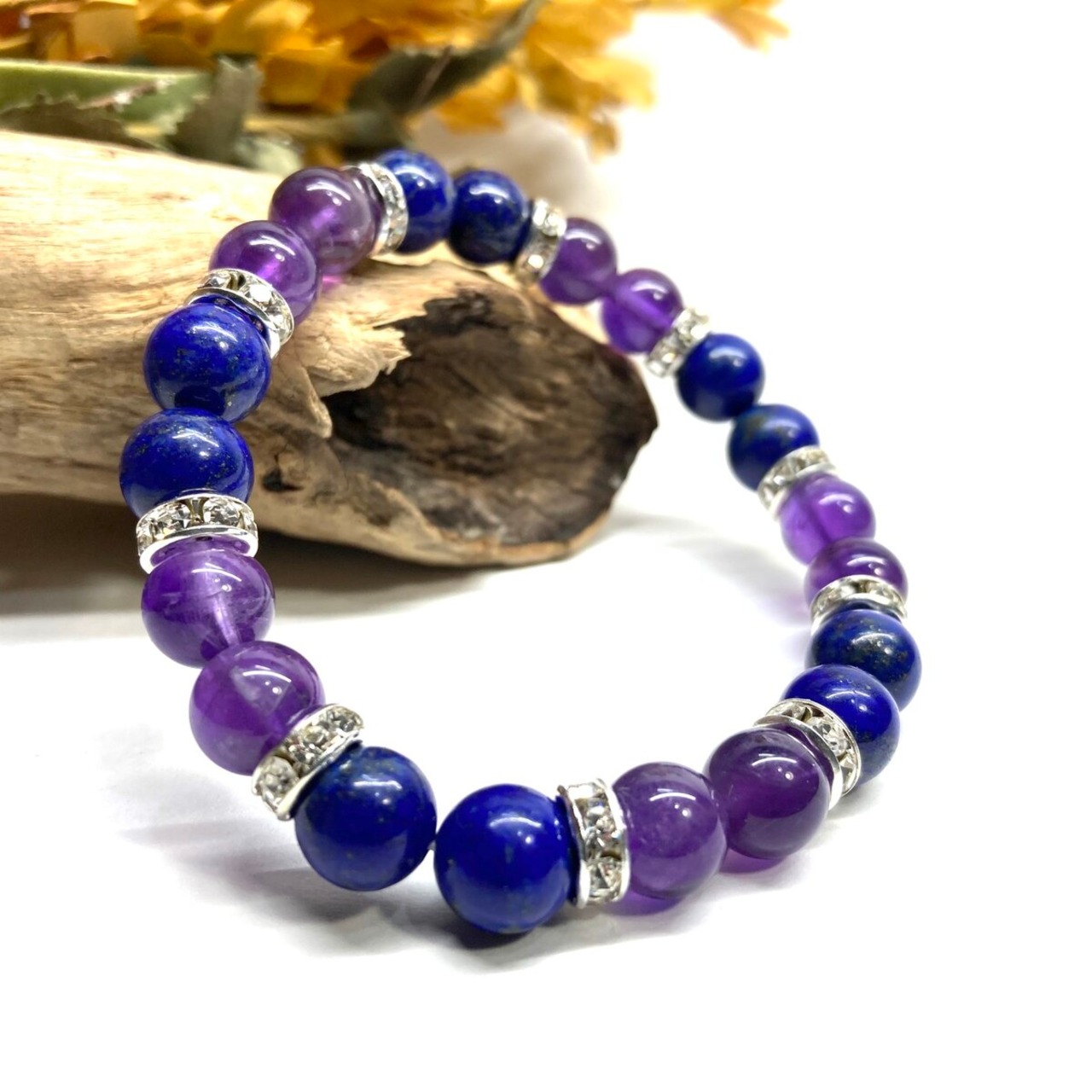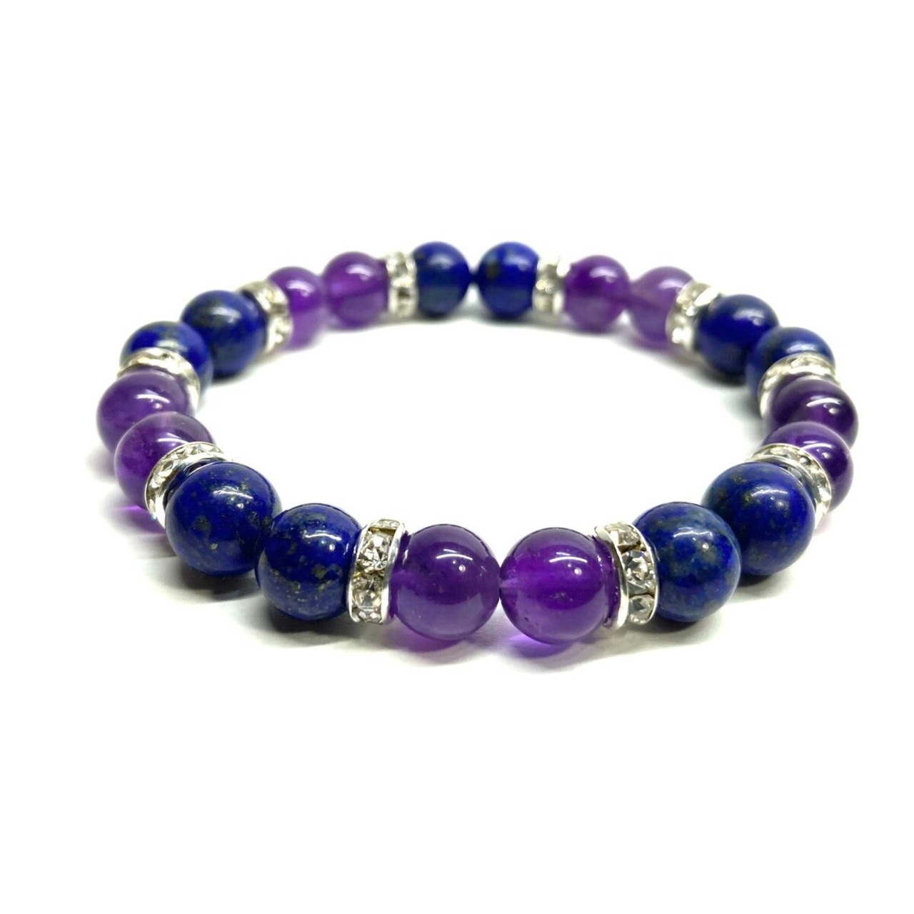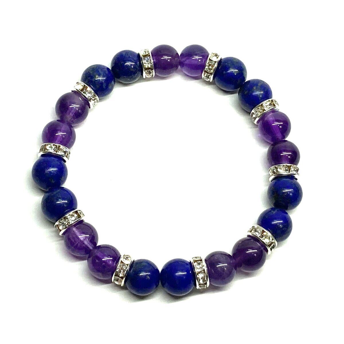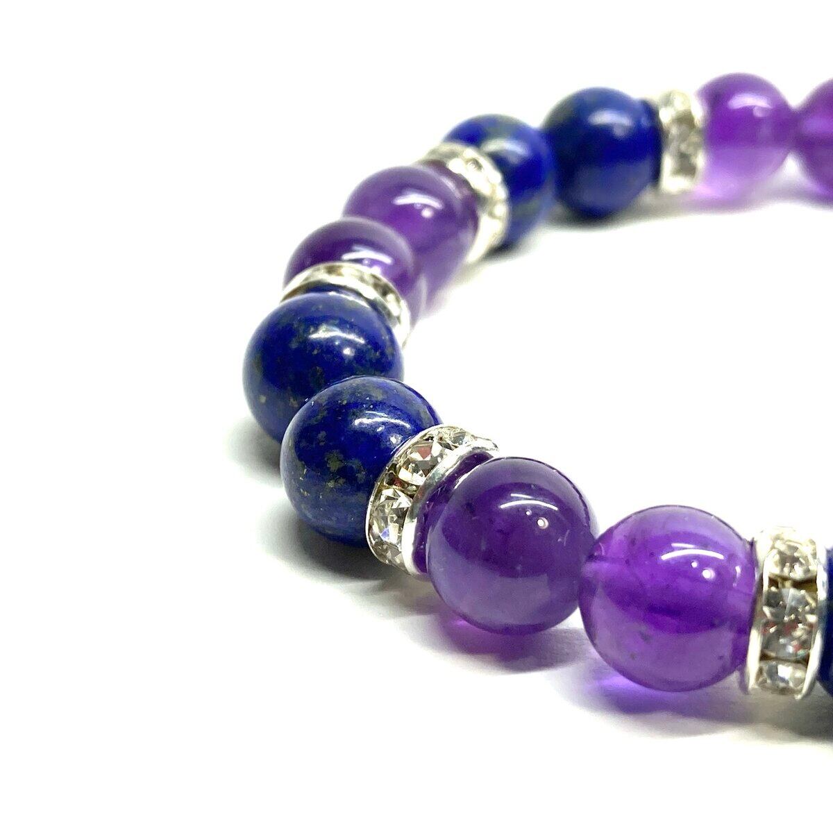 こちらは、8mm玉のラピスラズリとアメジストを使ったパワーストーンブレスレットです。シンプルなデザインでどんなコーディネートにも合わせやすいデザインに仕上げています。サイズは内周 約15cmです。気になる方は是非この機会にどうぞ。