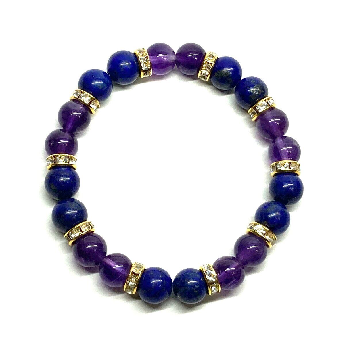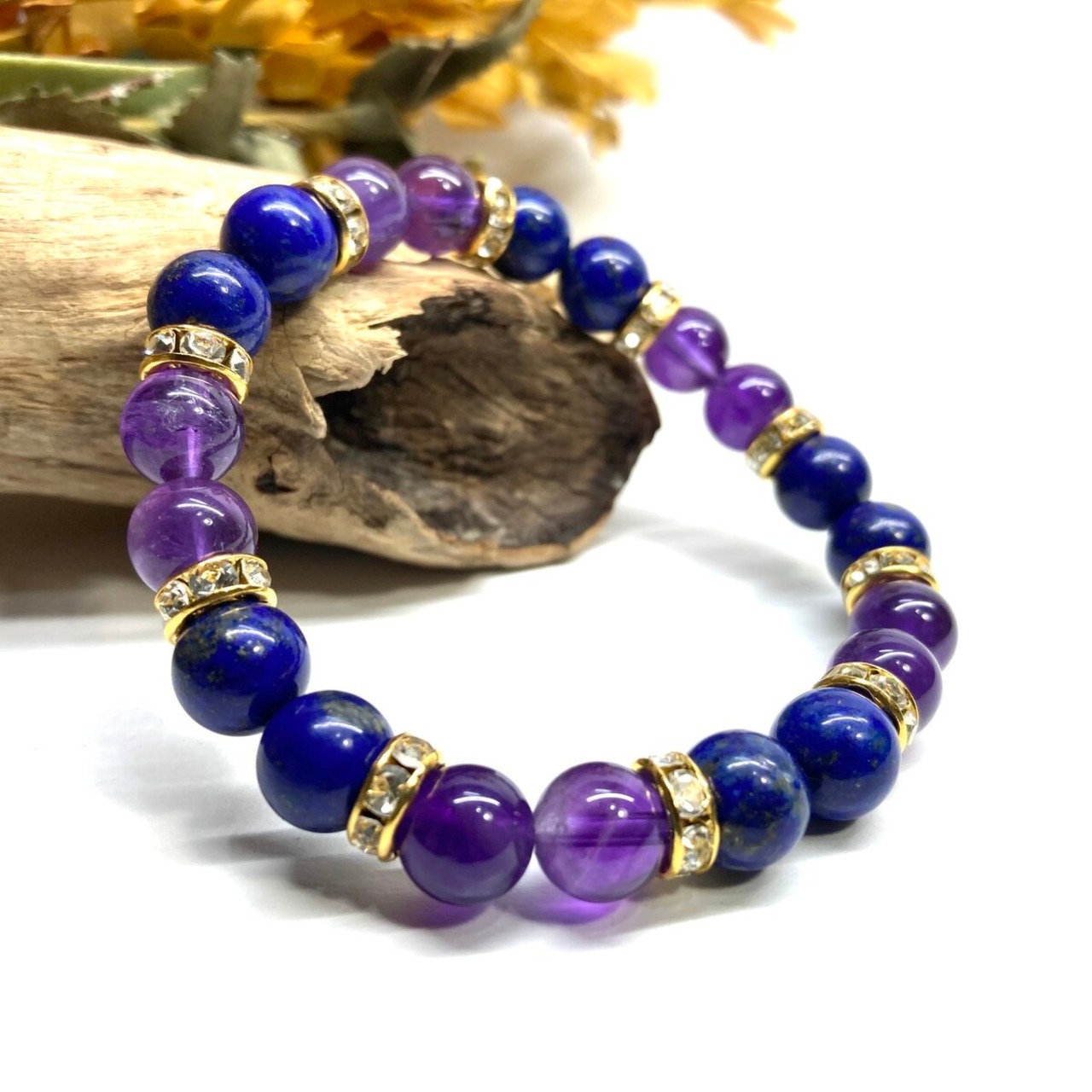 こちらは、8mm玉のラピスラズリとアメジストを使ったパワーストーンブレスレットです。シンプルなデザインでどんなコーディネートにも合わせやすいデザインに仕上げています。サイズは内周 約15cmです。気になる方は是非この機会にどうぞ。