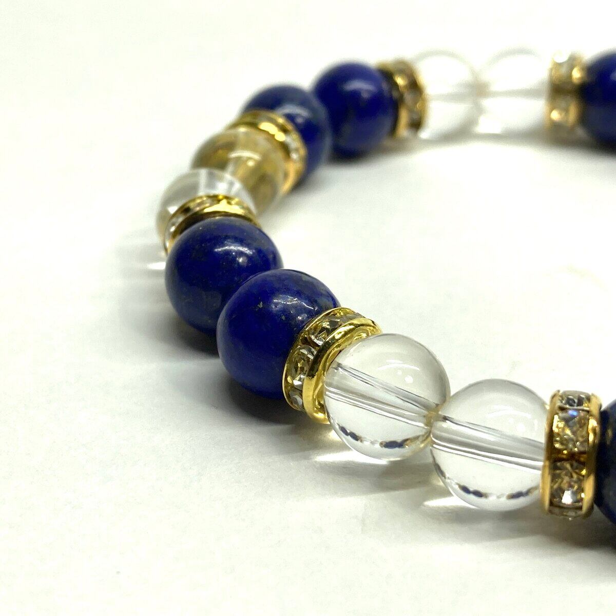 こちらは、8mm玉のラピスラズリと水晶を使ったパワーストーンブレスレットです。シンプルなデザインでどんなコーディネートにも合わせやすいデザインに仕上げています。サイズは内周 約15cmです。気になる方は是非この機会にどうぞ。