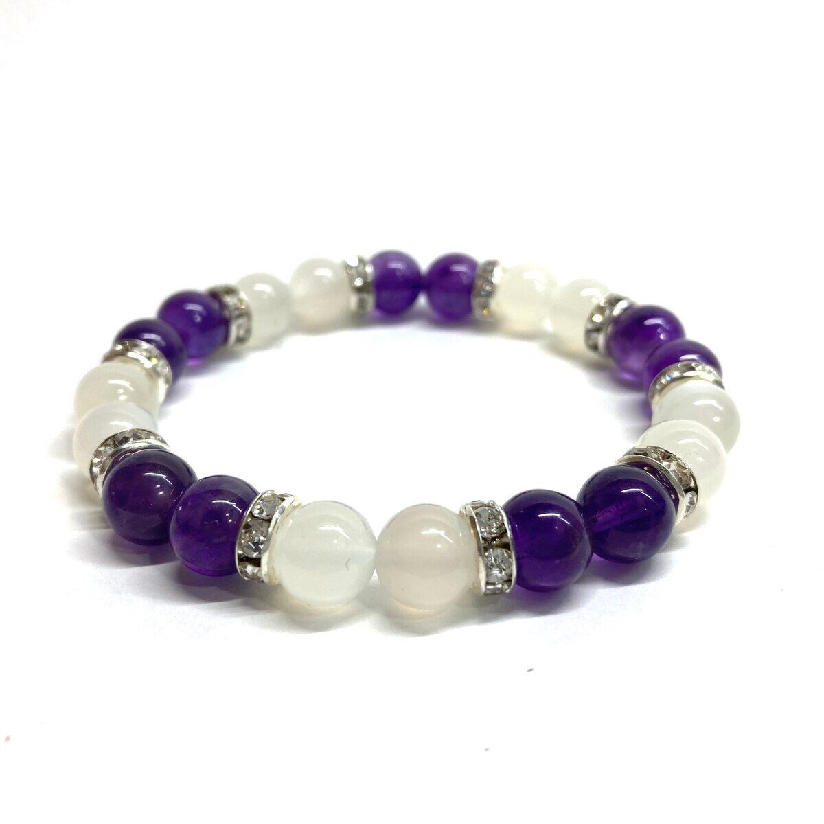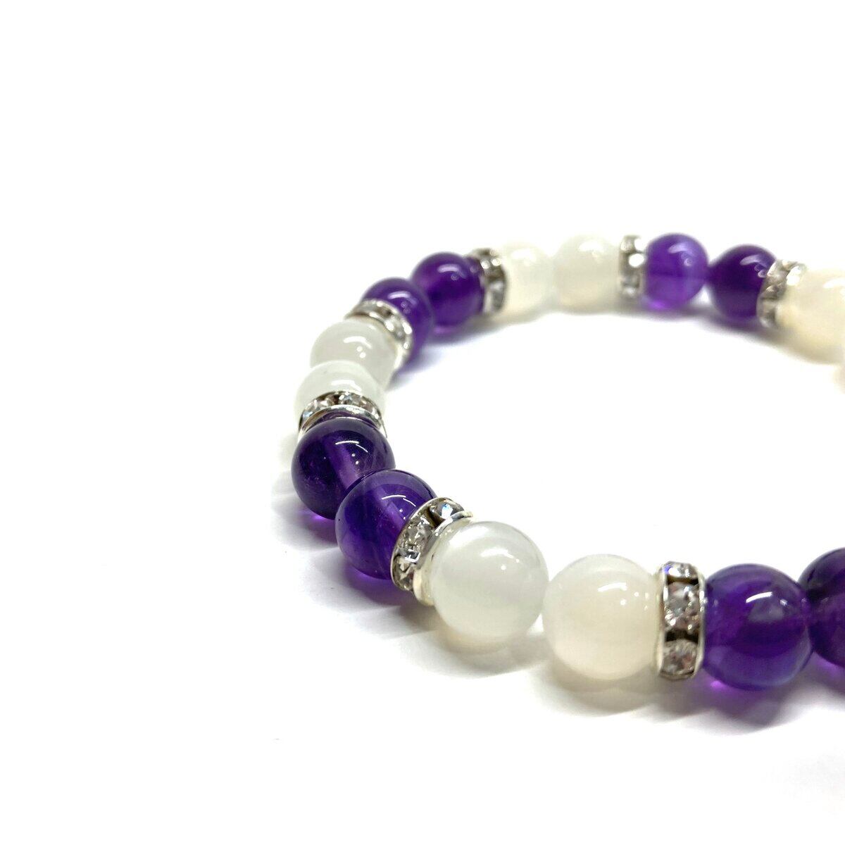 こちらは、8mm玉のムーンストーンとアメジストを使ったパワーストーンブレスレットです。シンプルなデザインでどんなコーディネートにも合わせやすいデザインに仕上げています。サイズは内周 約15cmです。気になる方は是非この機会にどうぞ。