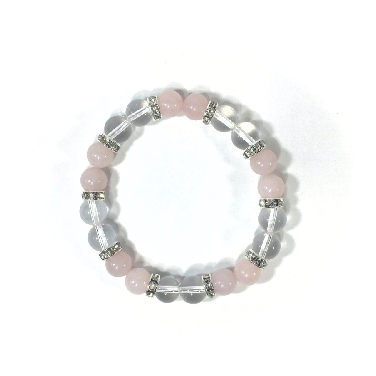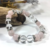 こちらは、8mm玉のローズクォーツと水晶を使ったパワーストーンブレスレットです。シンプルなデザインでどんなコーディネートにも合わせやすいデザインに仕上げています。サイズは内周約15cmです。気になる方は是非この機会にどうぞ。
