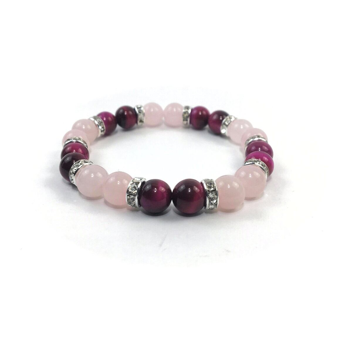 こちらは、8mm玉のローズクォーツとピンクタイガーアイを使ったパワーストーンブレスレットです。シンプルなデザインでどんなコーディネートにも合わせやすいデザインに仕上げています。サイズは内周約15cmです。気になる方は是非この機会にどうぞ。