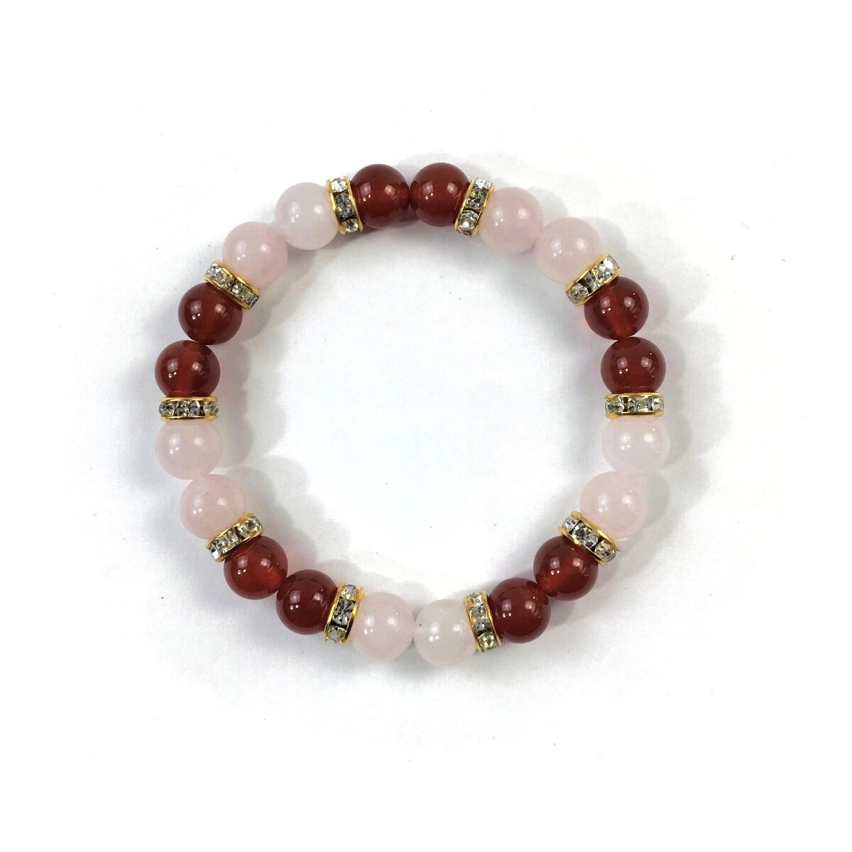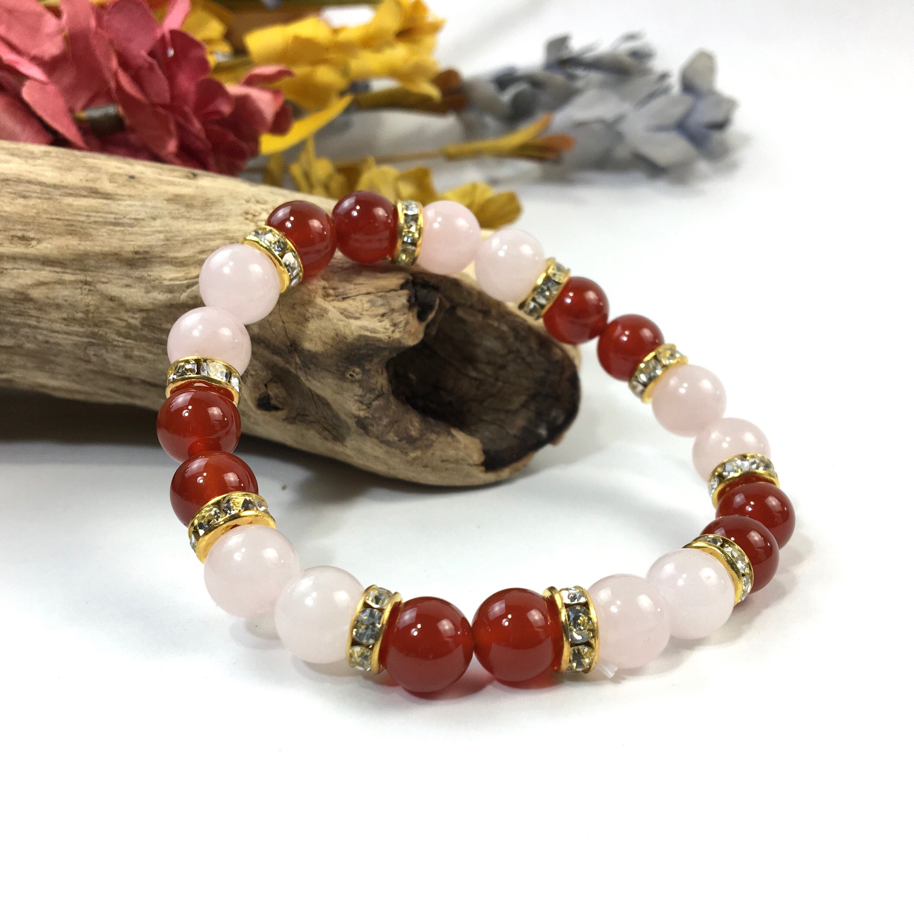 こちらは、8mm玉のローズクォーツと赤メノウを使ったパワーストーンブレスレットです。シンプルなデザインでどんなコーディネートにも合わせやすいデザインに仕上げています。サイズは内周約15cmです。気になる方は是非この機会にどうぞ。
