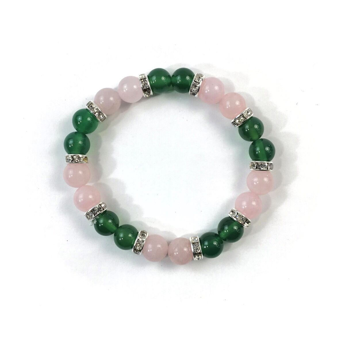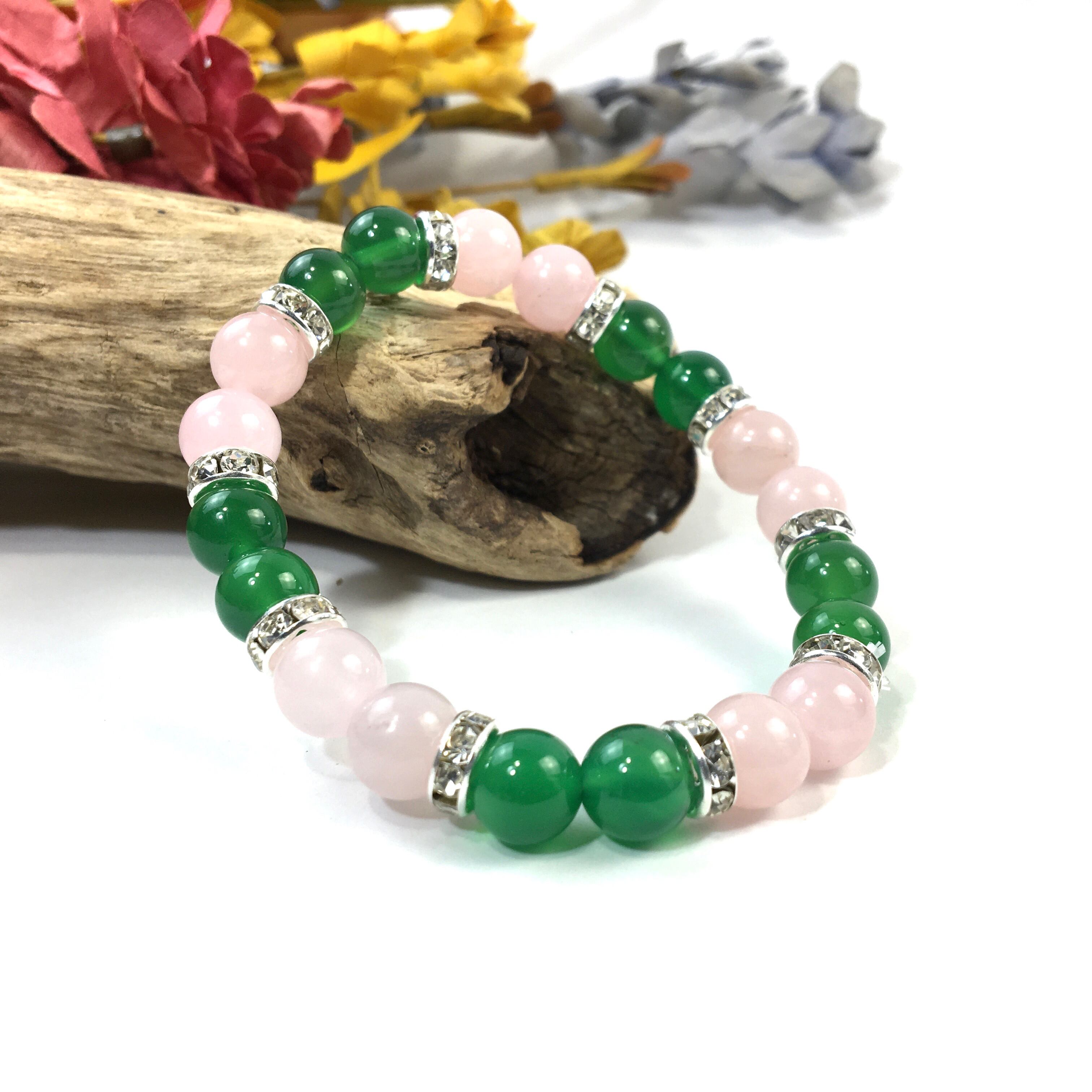 こちらは、8mm玉のローズクォーツと緑瑪瑙を使ったパワーストーンブレスレットです。シンプルなデザインでどんなコーディネートにも合わせやすいデザインに仕上げています。サイズは内周約15cmです。気になる方は是非この機会にどうぞ。