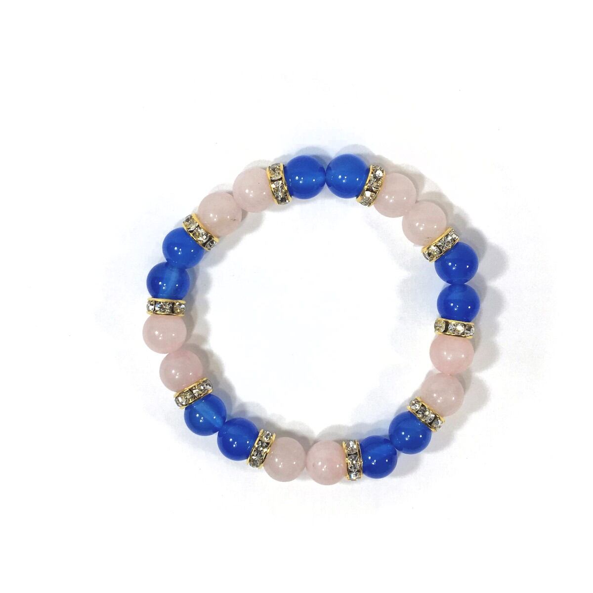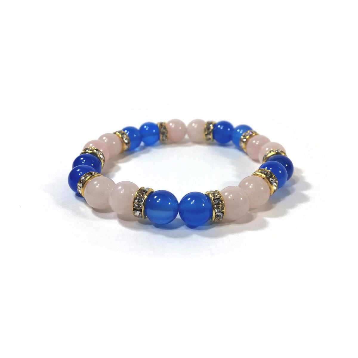 こちらは、8mm玉のローズクォーツとブルーメノウを使ったパワーストーンブレスレットです。シンプルなデザインでどんなコーディネートにも合わせやすいデザインに仕上げています。サイズは内周約15cmです。気になる方は是非この機会にどうぞ。