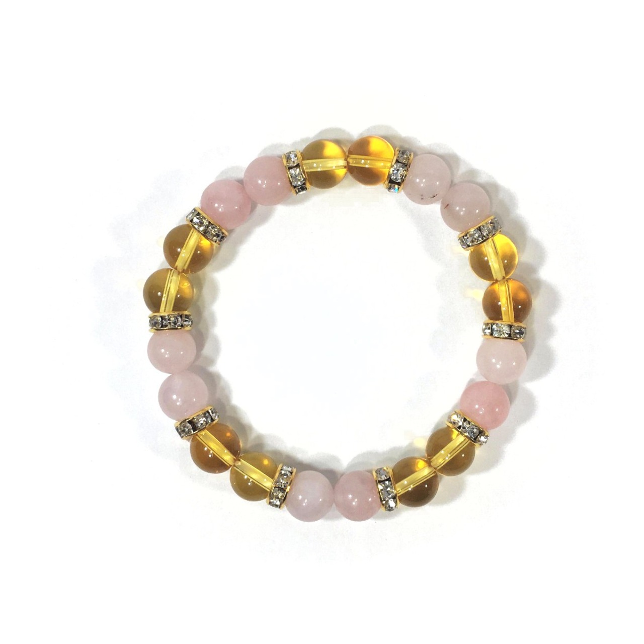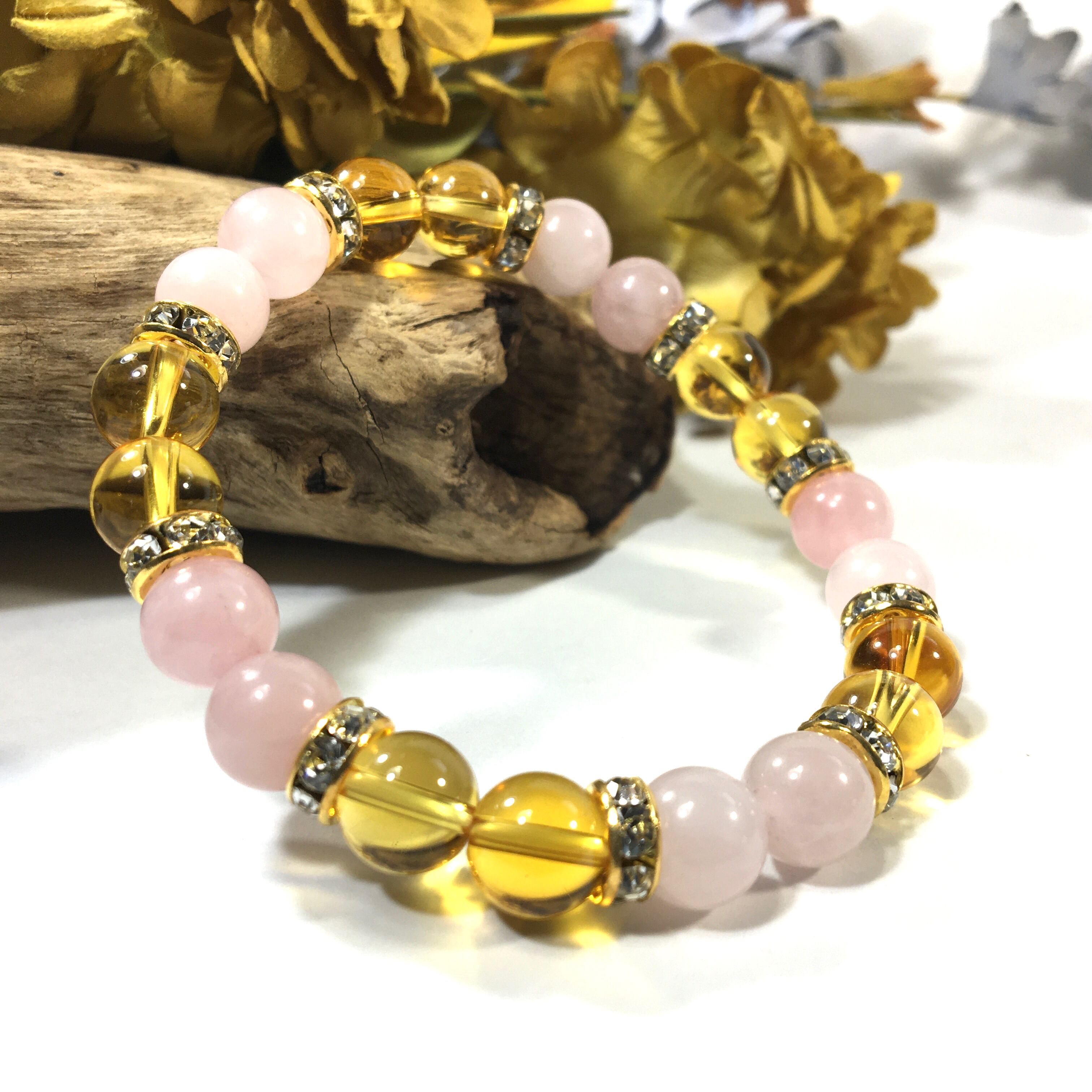 こちらは、8mm玉のローズクォーツとシトリンを使ったパワーストーンブレスレットです。シンプルなデザインでどんなコーディネートにも合わせやすいデザインに仕上げています。サイズは内周約15cmです。気になる方は是非この機会にどうぞ。