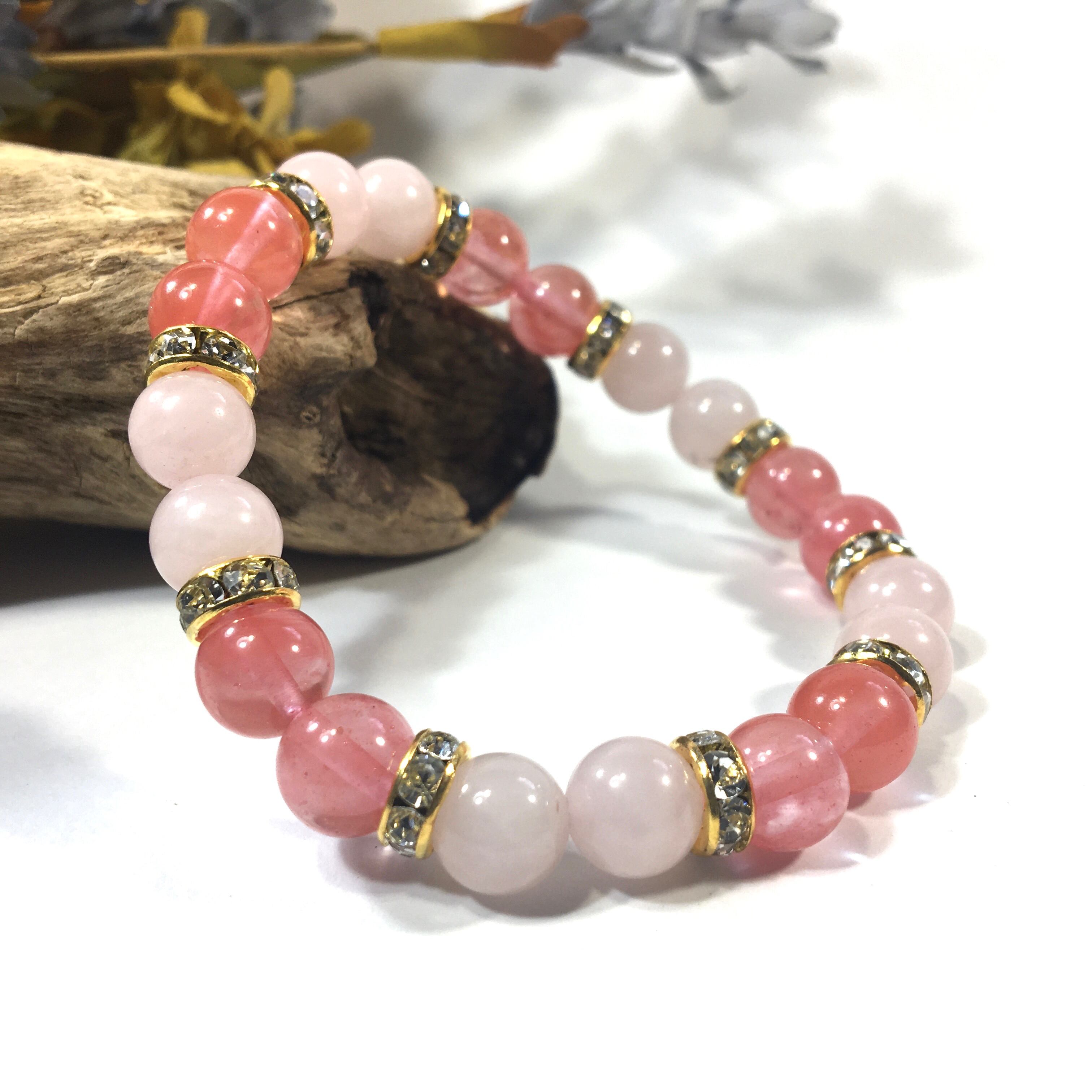 ローズクォーツ&チェリークォーツ パワーストーン ブレスレット 8mm(ゴールド)レディース 女性 数珠ブレス 開運 プレゼント ギフト