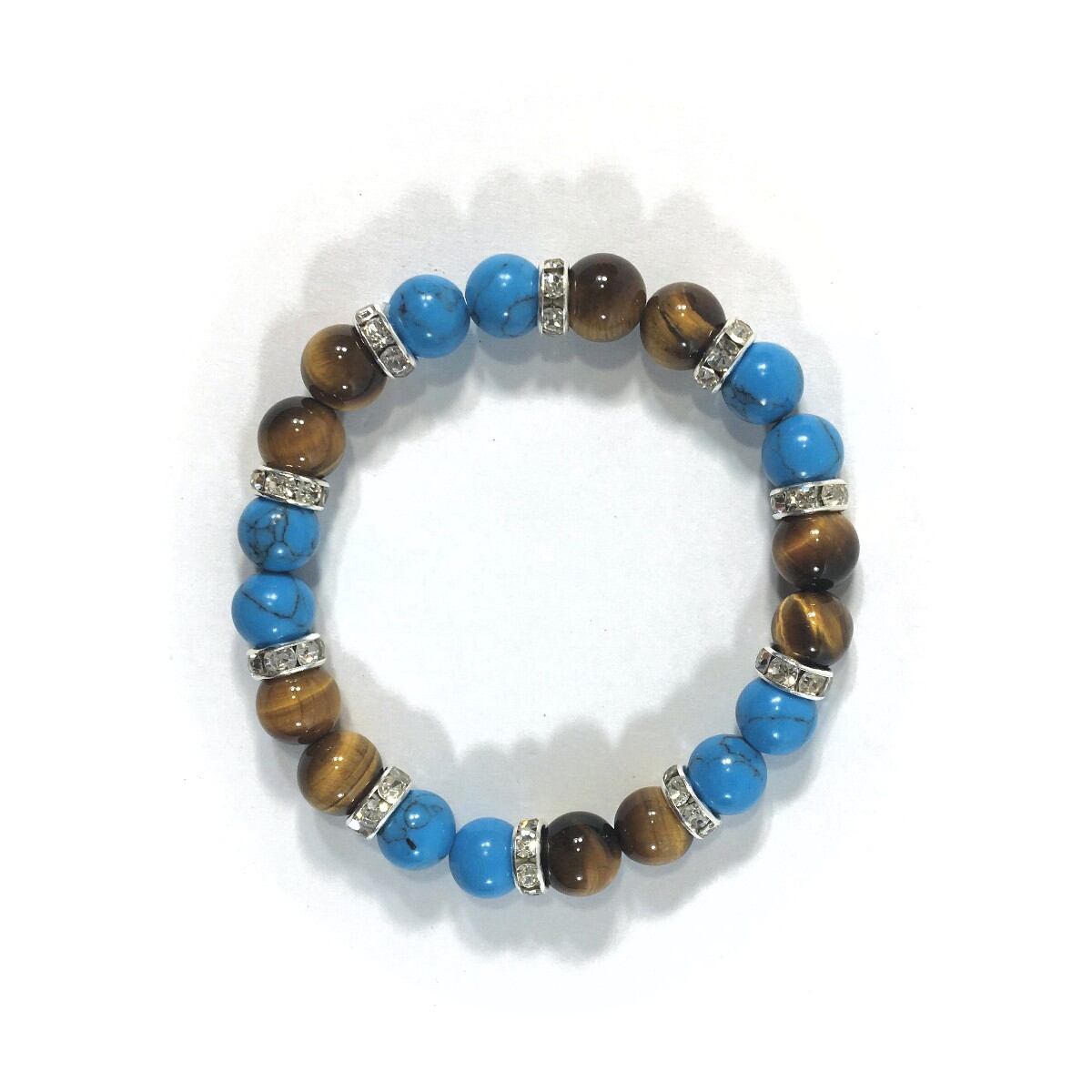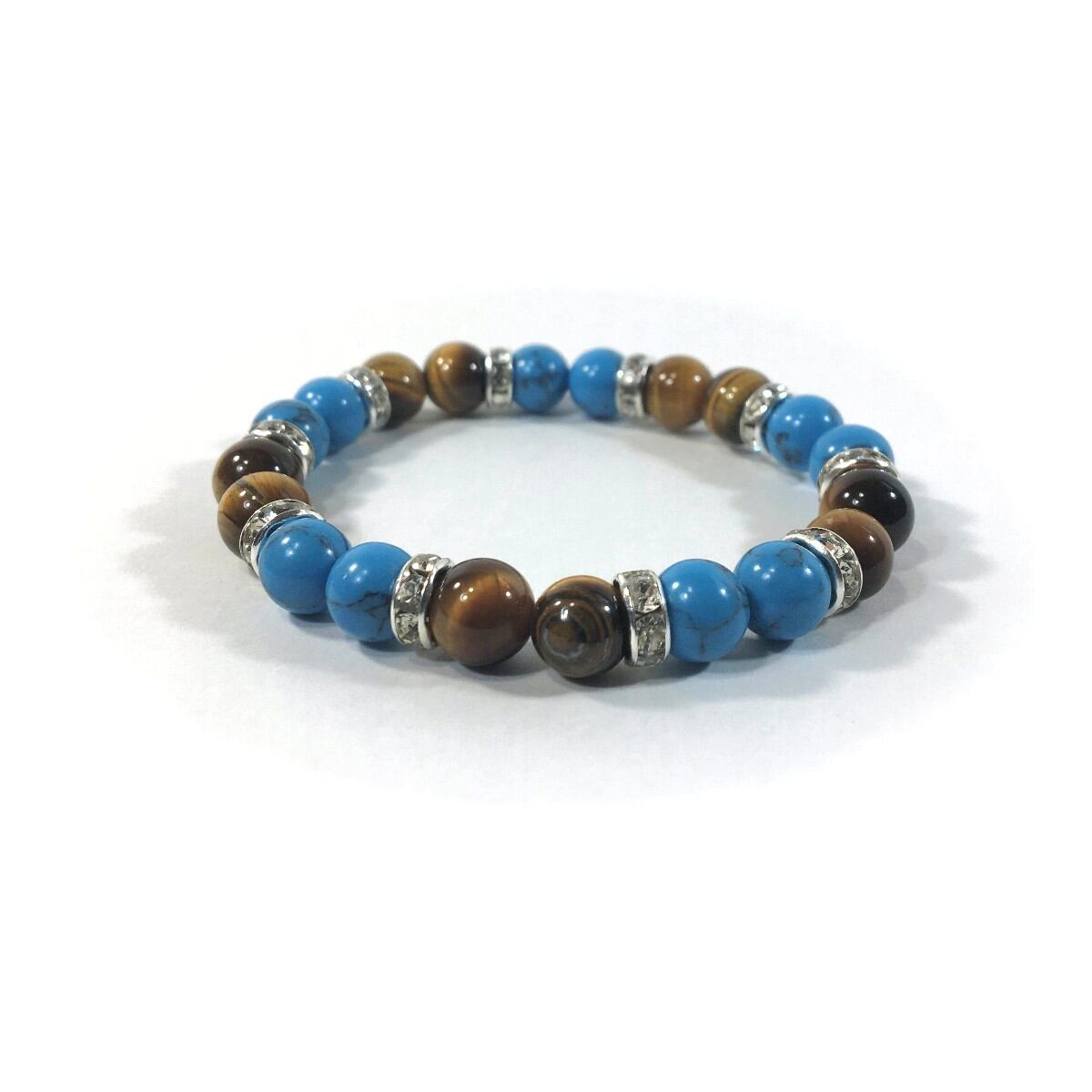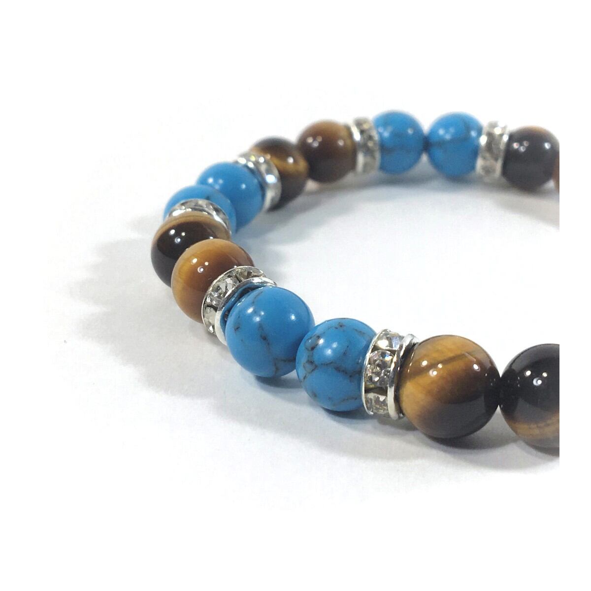 こちらは、8mm玉のターコイズとタイガーアイを使ったパワーストーンブレスレットです。シンプルなデザインでどんなコーディネートにも合わせやすいデザインに仕上げています。サイズは内周約15cmです。気になる方は是非この機会にどうぞ。