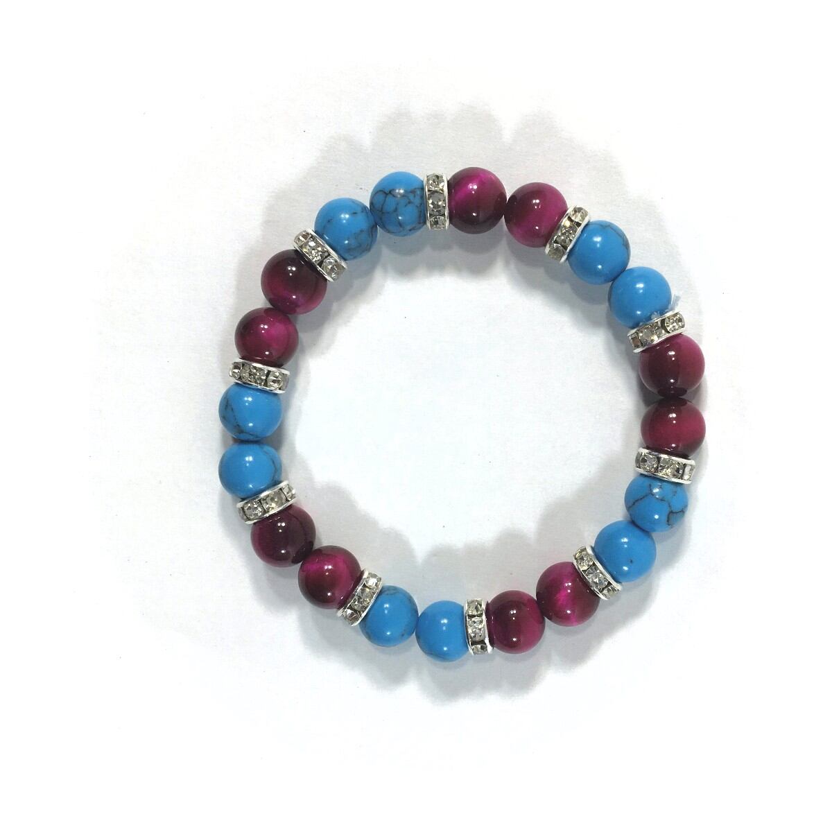 こちらは、8mm玉のターコイズ とピンクタイガーアイを使ったパワーストーンブレスレットです。シンプルなデザインでどんなコーディネートにも合わせやすいデザインに仕上げています。サイズは内周約15cmです。気になる方は是非この機会にどうぞ。