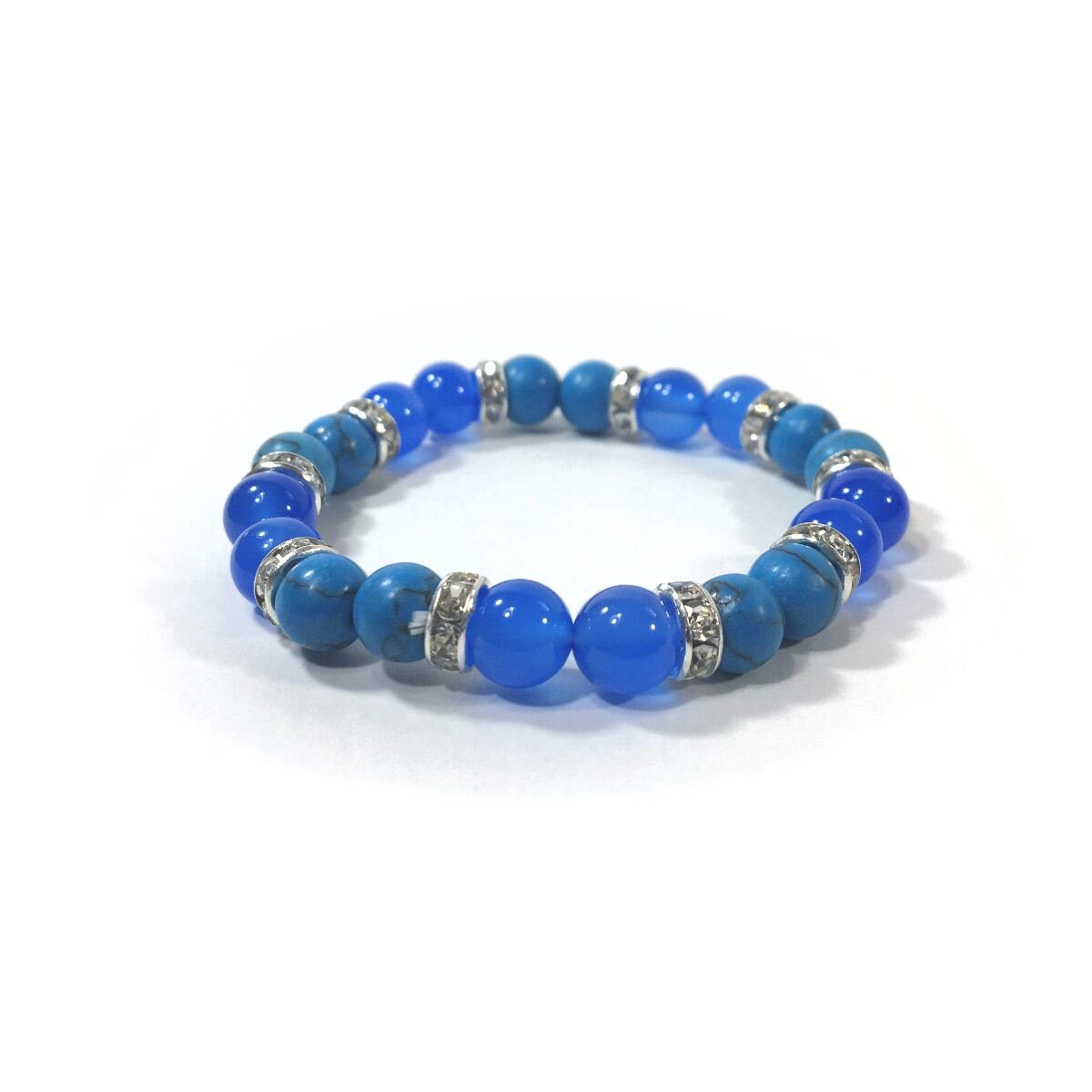 こちらは、8mm玉のターコイズとブルーメノウを使ったパワーストーンブレスレットです。シンプルなデザインでどんなコーディネートにも合わせやすいデザインに仕上げています。サイズは内周約15cmです。気になる方は是非この機会にどうぞ。