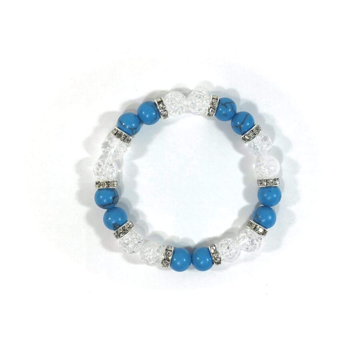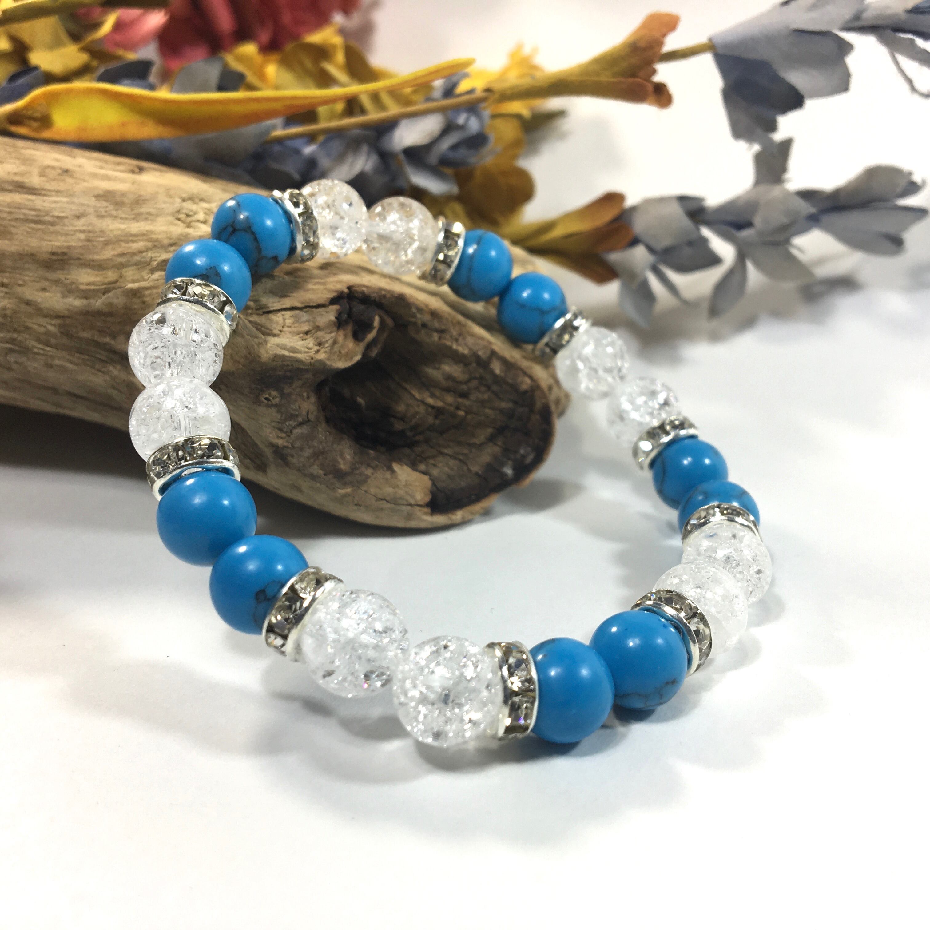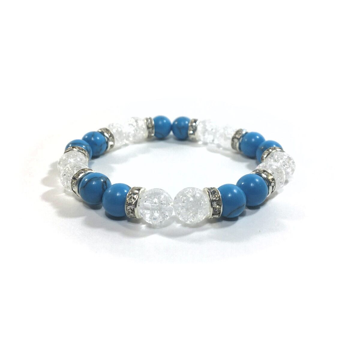 こちらは、8mm玉のターコイズとクラック水晶を使ったパワーストーンブレスレットです。シンプルなデザインでどんなコーディネートにも合わせやすいデザインに仕上げています。サイズは内周約15cmです。気になる方は是非この機会にどうぞ。