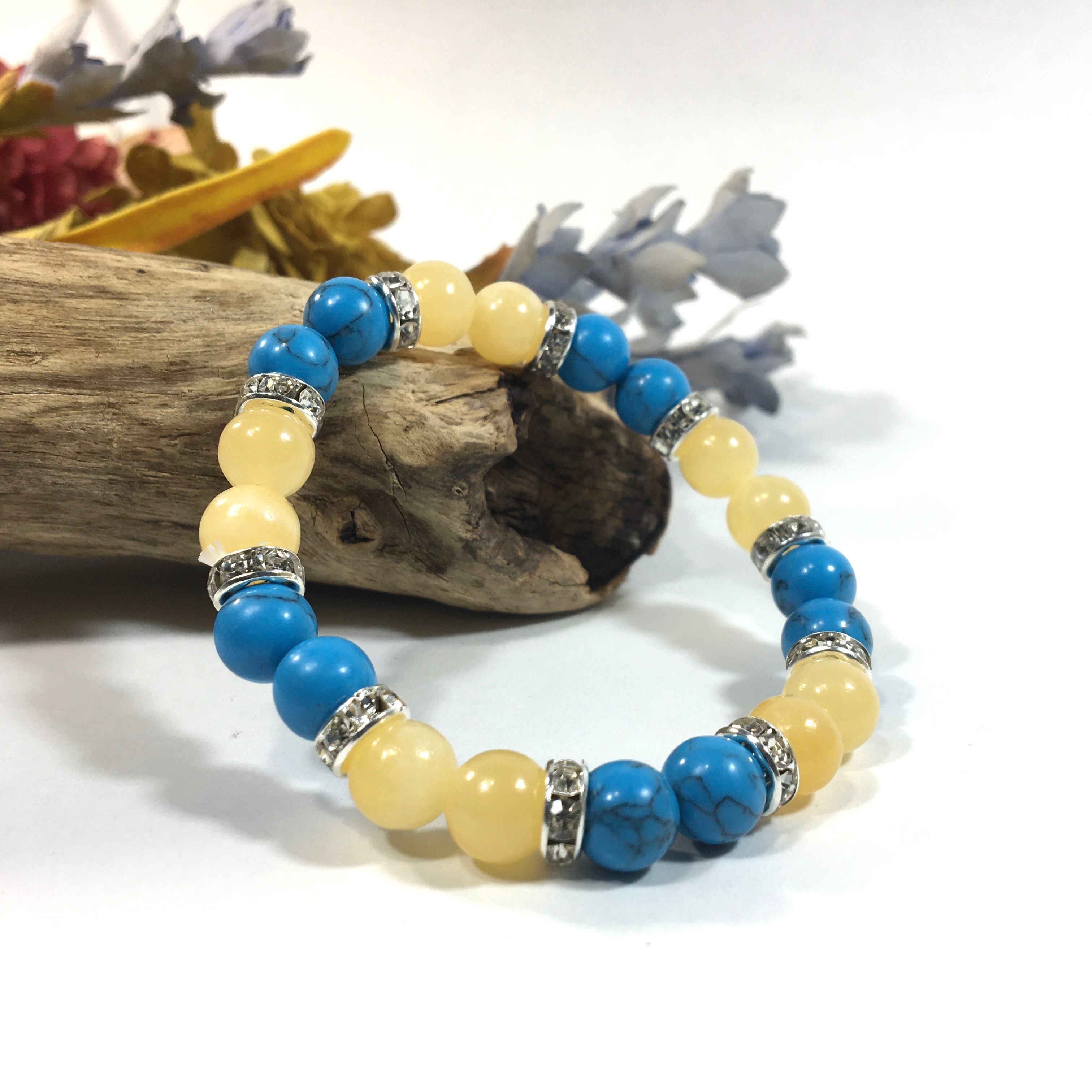 こちらは、8mm玉のターコイズとアラゴナイトを使ったパワーストーンブレスレットです。シンプルなデザインでどんなコーディネートにも合わせやすいデザインに仕上げています。サイズは内周約15cmです。気になる方は是非この機会にどうぞ。