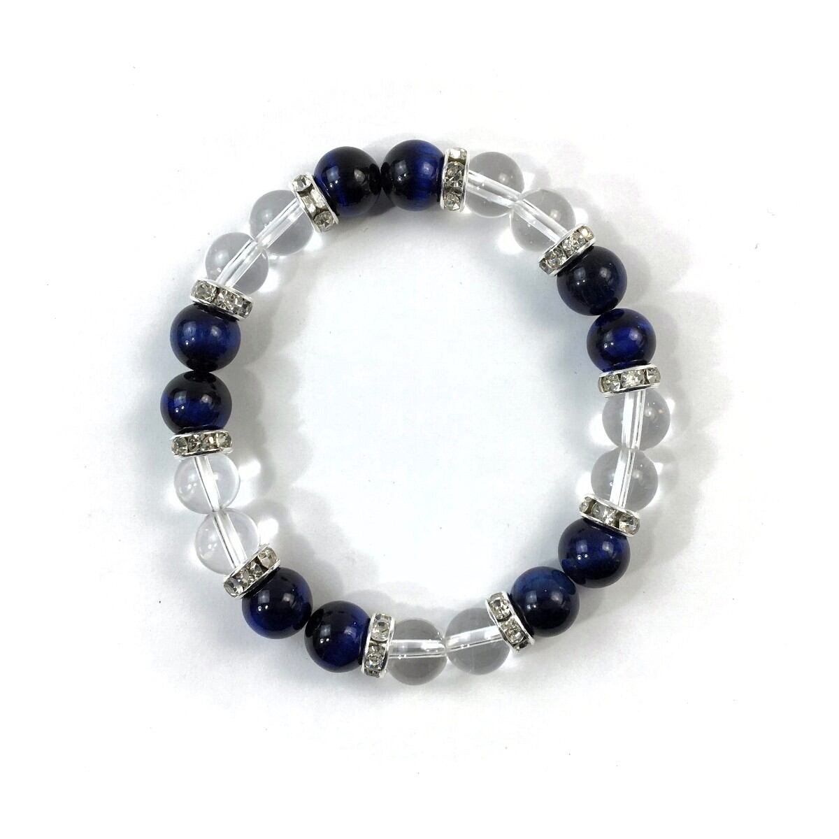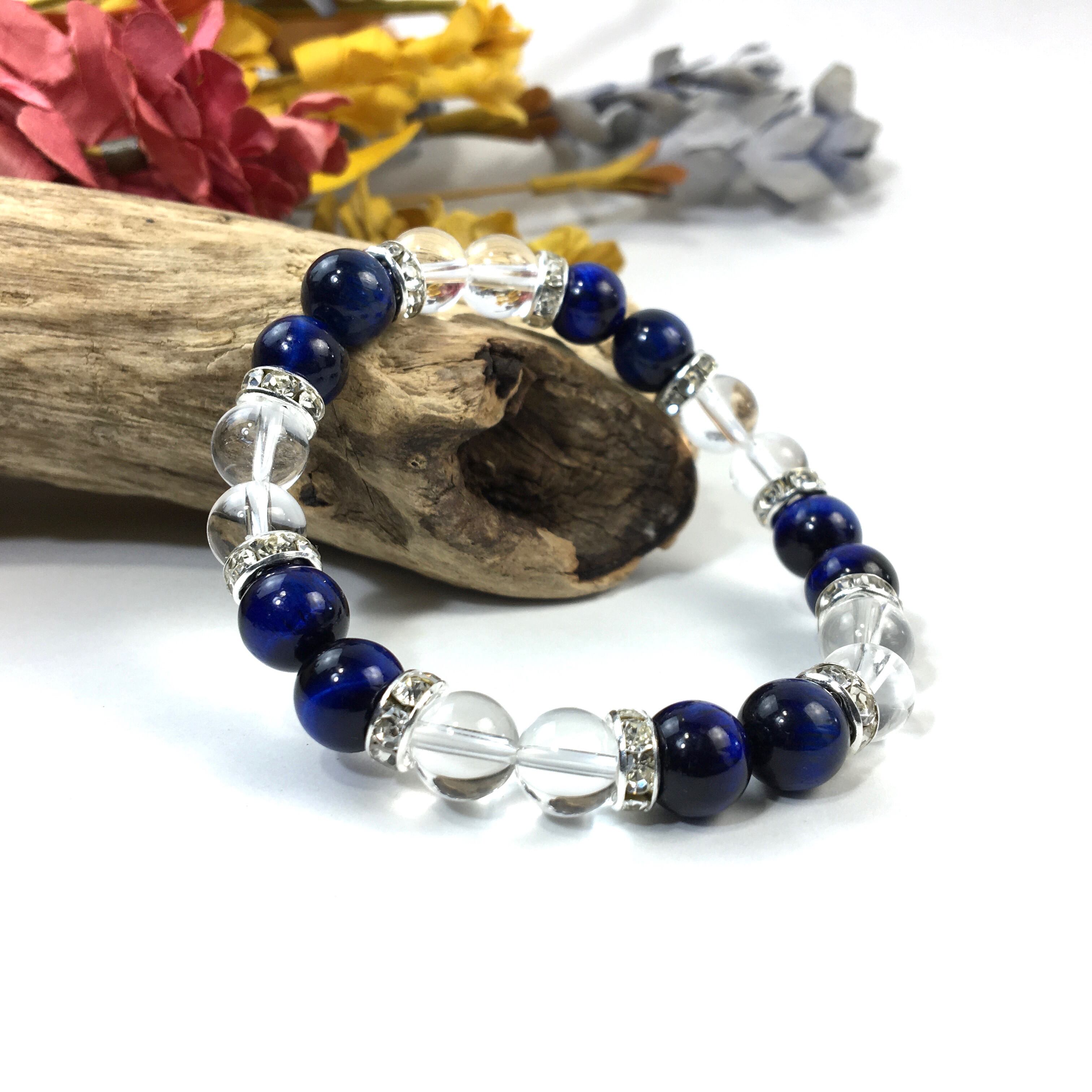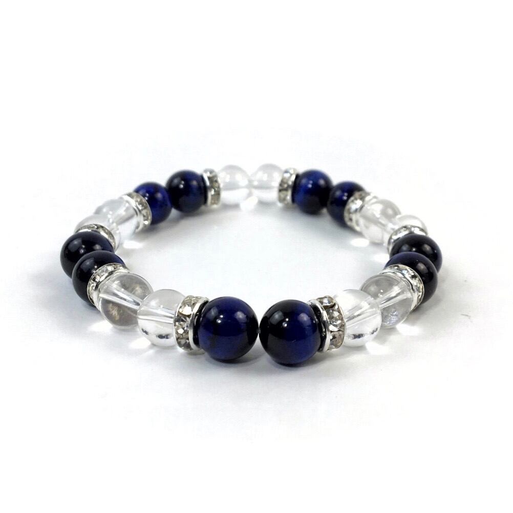 こちらは、8mm玉の水晶とブルータイガーアイを使ったパワーストーンブレスレットです。シンプルなデザインでどんなコーディネートにも合わせやすいデザインに仕上げています。サイズは内周約15cmです。気になる方は是非この機会にどうぞ。