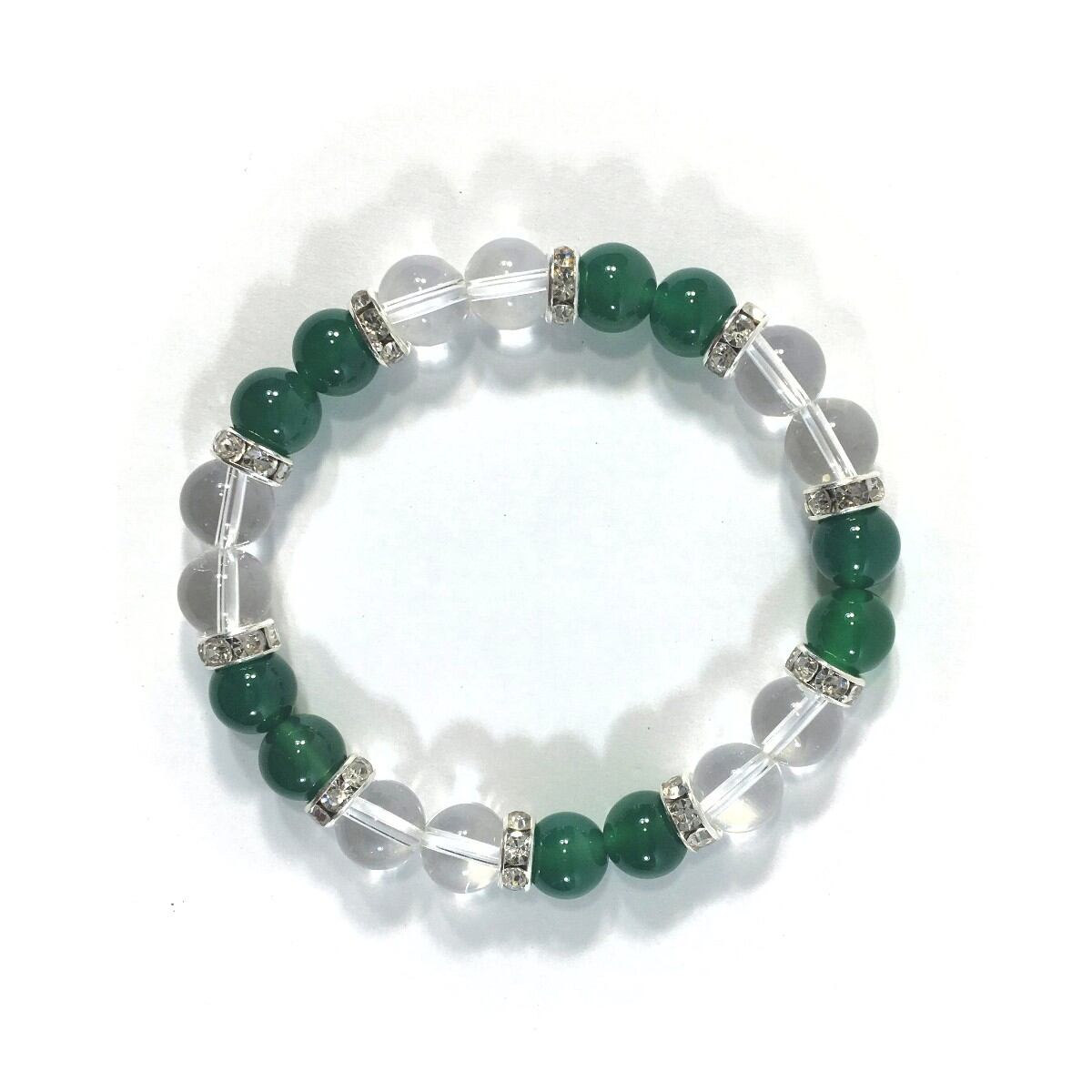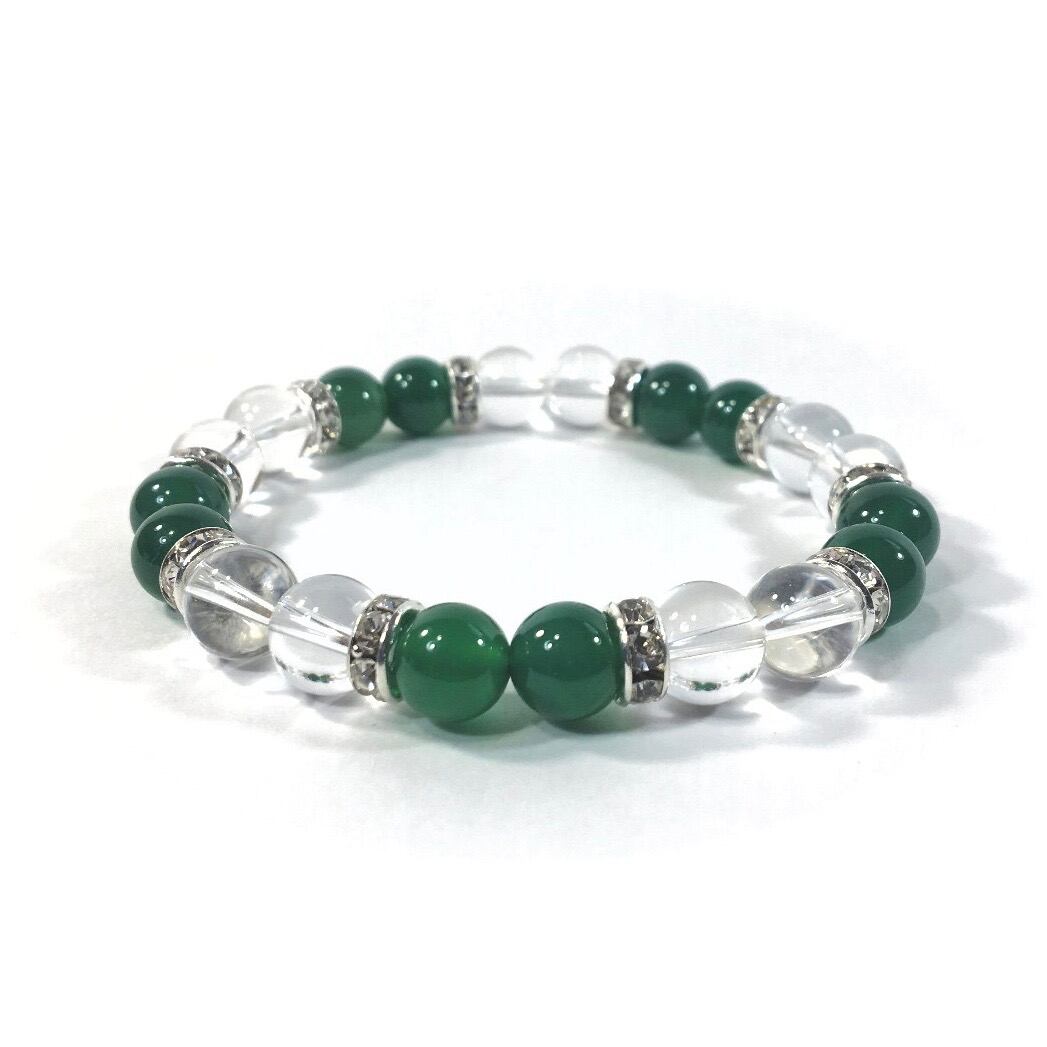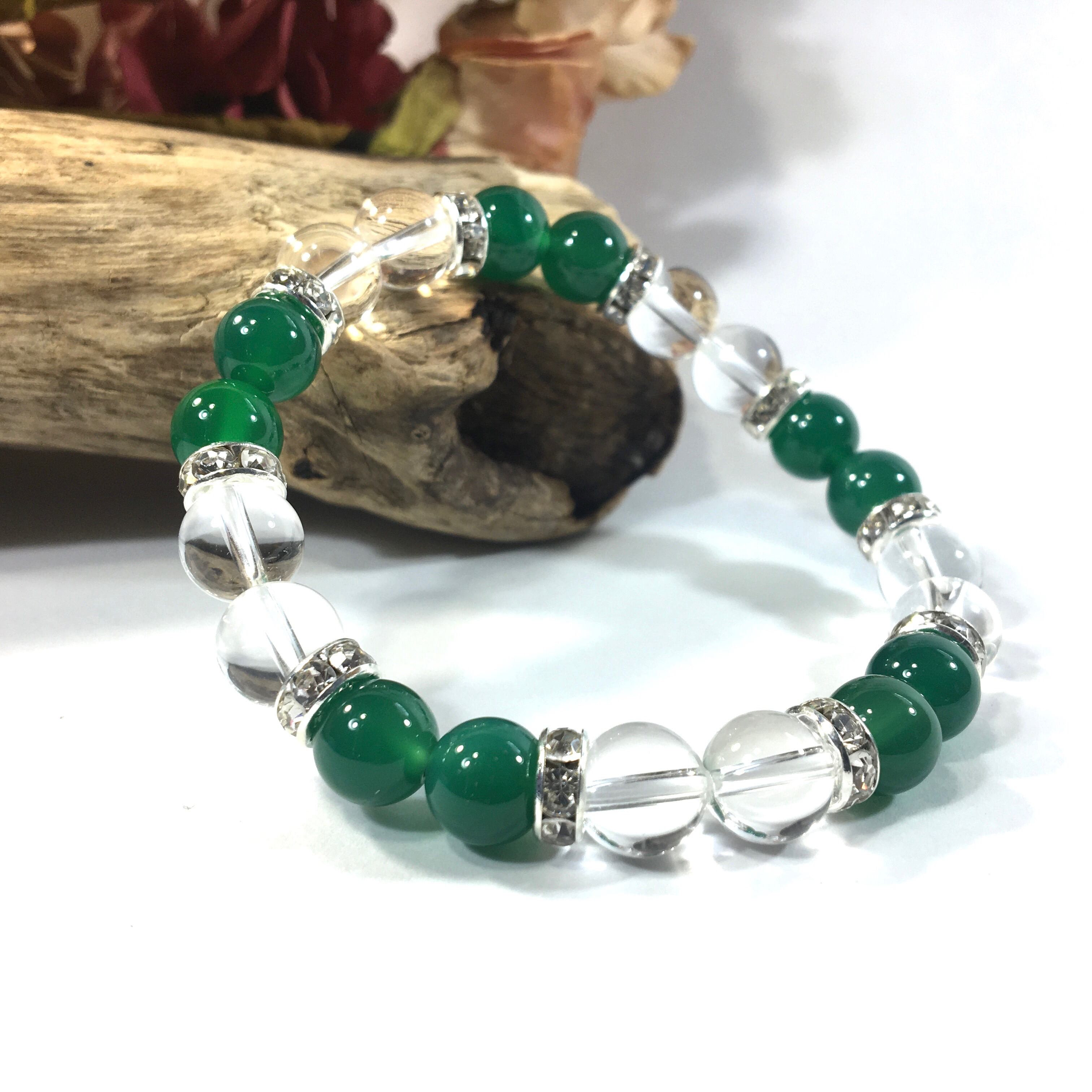 こちらは、8mm玉の水晶と緑瑪瑙を使ったパワーストーンブレスレットです。シンプルなデザインでどんなコーディネートにも合わせやすいデザインに仕上げています。サイズは内周約15cmです。気になる方は是非この機会にどうぞ。