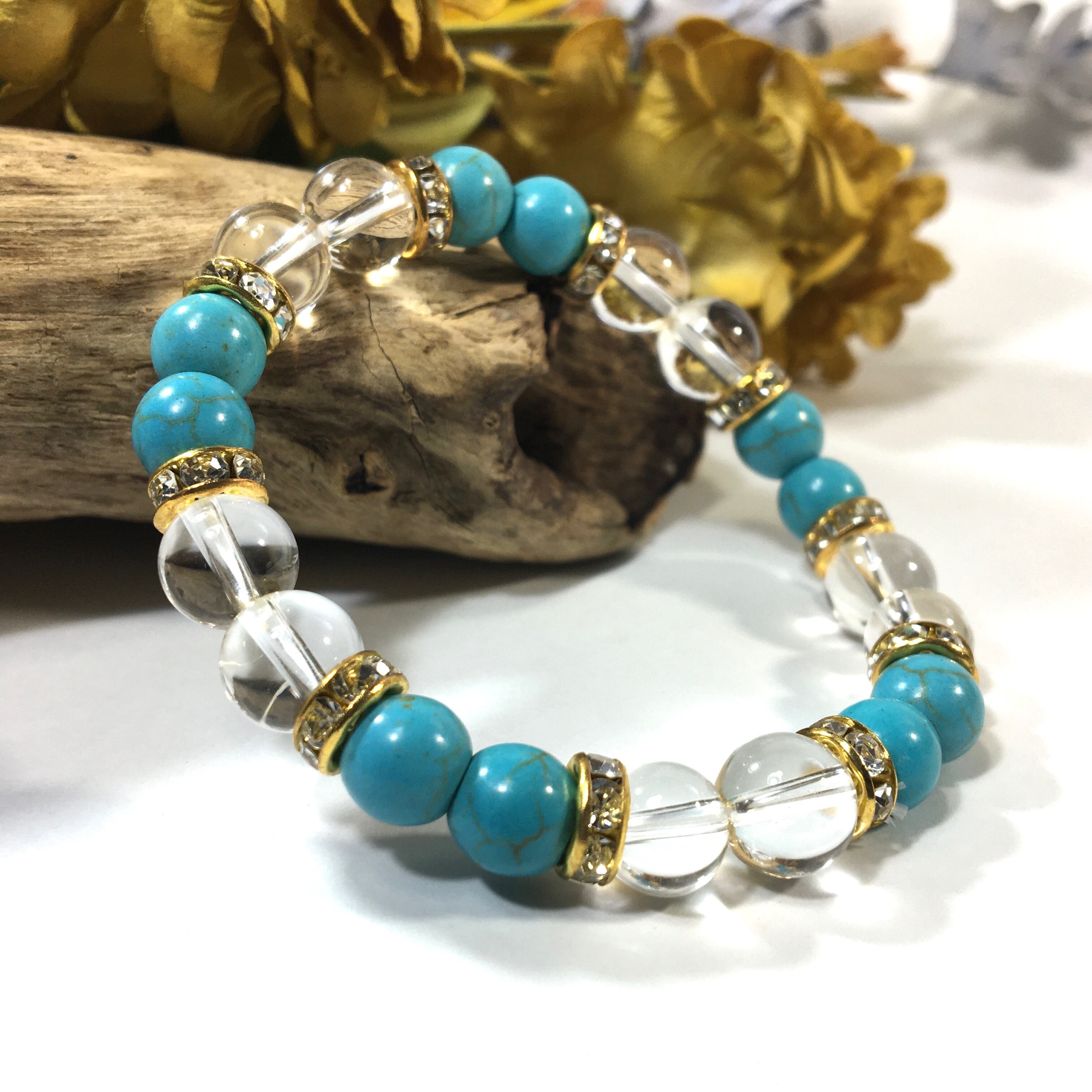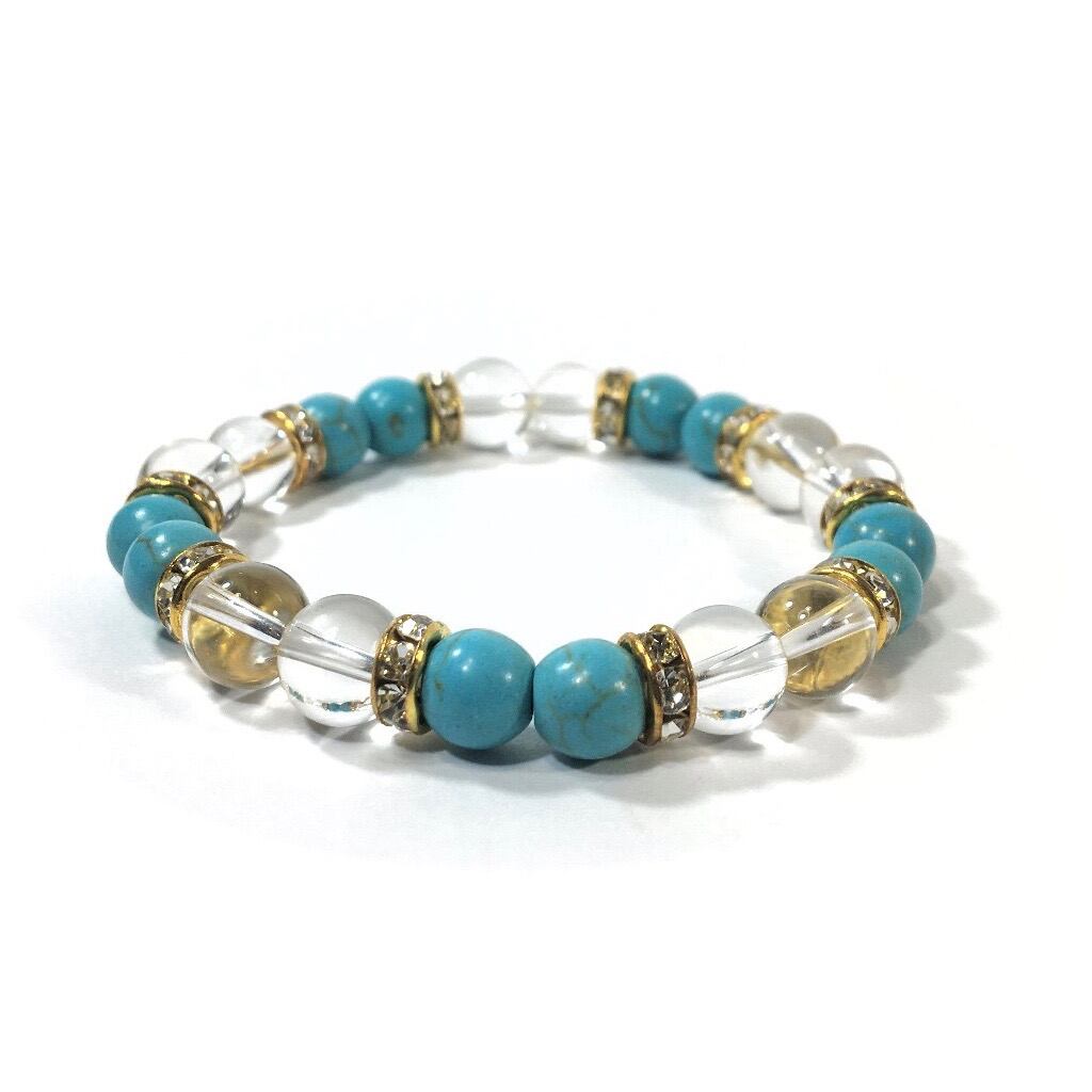 こちらは、8mm玉の水晶とターコイズを使ったパワーストーンブレスレットです。シンプルなデザインでどんなコーディネートにも合わせやすいデザインに仕上げています。サイズは内周約15cmです。気になる方は是非この機会にどうぞ。