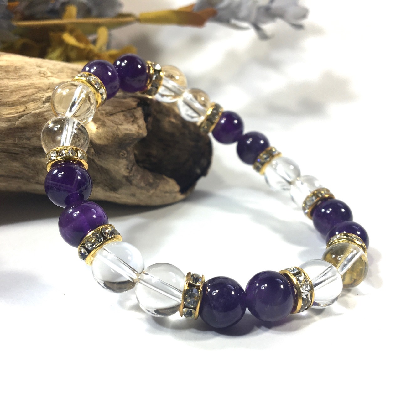 こちらは、8mm玉の水晶とアメジストを使ったパワーストーンブレスレットです。シンプルなデザインでどんなコーディネートにも合わせやすいデザインに仕上げています。サイズは内周約15cmです。気になる方は是非この機会にどうぞ。