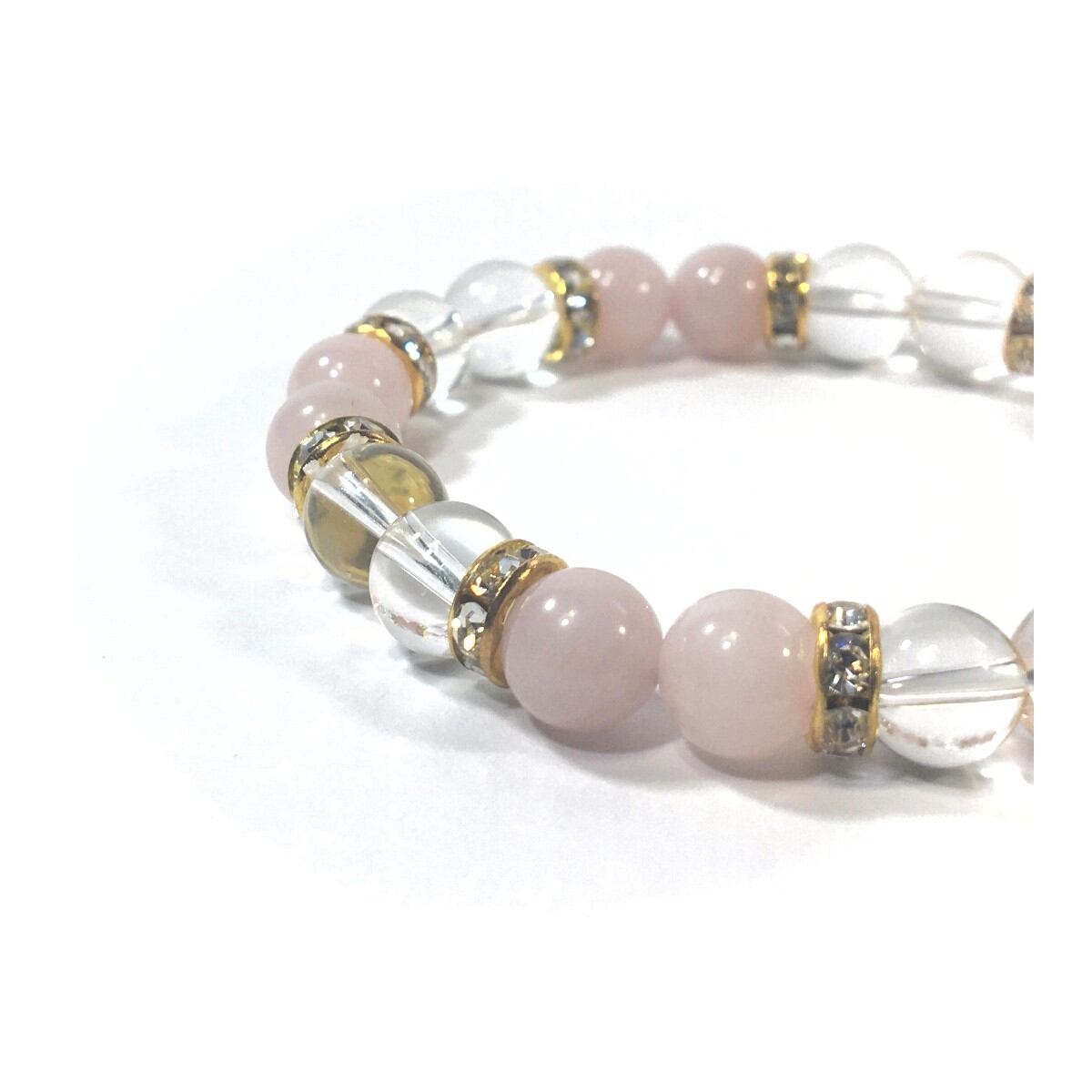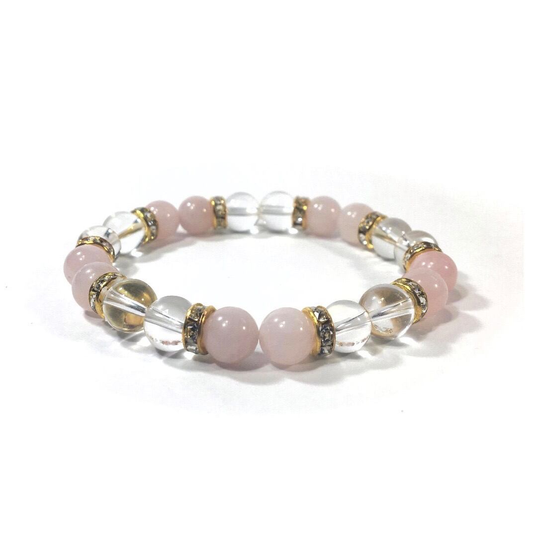 こちらは、8mm玉の水晶とローズクォーツを使ったパワーストーンブレスレットです。シンプルなデザインでどんなコーディネートにも合わせやすいデザインに仕上げています。サイズは内周約15cmです。気になる方は是非この機会にどうぞ。