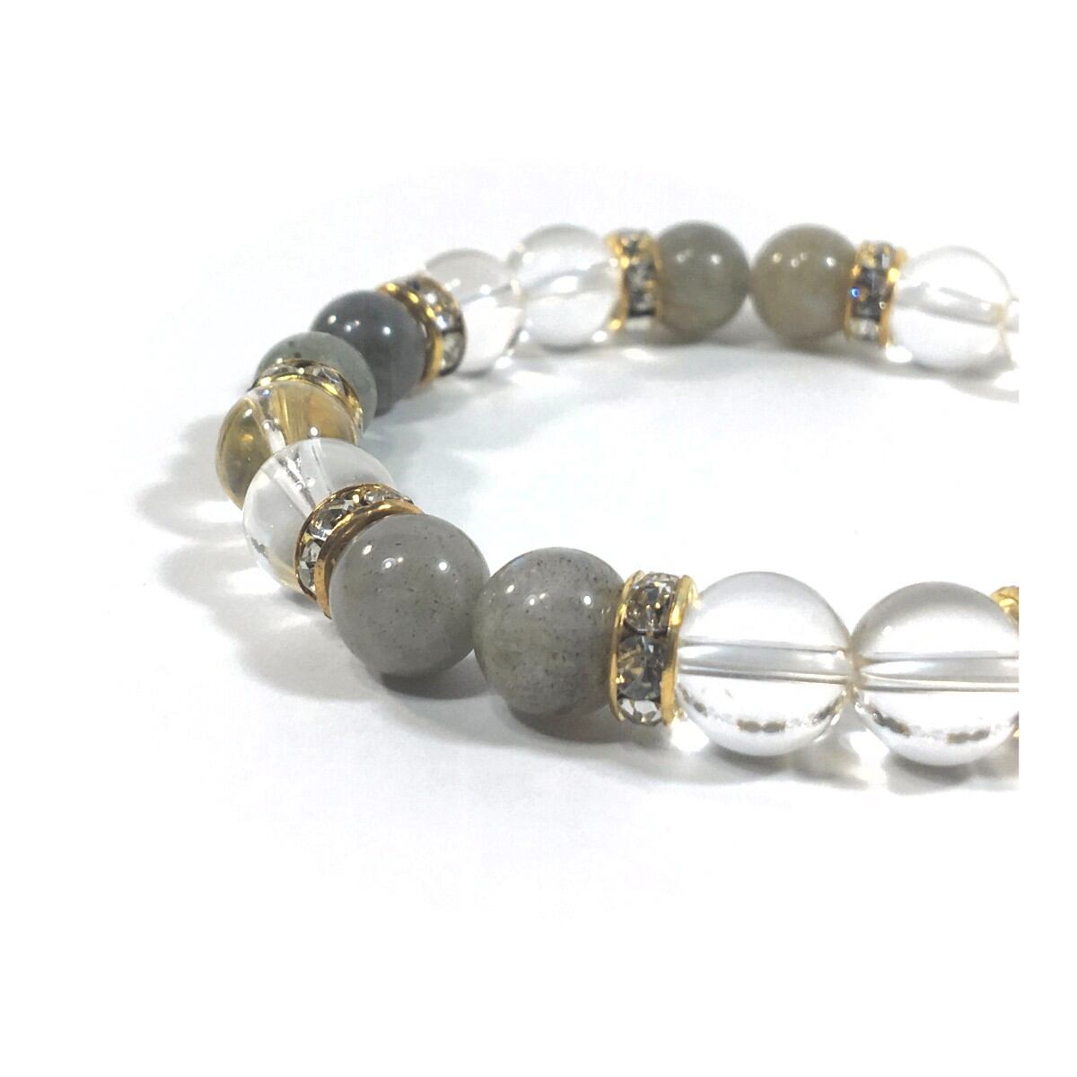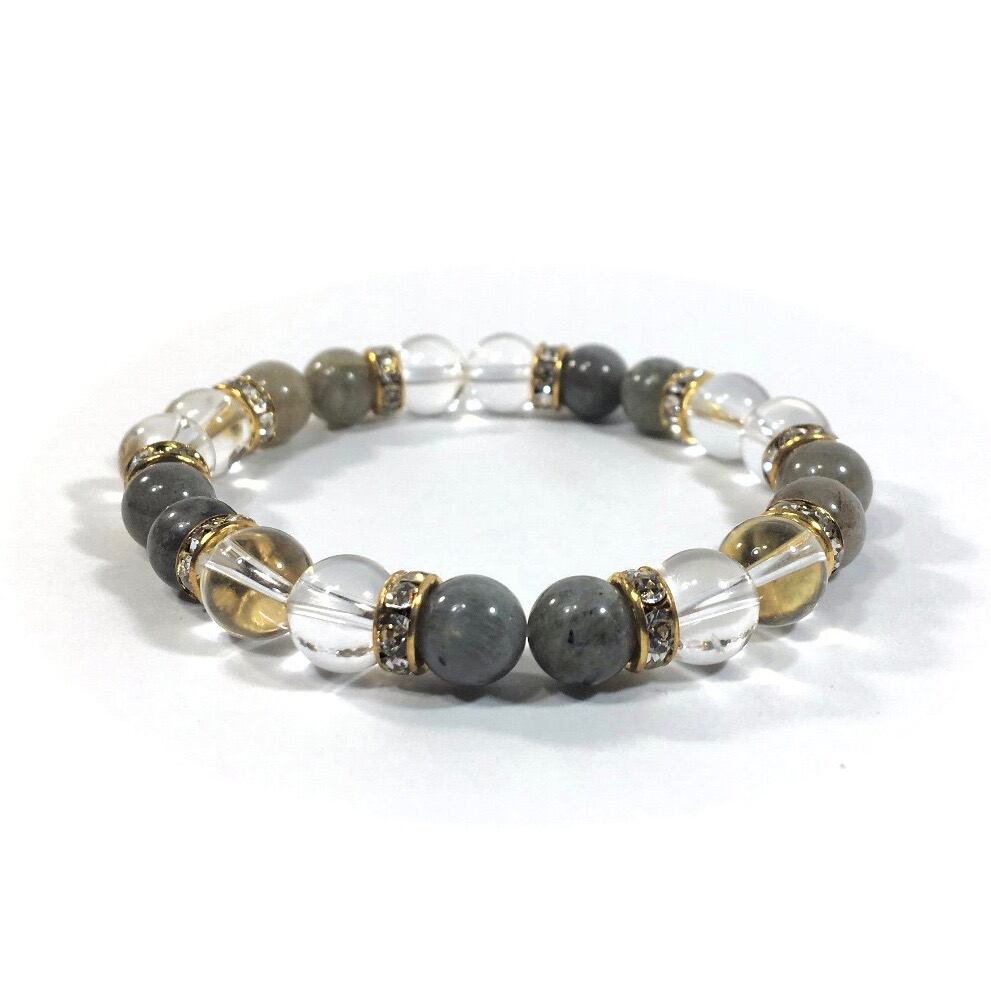 こちらは、8mm玉の水晶とラブラドライトを使ったパワーストーンブレスレットです。シンプルなデザインでどんなコーディネートにも合わせやすいデザインに仕上げています。サイズは内周約15cmです。気になる方は是非この機会にどうぞ。
