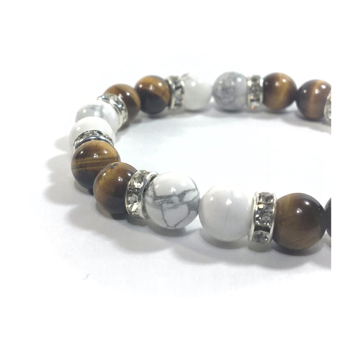 こちらは、8mm玉のハウライトとタイガーアイを使ったパワーストーンブレスレットです。シンプルなデザインでどんなコーディネートにも合わせやすいデザインに仕上げています。サイズは内周約15cmです。気になる方は是非この機会にどうぞ。