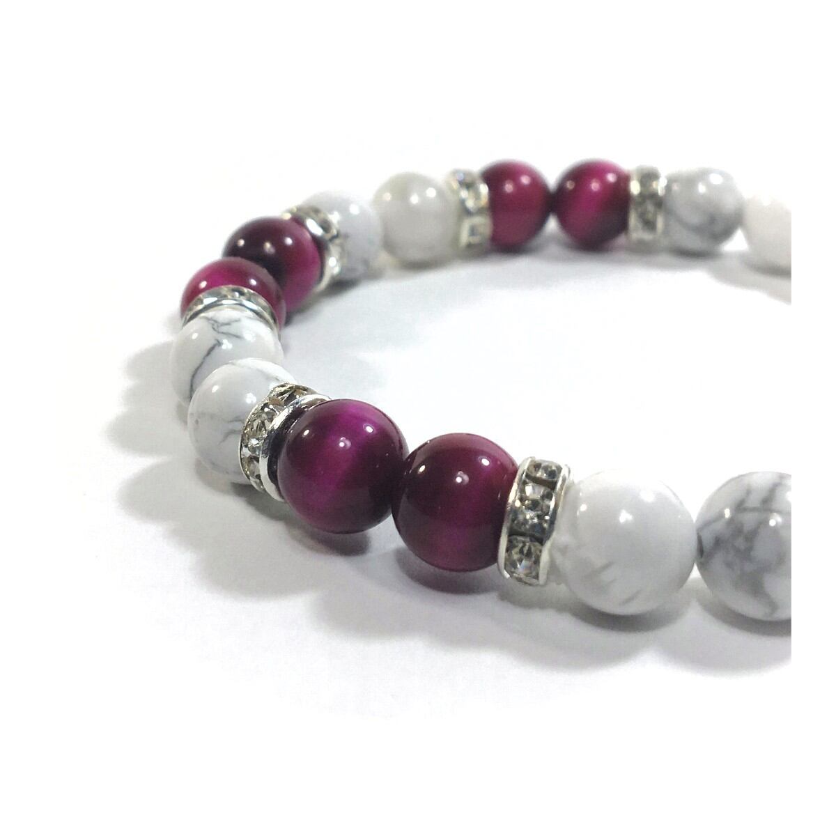 こちらは、8mm玉のハウライトとピンクタイガーアイを使ったパワーストーンブレスレットです。シンプルなデザインでどんなコーディネートにも合わせやすいデザインに仕上げています。サイズは内周約15cmです。気になる方は是非この機会にどうぞ。