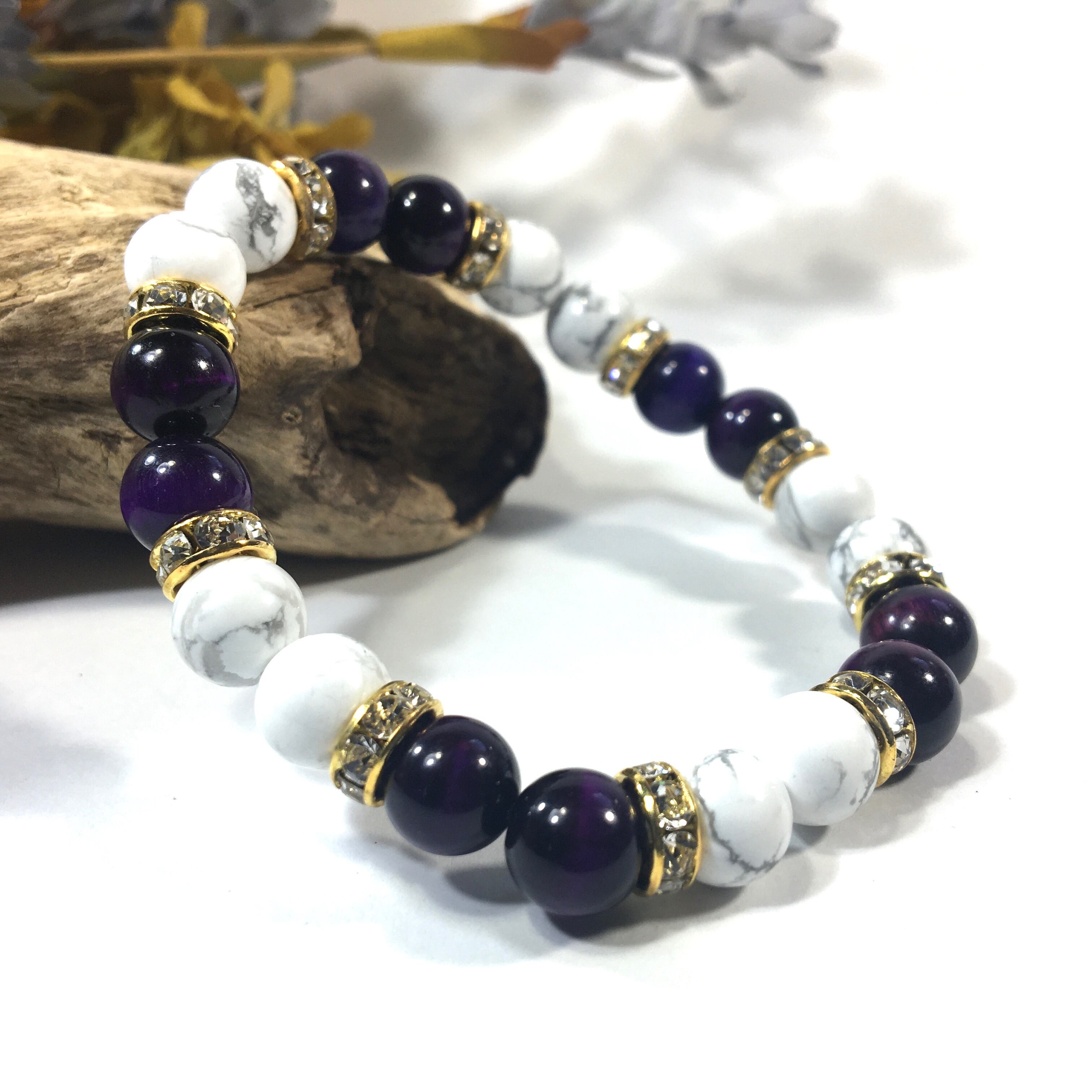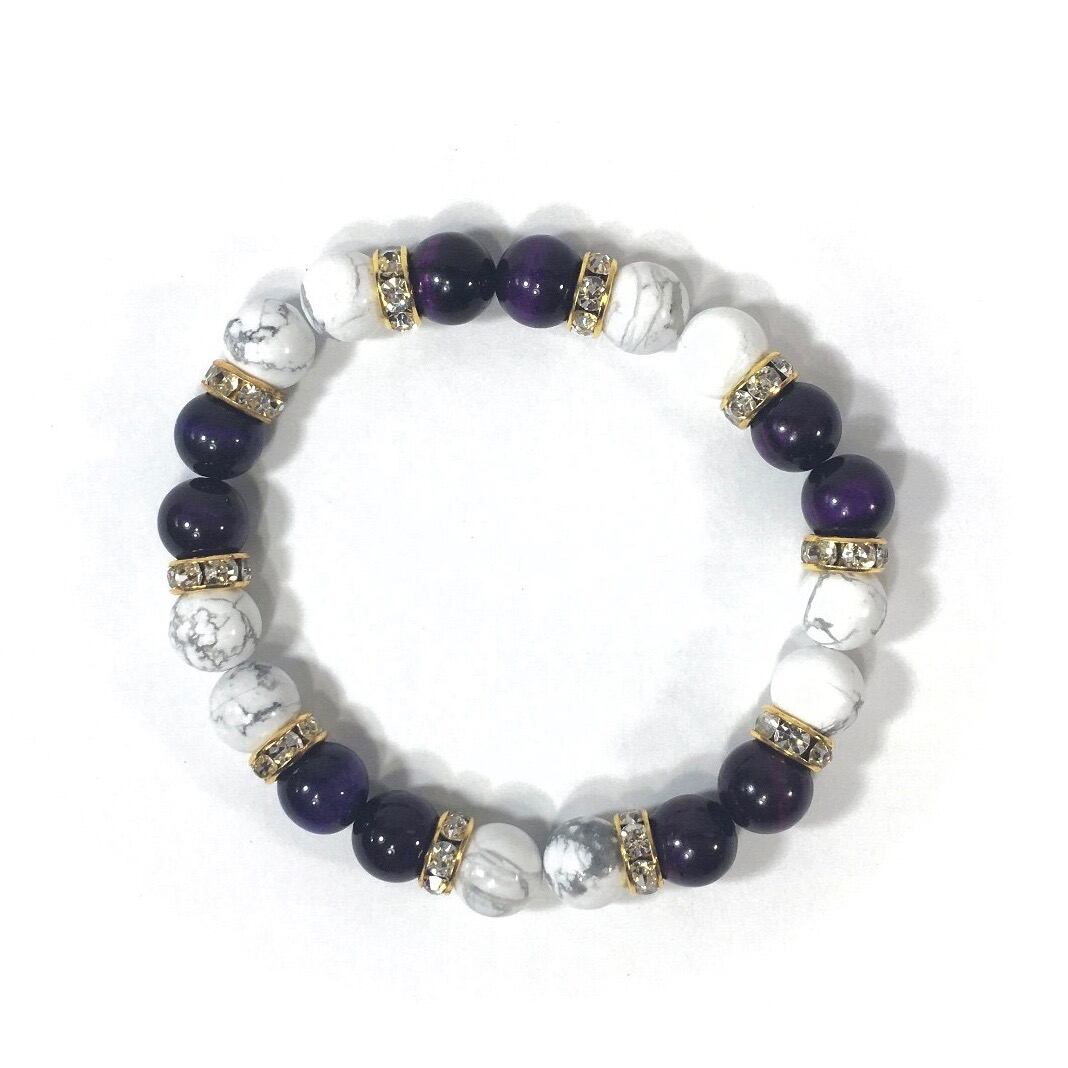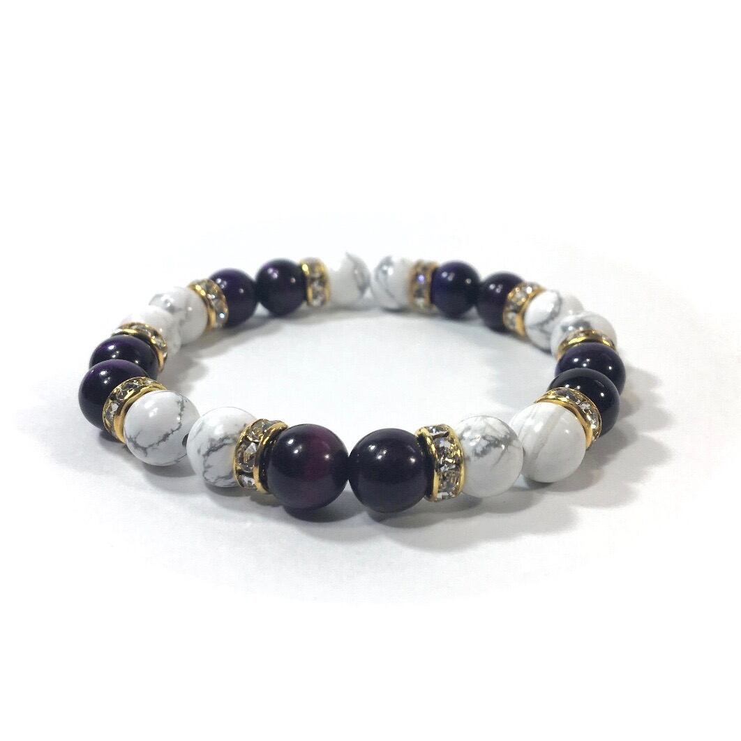 こちらは、8mm玉のハウライトとパープルタイガーアイを使ったパワーストーンブレスレットです。シンプルなデザインでどんなコーディネートにも合わせやすいデザインに仕上げています。サイズは内周約15cmです。気になる方は是非この機会にどうぞ。