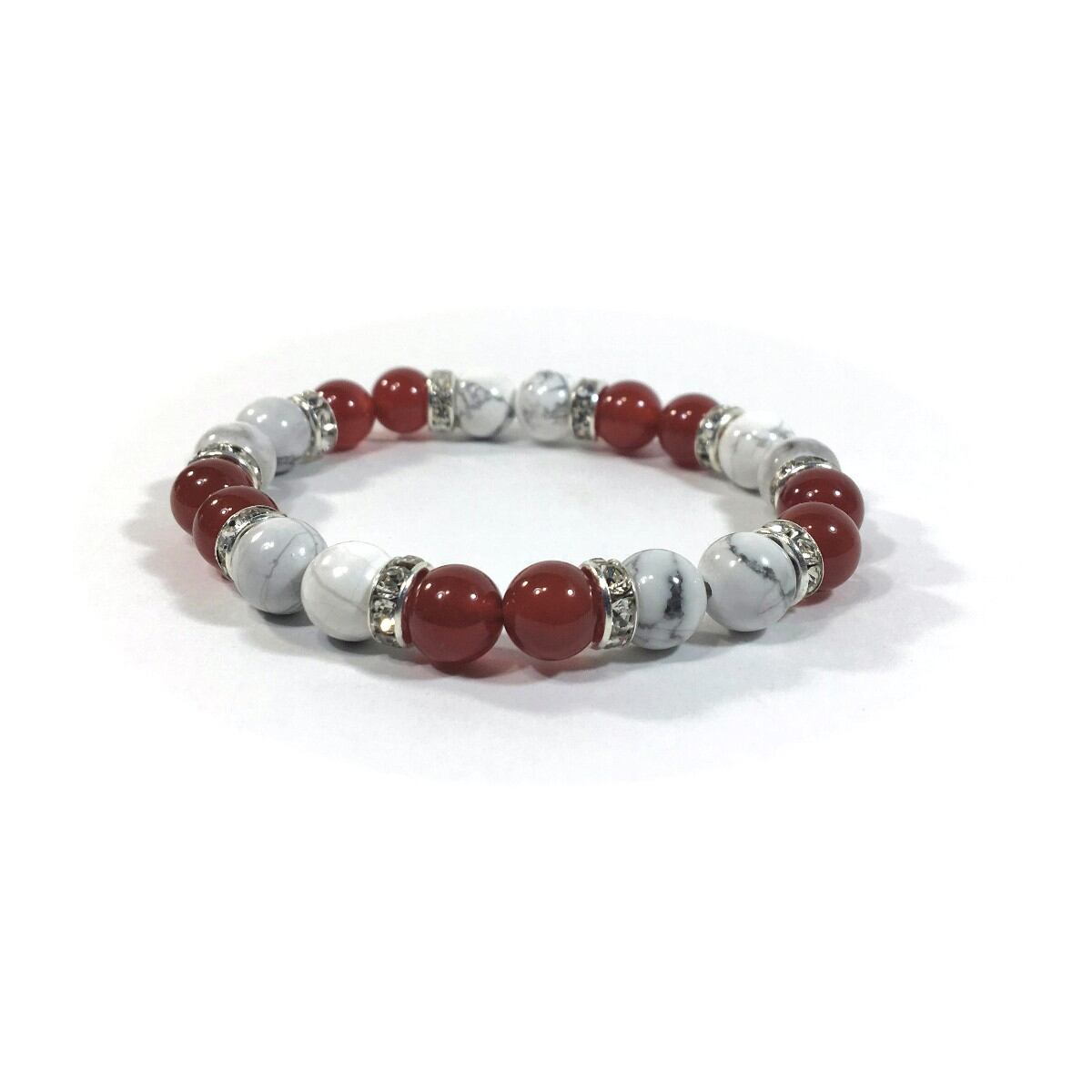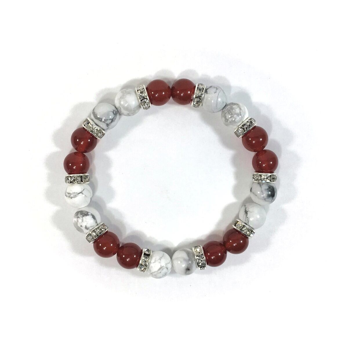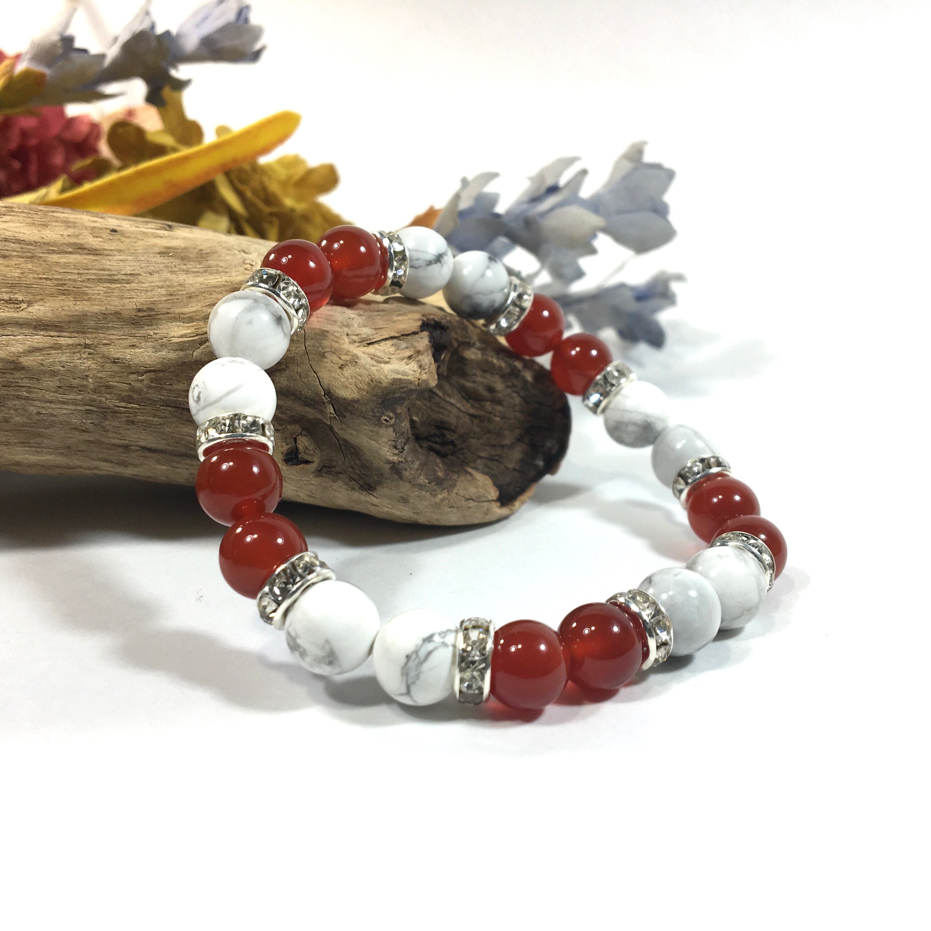 こちらは、8mm玉のハウライトと赤瑪瑙を使ったパワーストーンブレスレットです。シンプルなデザインでどんなコーディネートにも合わせやすいデザインに仕上げています。サイズは内周約15cmです。気になる方は是非この機会にどうぞ。