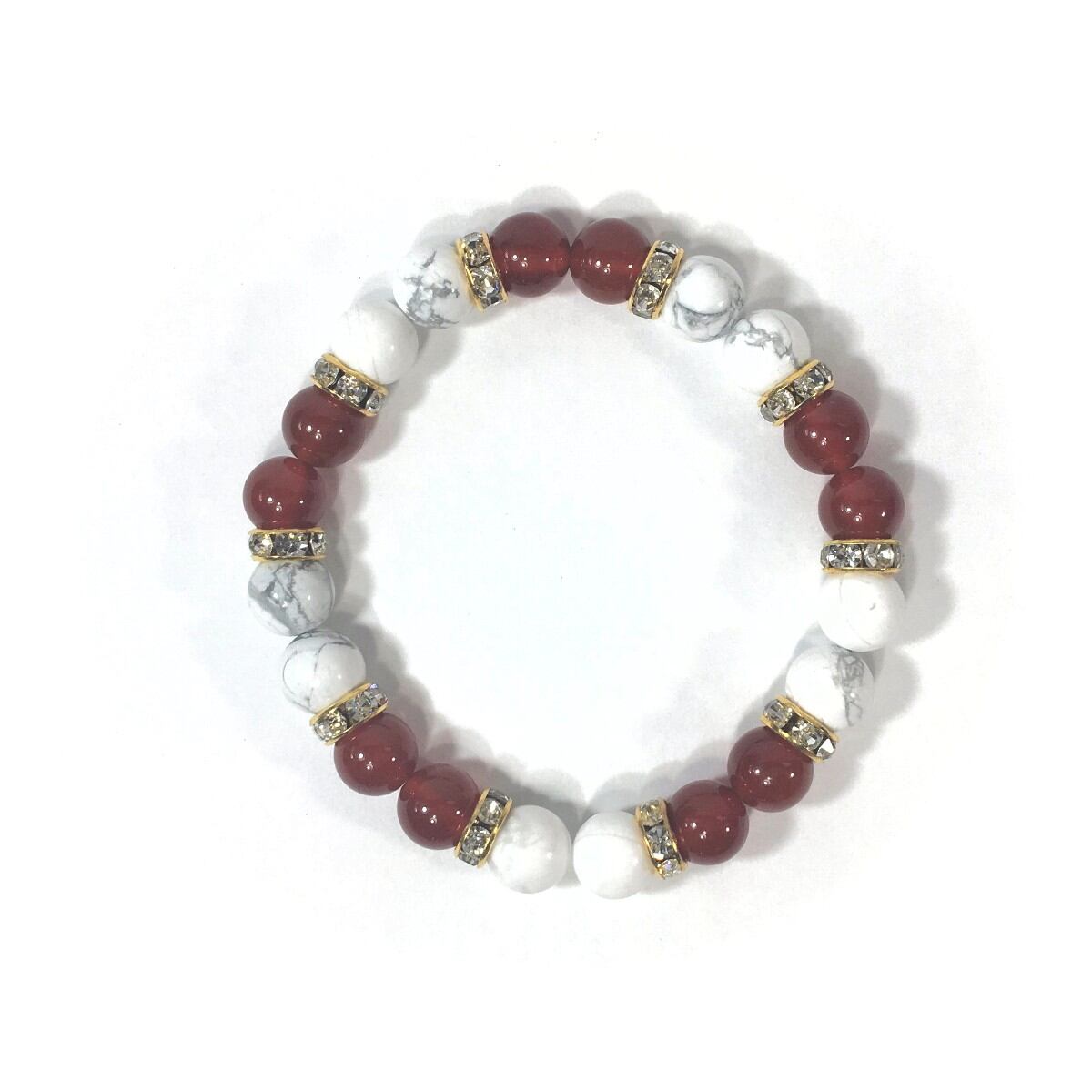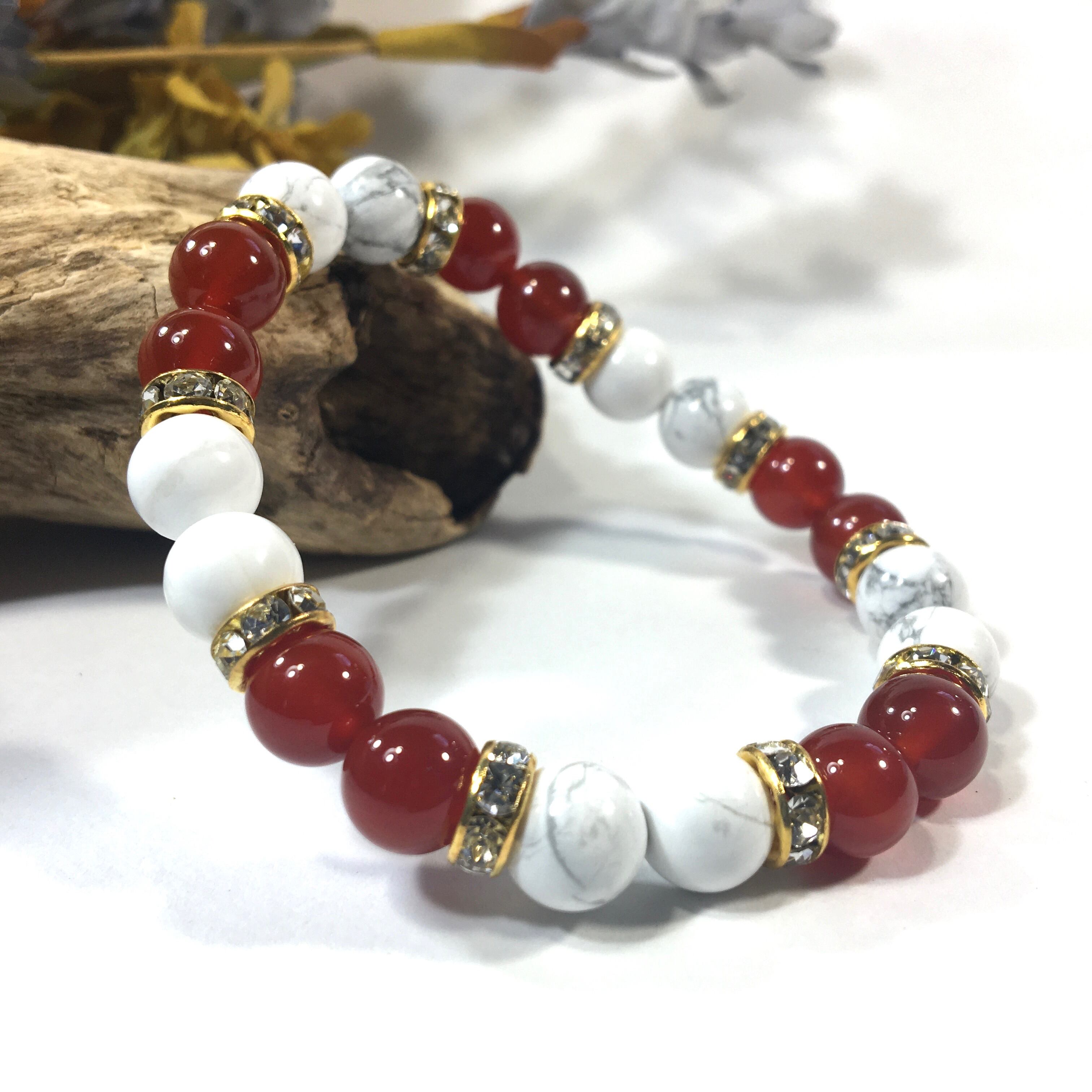 こちらは、8mm玉のハウライトと赤瑪瑙を使ったパワーストーンブレスレットです。シンプルなデザインでどんなコーディネートにも合わせやすいデザインに仕上げています。サイズは内周約15cmです。気になる方は是非この機会にどうぞ。