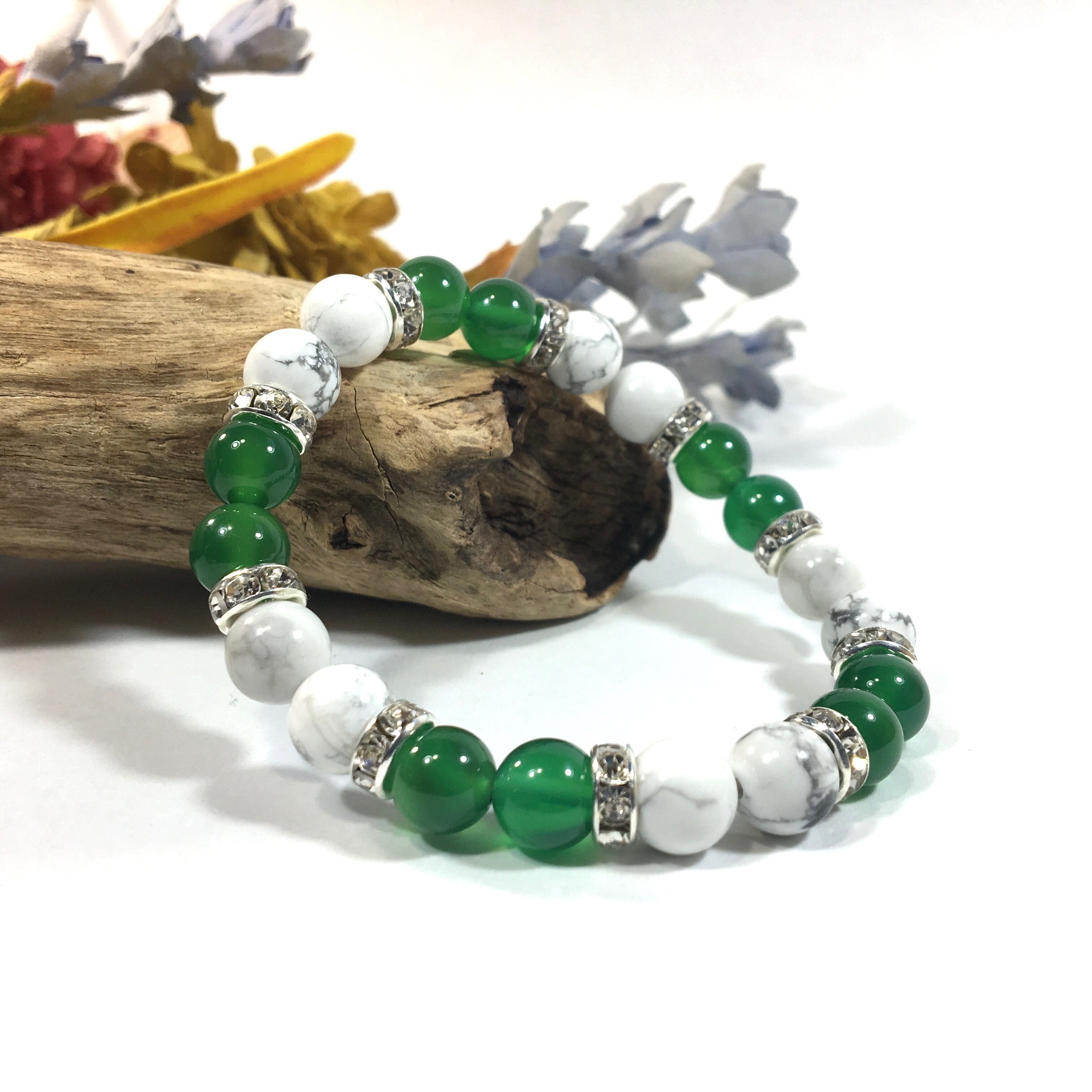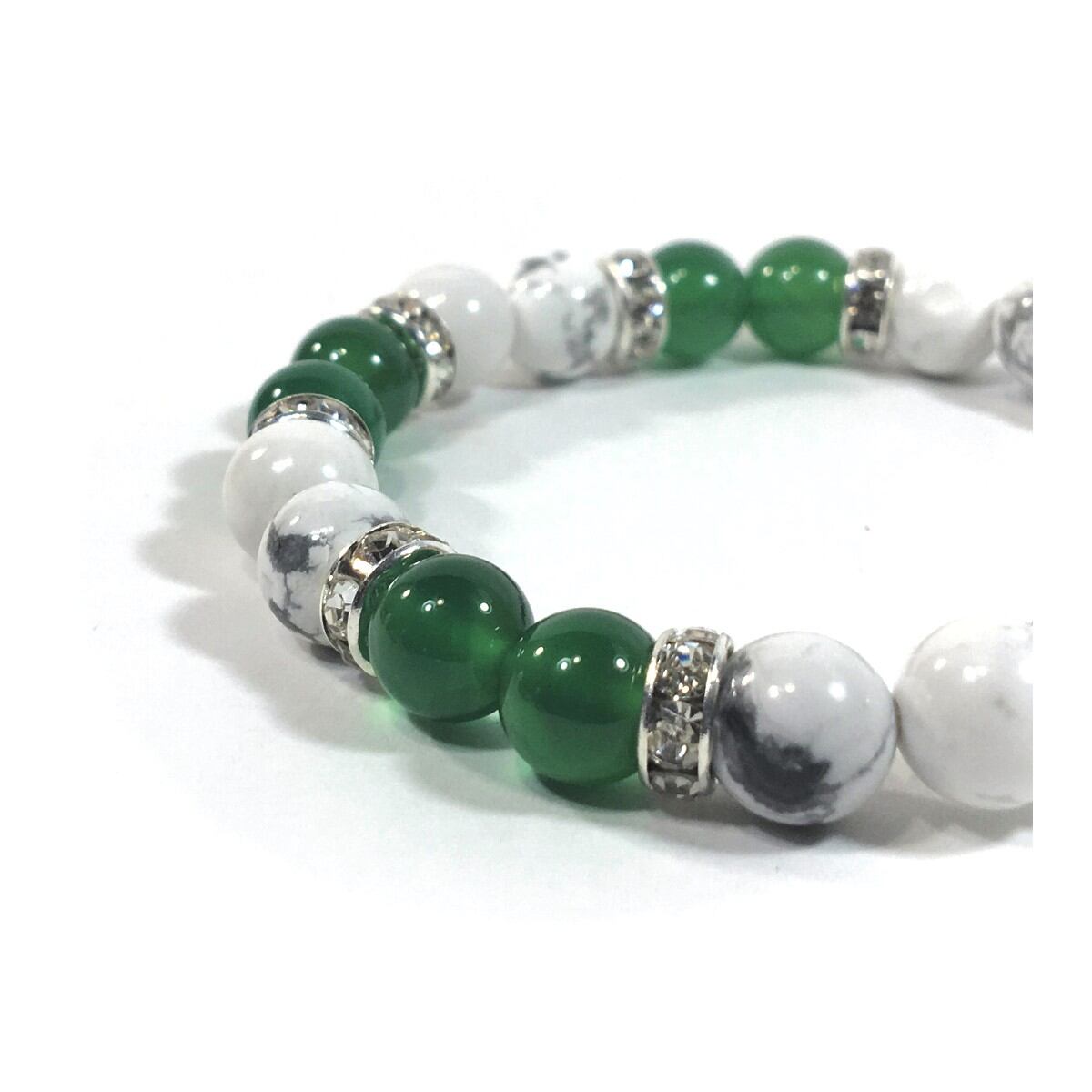 こちらは、8mm玉のハウライトと緑瑪瑙を使ったパワーストーンブレスレットです。シンプルなデザインでどんなコーディネートにも合わせやすいデザインに仕上げています。サイズは内周約15cmです。気になる方は是非この機会にどうぞ。
