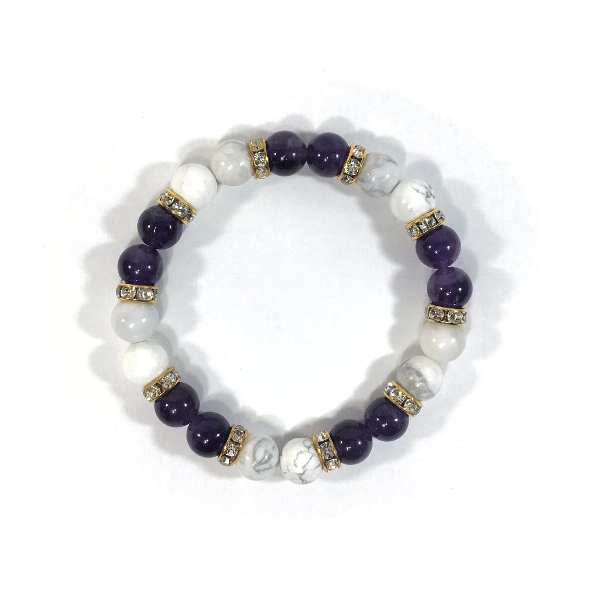 こちらは、8mm玉のハウライトとアメジストを使ったパワーストーンブレスレットです。シンプルなデザインでどんなコーディネートにも合わせやすいデザインに仕上げています。サイズは内周約15cmです。気になる方は是非この機会にどうぞ。
