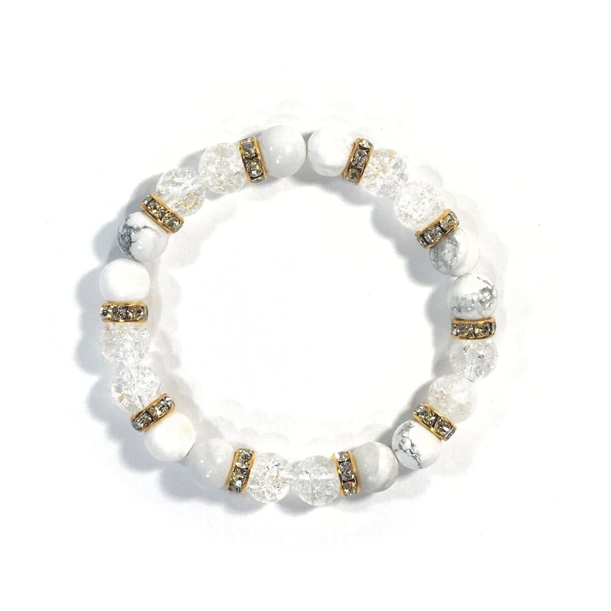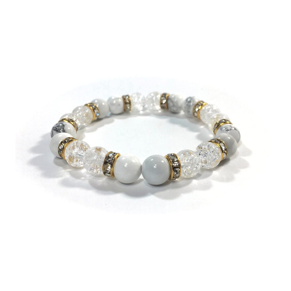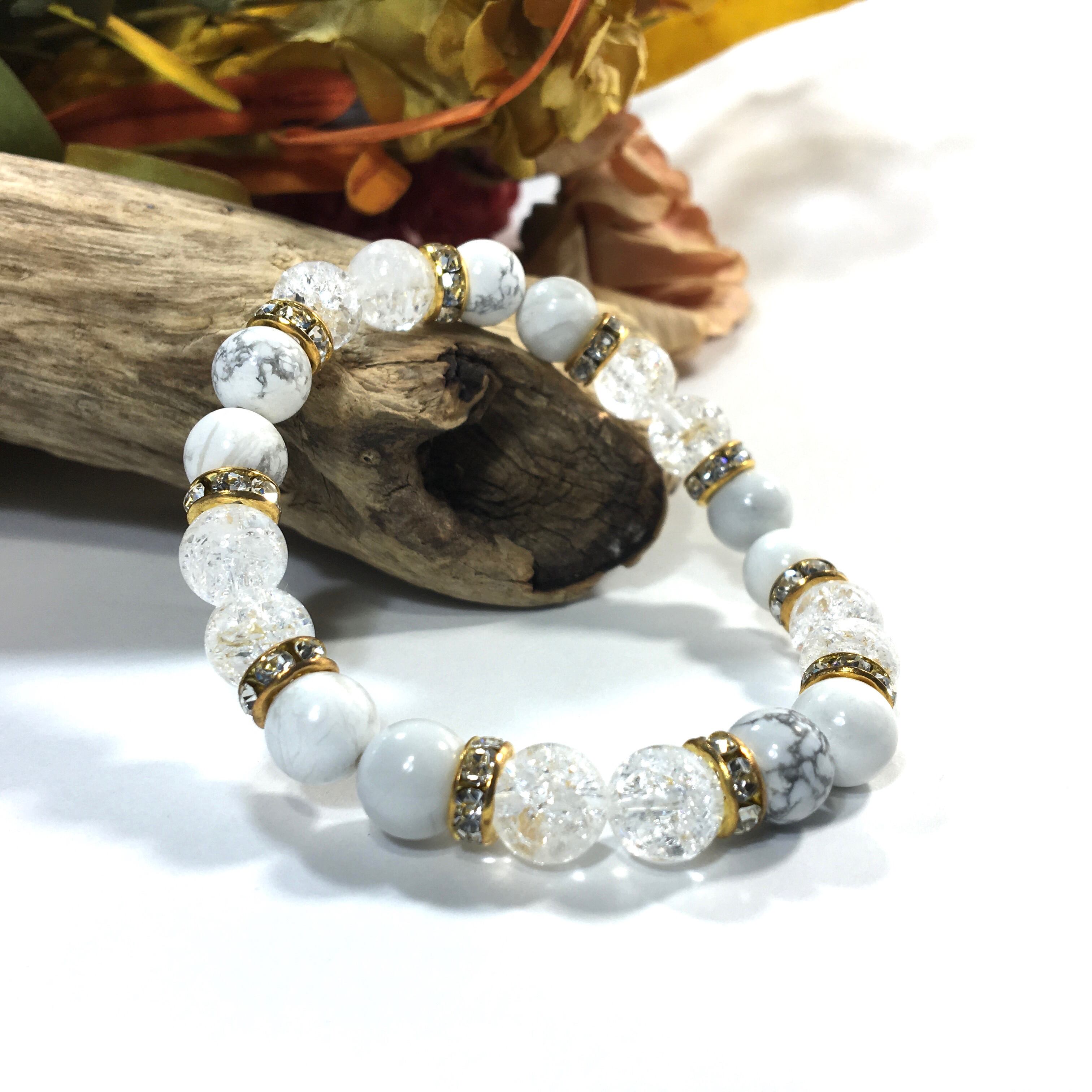 こちらは、8mm玉のハウライトとクラック水晶を使ったパワーストーンブレスレットです。シンプルなデザインでどんなコーディネートにも合わせやすいデザインに仕上げています。サイズは内周約15cmです。気になる方は是非この機会にどうぞ。